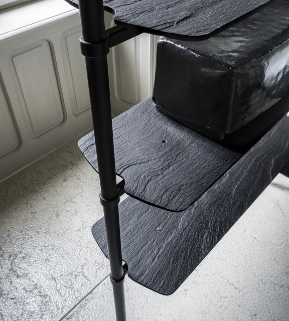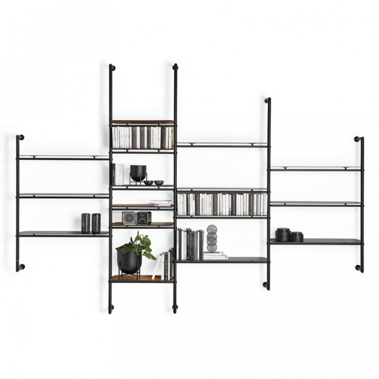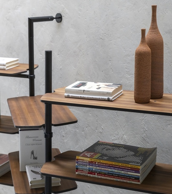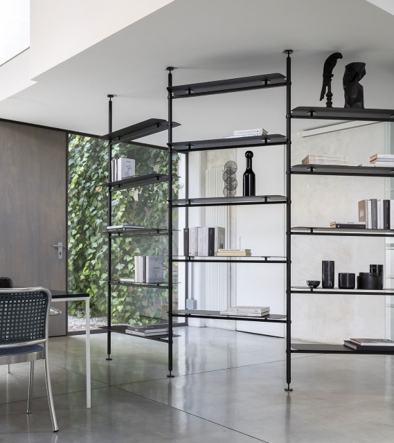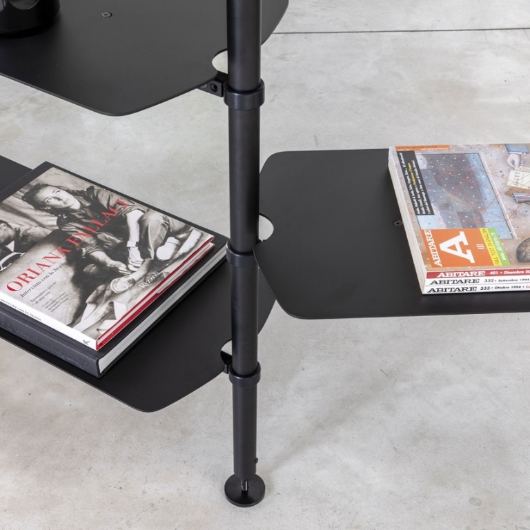 Adelaide è un’etagere con struttura in massello di legno di Iroko oppure in ferro verniciato nero opaco E’ completa di 13 ripiani, predisposta per il fissaggio a soffitto (altezza soffitto da cm 236 a cm 302). E’ una elegante libreria, terra cielo con un piantone girevole a base quadrata al quale sono fissati in maniera asimmetrica sui 4 lati i ripiani di due misure differenti (20x30 cm, 25x30 cm).