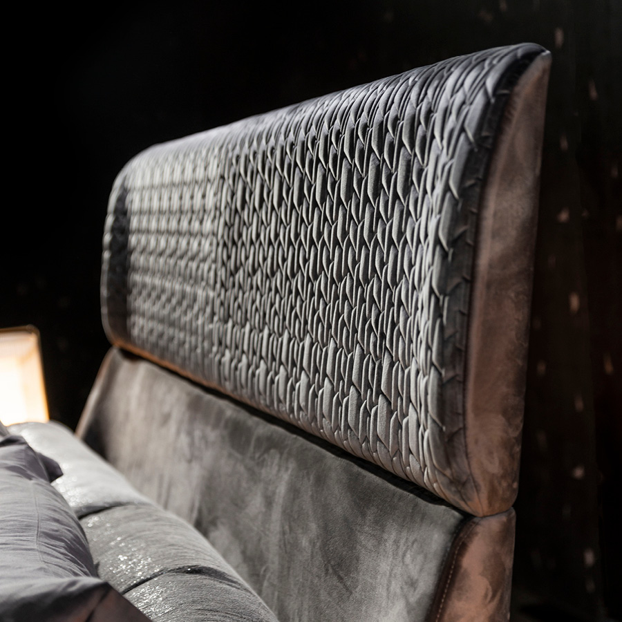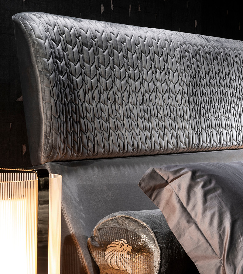 Fully upholstered bed. Quilted headboard top with base in light gold chrome stainless steel with Giorgio Collection logo.