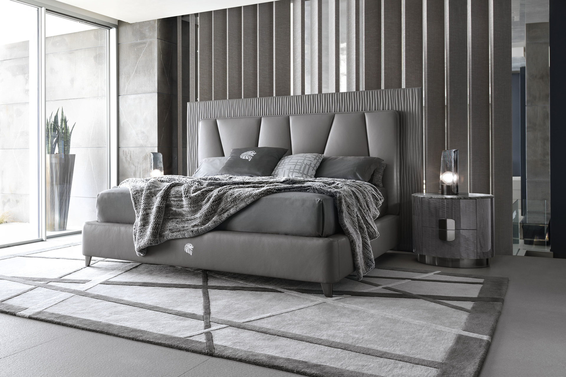 Fully upholstered bed in fìrst grade leather, nubuk leather, lizard printed leather, velvet or suede fabric. Footboard with Giorgio Collection logo. Quilted headboard. Legs in satin black nickel stainless steel.