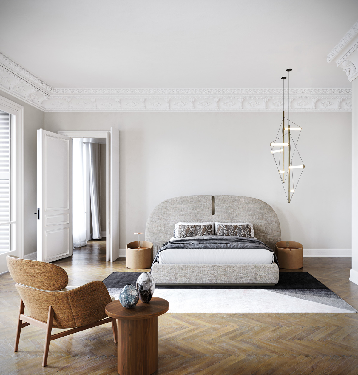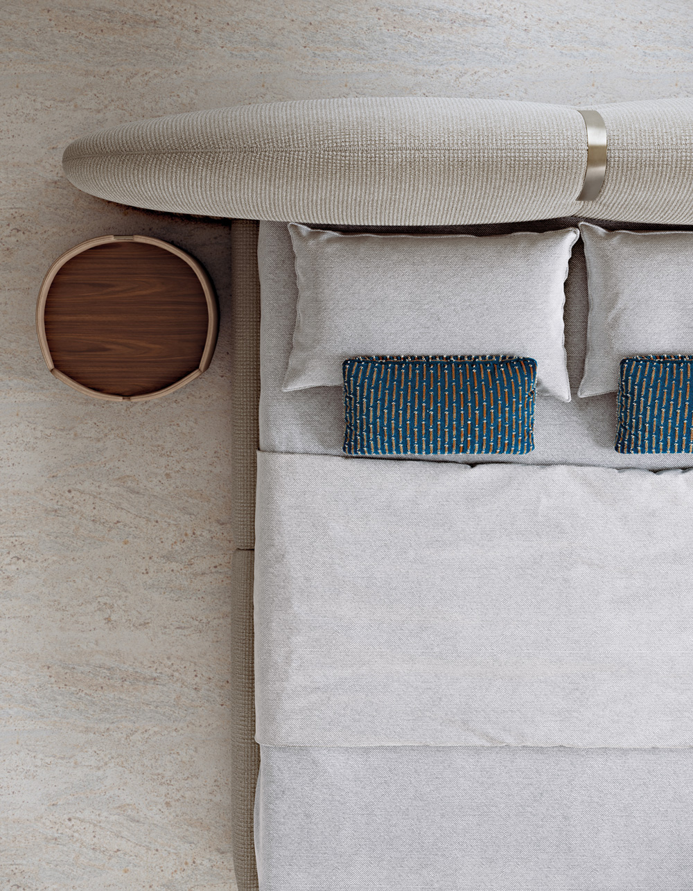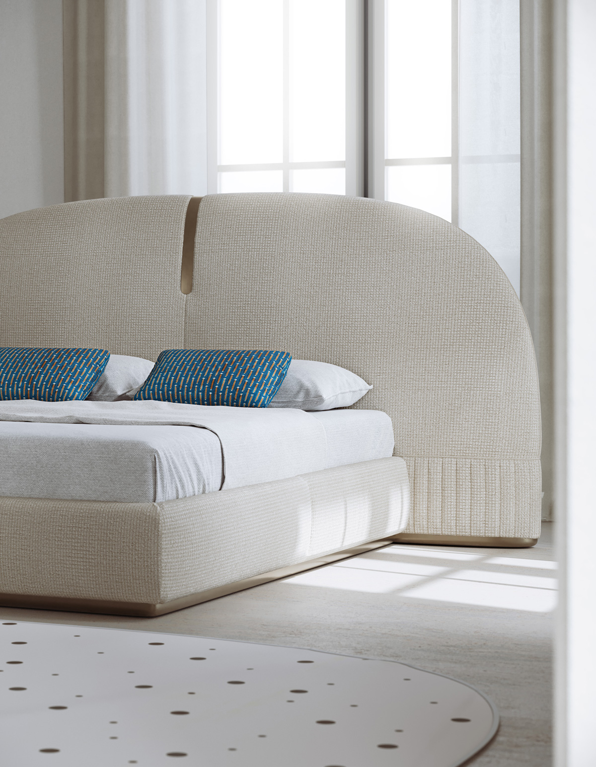 Progettato da BoattoMartino Studio, il letto Suite nasce dal desiderio di creare un prodotto armonioso con forme morbide e contemporanee, unendo linee semplici a dettagli di qualità sartoriale. La testata si distingue per l’accezione scultorea, ma raffinata e morbida, in cui si unisce pelle liscia e cannettata con ottone prezioso.