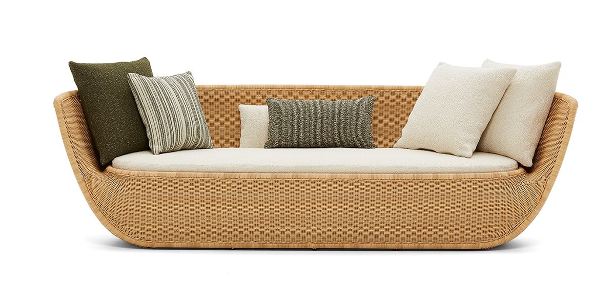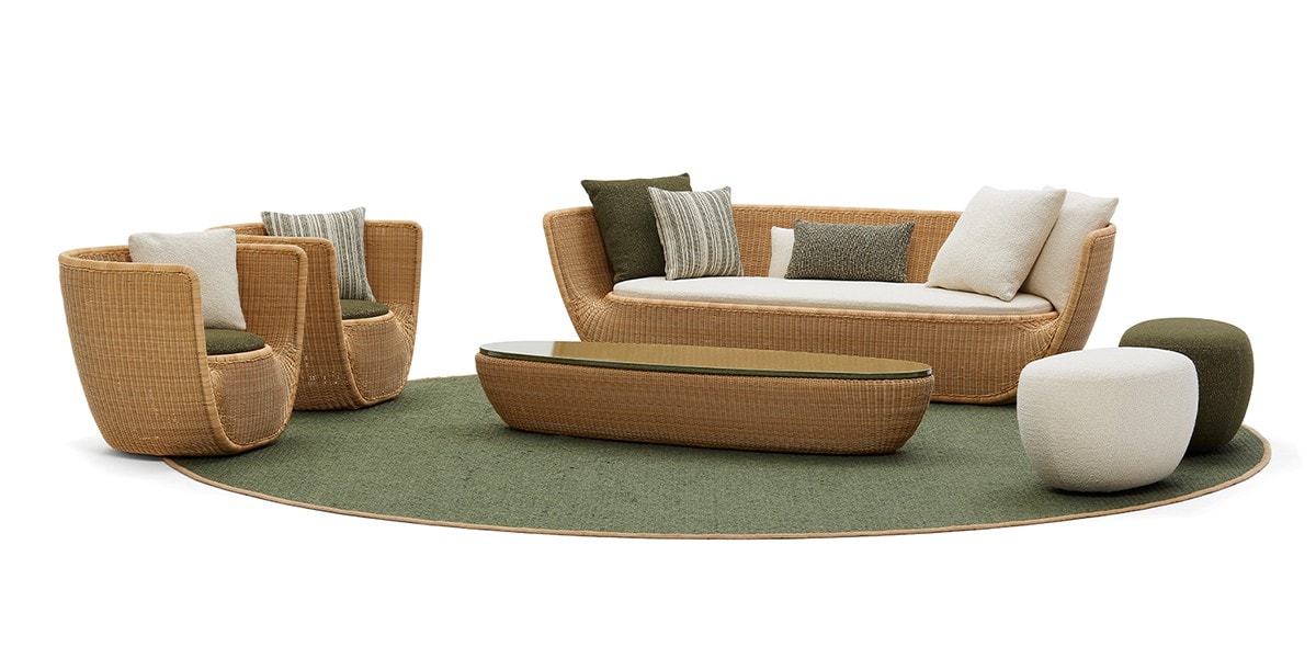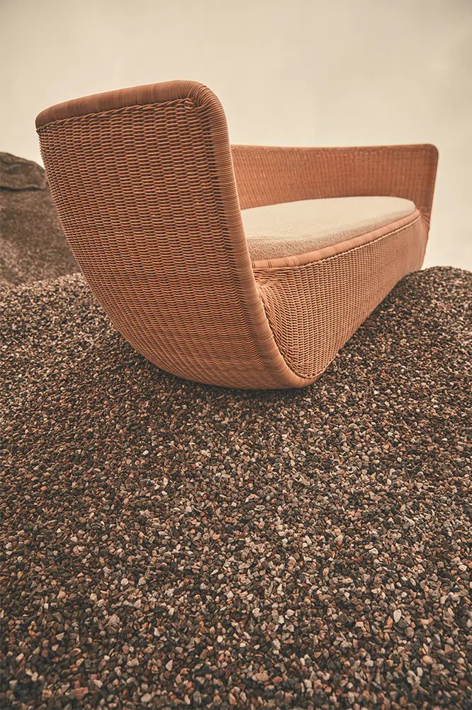 Reminiscent of sunny summer afternoons and the slow passing of time. Afternoons is an outdoor lounge set featuring an armchair, sofa, bench and oval coffee table with a choice of top in Pietra Lavica Smaltata, Pietra Bianco or Grigio Pece. Supported by an outdoor painted aluminium frame upholstered with natural-coloured, hand-woven PVC, the chair collection is padded with cushions in quick-drying polyurethane foam that fit perfectly into the silhouette. The collection is completed by a pouffe with Polimex and polyurethane frame and upholstered with a water-repellent cloth.