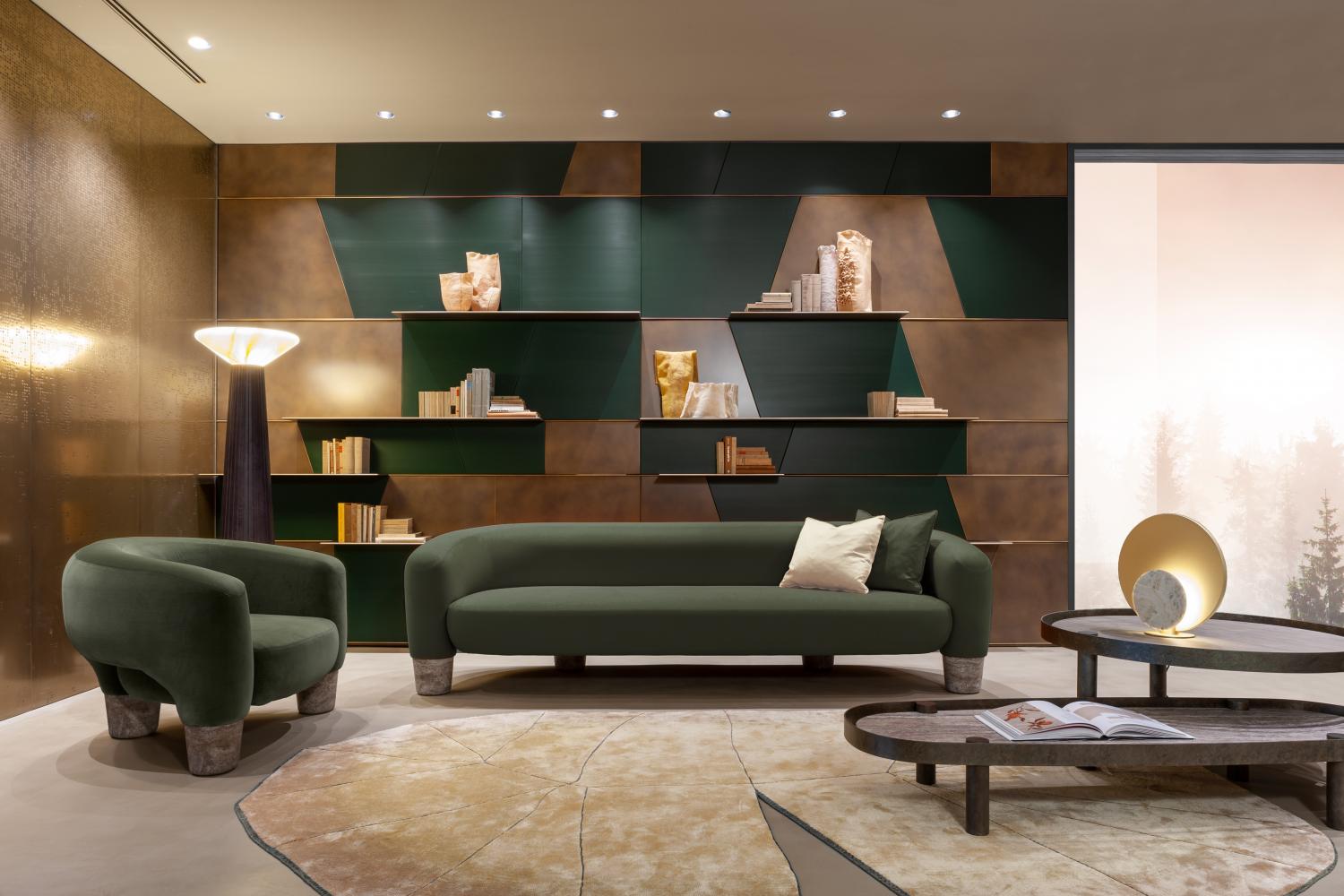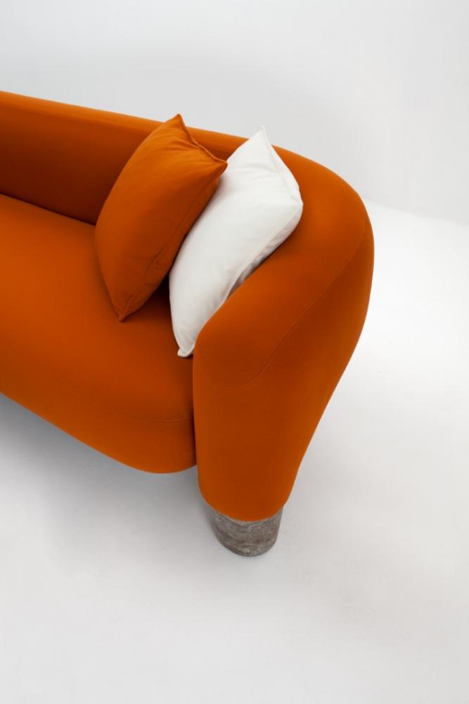 Upholstered sofa covered in leather, velvet or fabric, featuring four sturdy legs in solid marble or in solid wood.