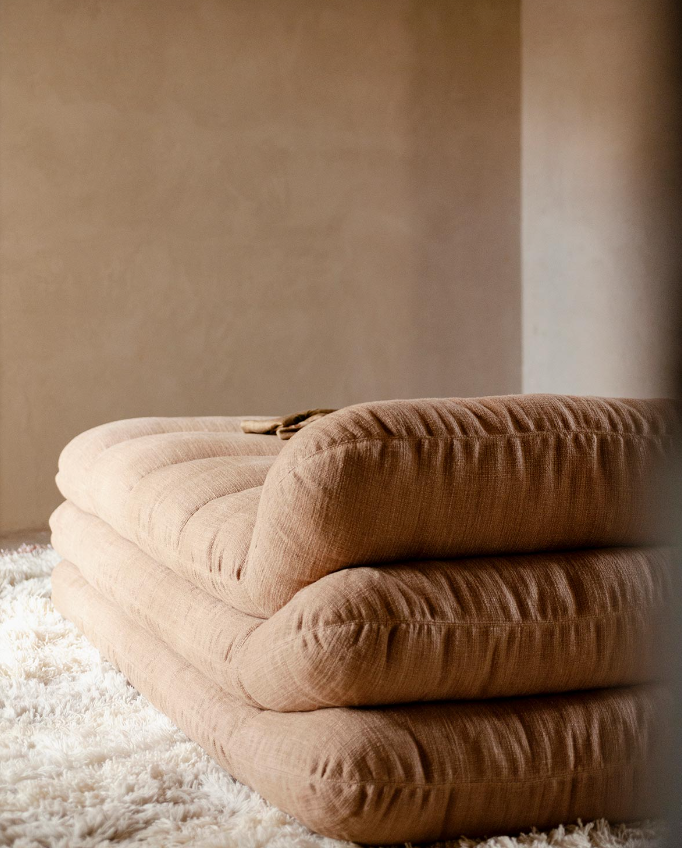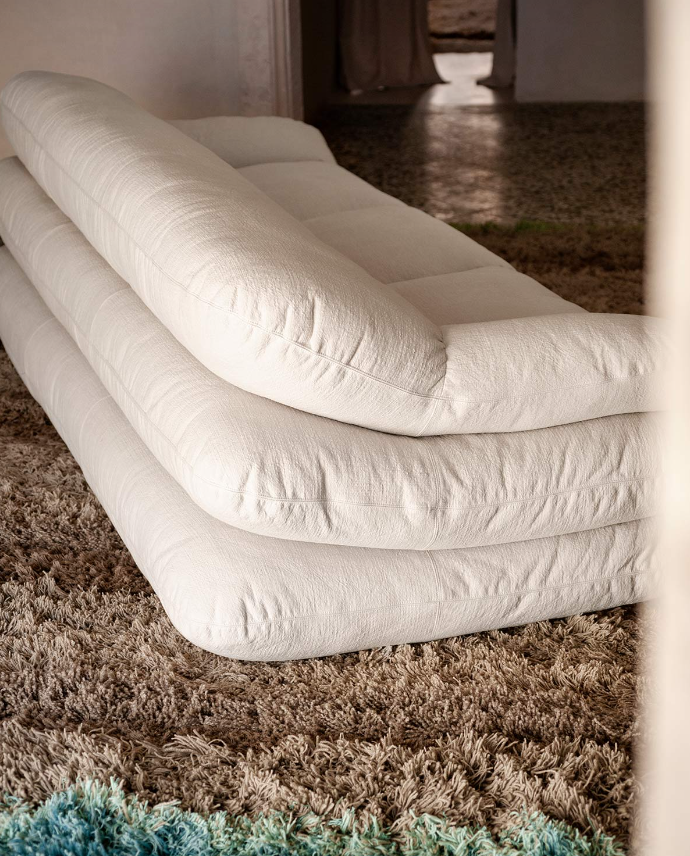 Calm and sophisticated manifesto of contemporary style, Solar sits at the heart of Toogood’s Cosmic collection. An upholstered sofa that at first glance appears as a stack of cushions. With its unmistakable blend of ingenuity and style, Faye Toogood invites relaxation upon these quilted piles. Solar merges sculptural forms and softness, offering a fresh interpretation of Tacchini’s iconic upholstery. The fabric intentionally crinkles, giving the seating a generous push. Solar boasts a relaxed aesthetic embodying the casual elegance of Faye Toogood’s studio. Its soft tactility sets it apart among Tacchini’s range of bold and captivating furniture.