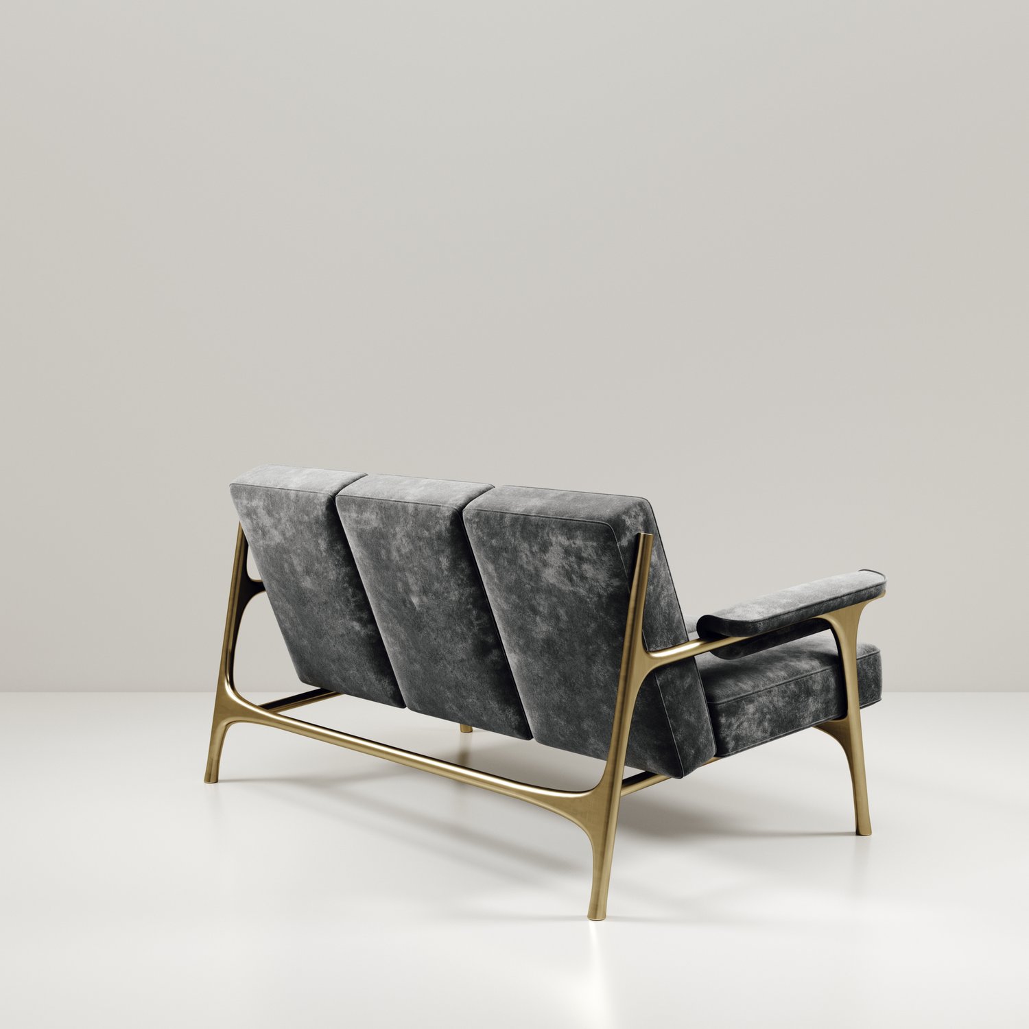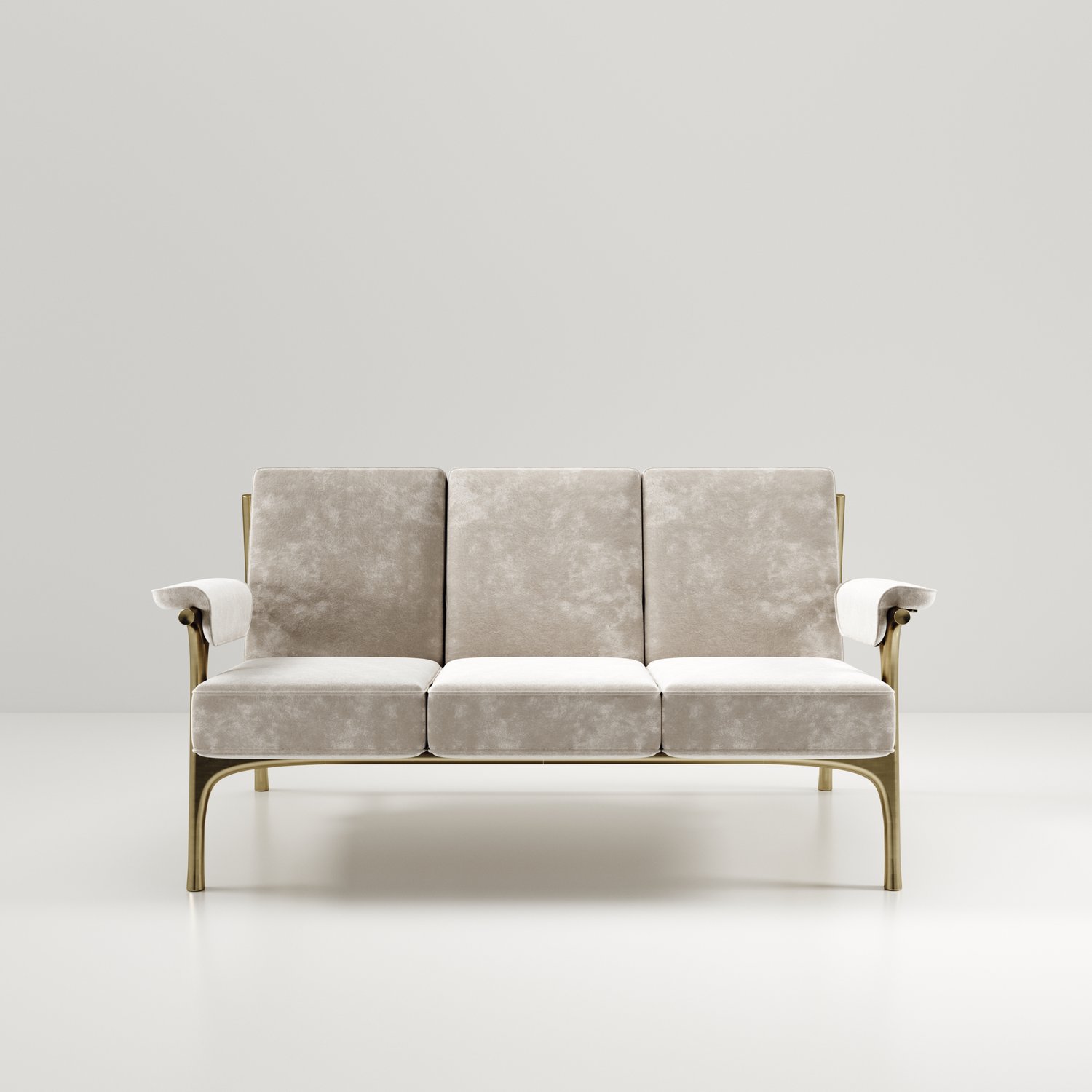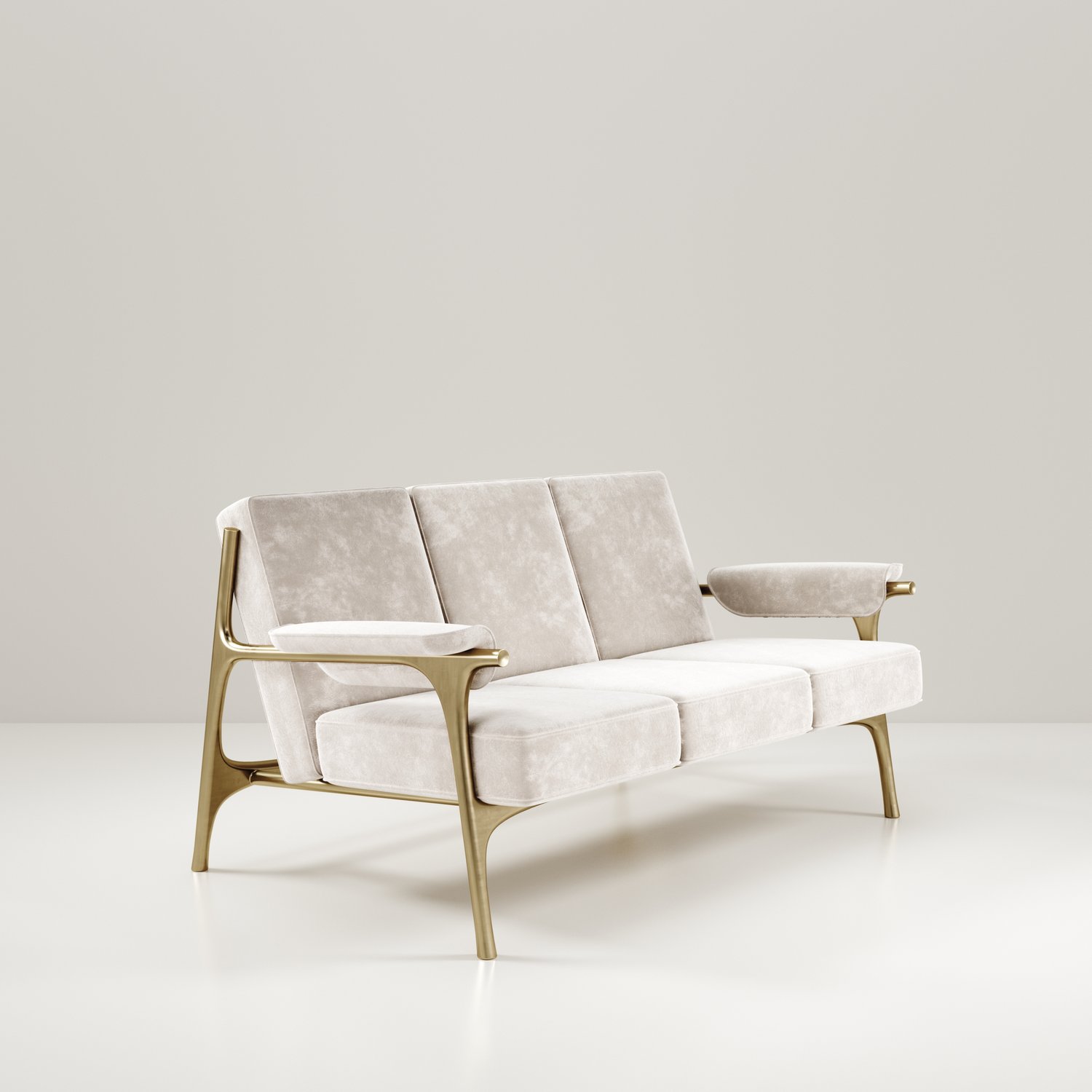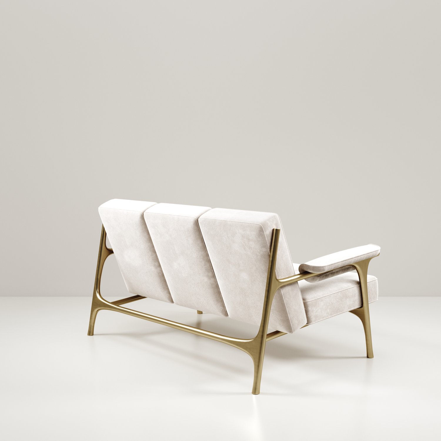 The Ramo sofa by R & Y Augousti is an elegant and versatile piece. The upholstered pieces provide comfort while retaining a unique aesthetic with the bronze-patina brass frame and details. This listing is priced for cream velvet, see other listings for pricing of COM fabric supply. Part of the Ramo seating series.