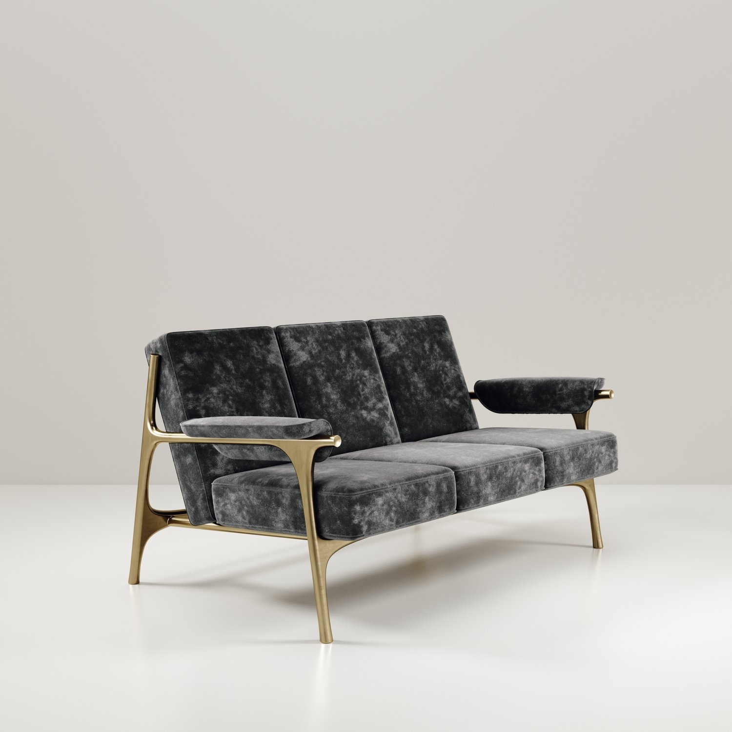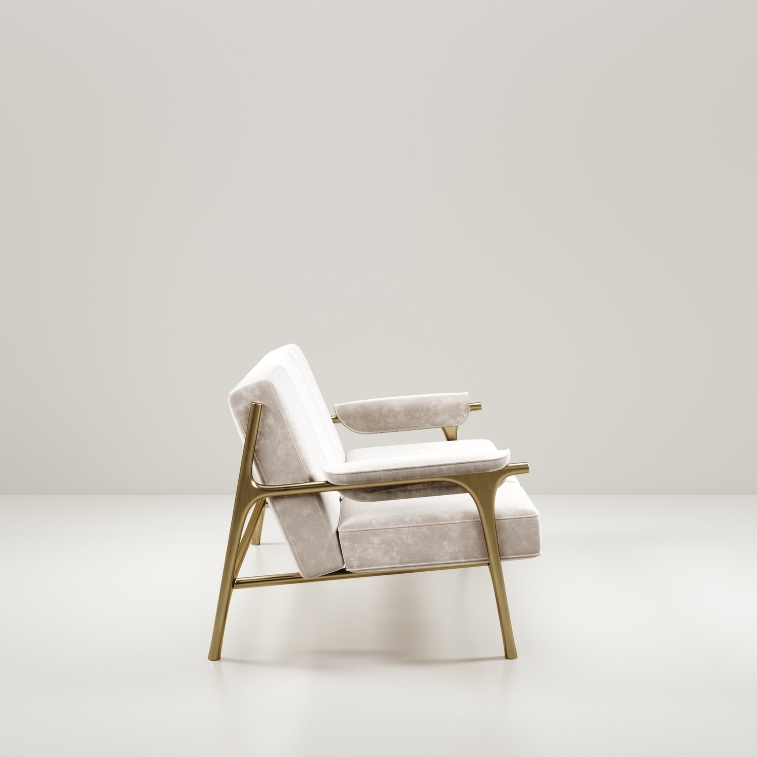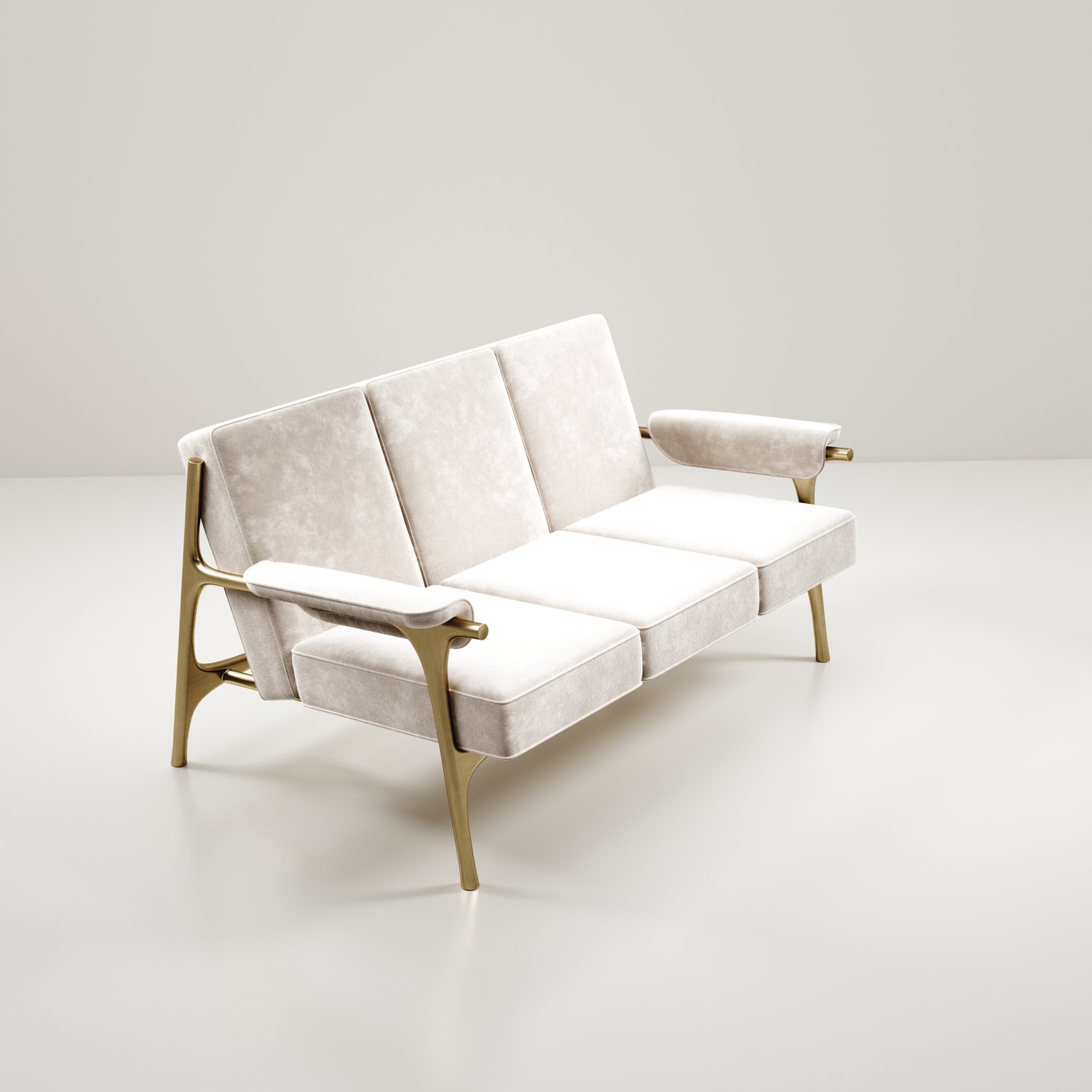 The Ramo sofa by R & Y Augousti is an elegant and versatile piece. The upholstered pieces provide comfort while retaining a unique aesthetic with the bronze-patina brass frame and details. This listing is priced for cream velvet, see other listings for pricing of COM fabric supply. Part of the Ramo seating series.