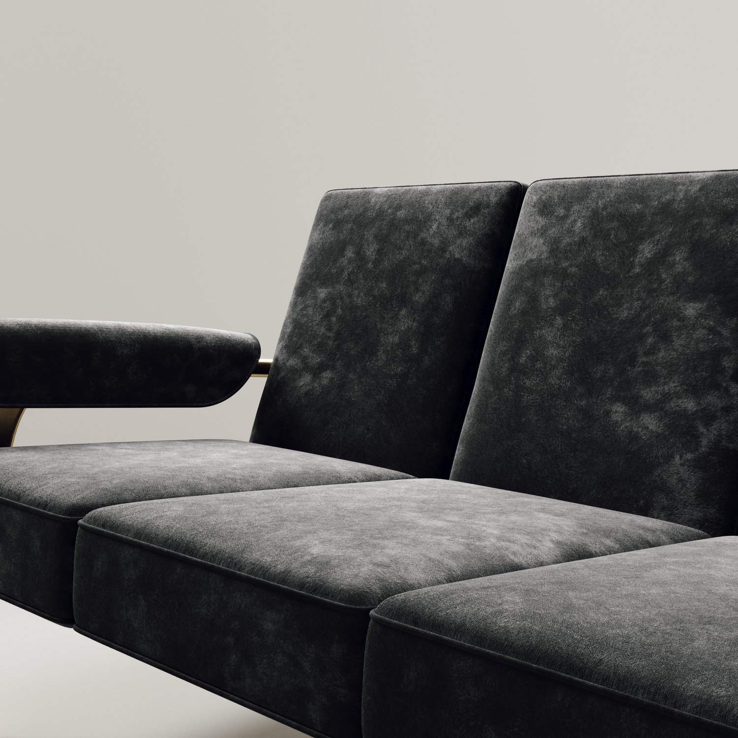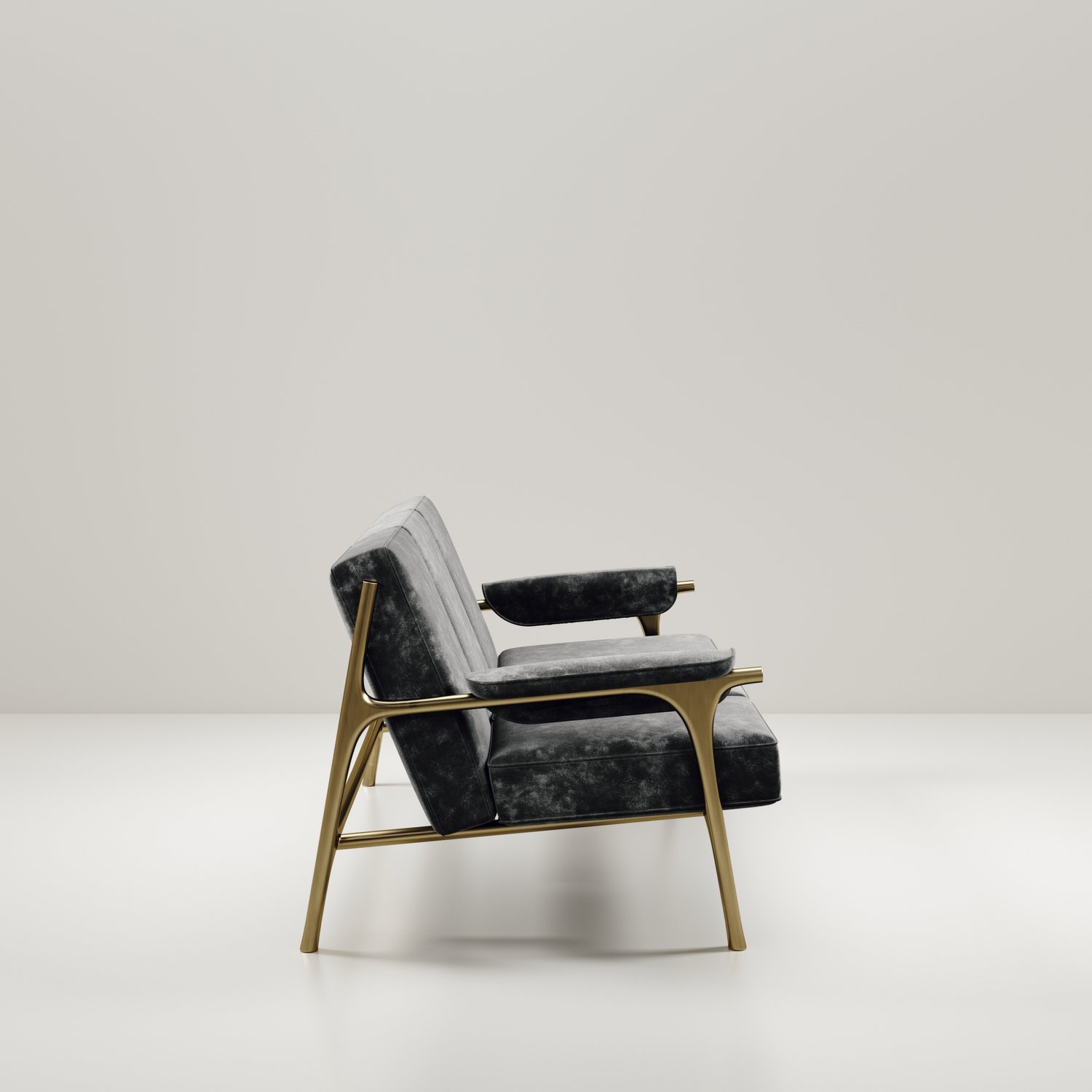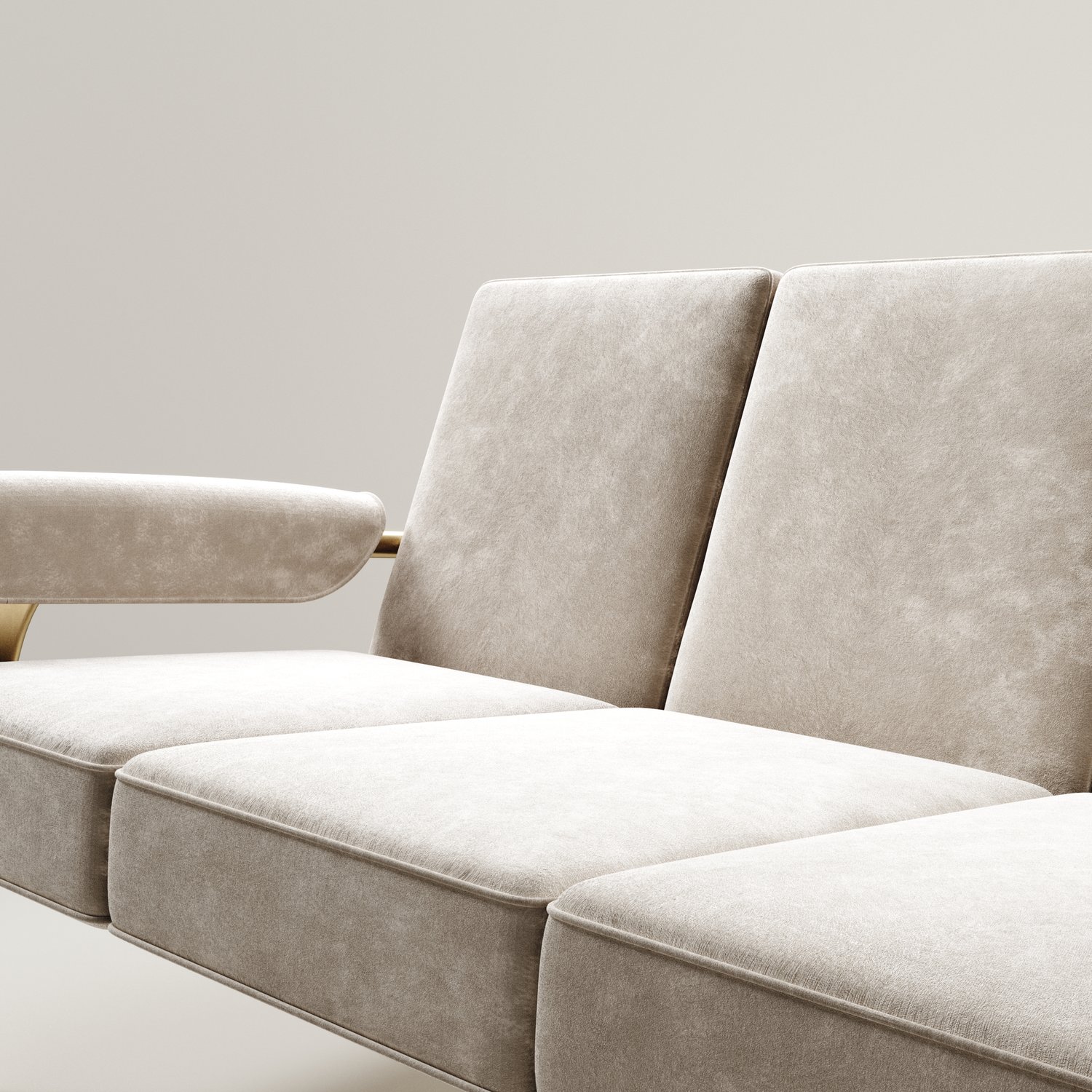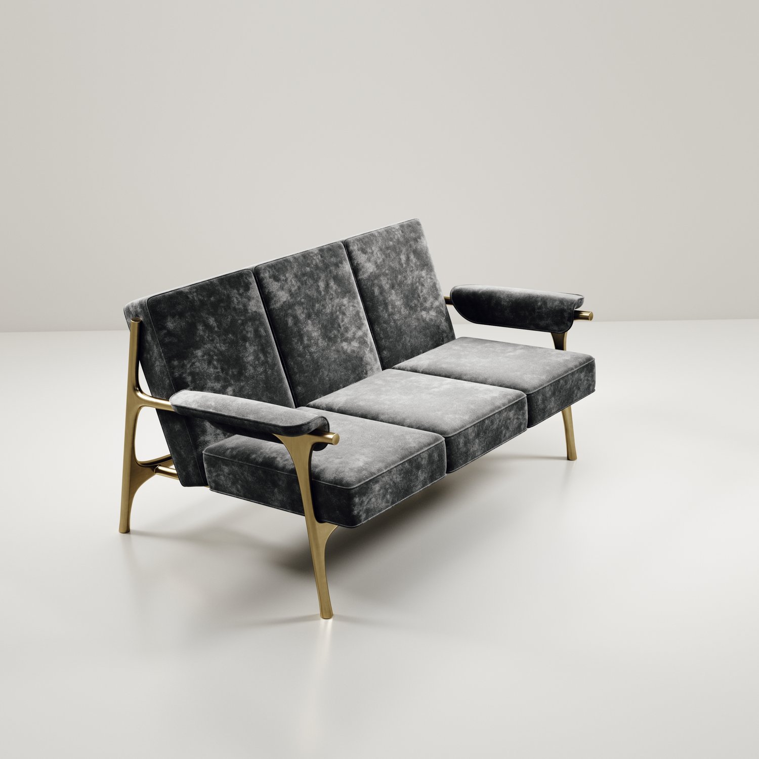 The Ramo sofa by R & Y Augousti is an elegant and versatile piece. The upholstered pieces provide comfort while retaining a unique aesthetic with the bronze-patina brass frame and details. This listing is priced for cream velvet, see other listings for pricing of COM fabric supply. Part of the Ramo seating series.
