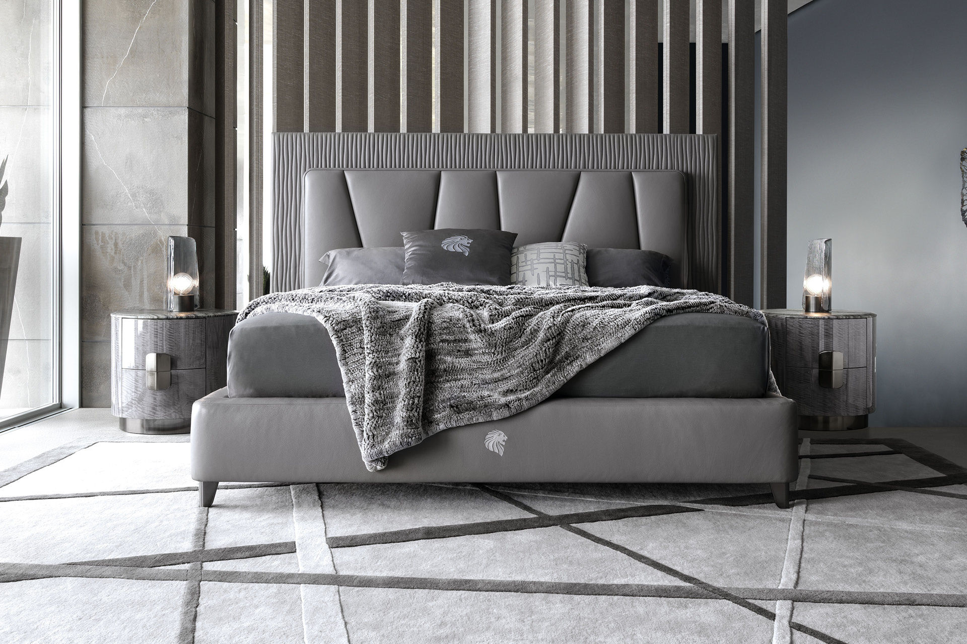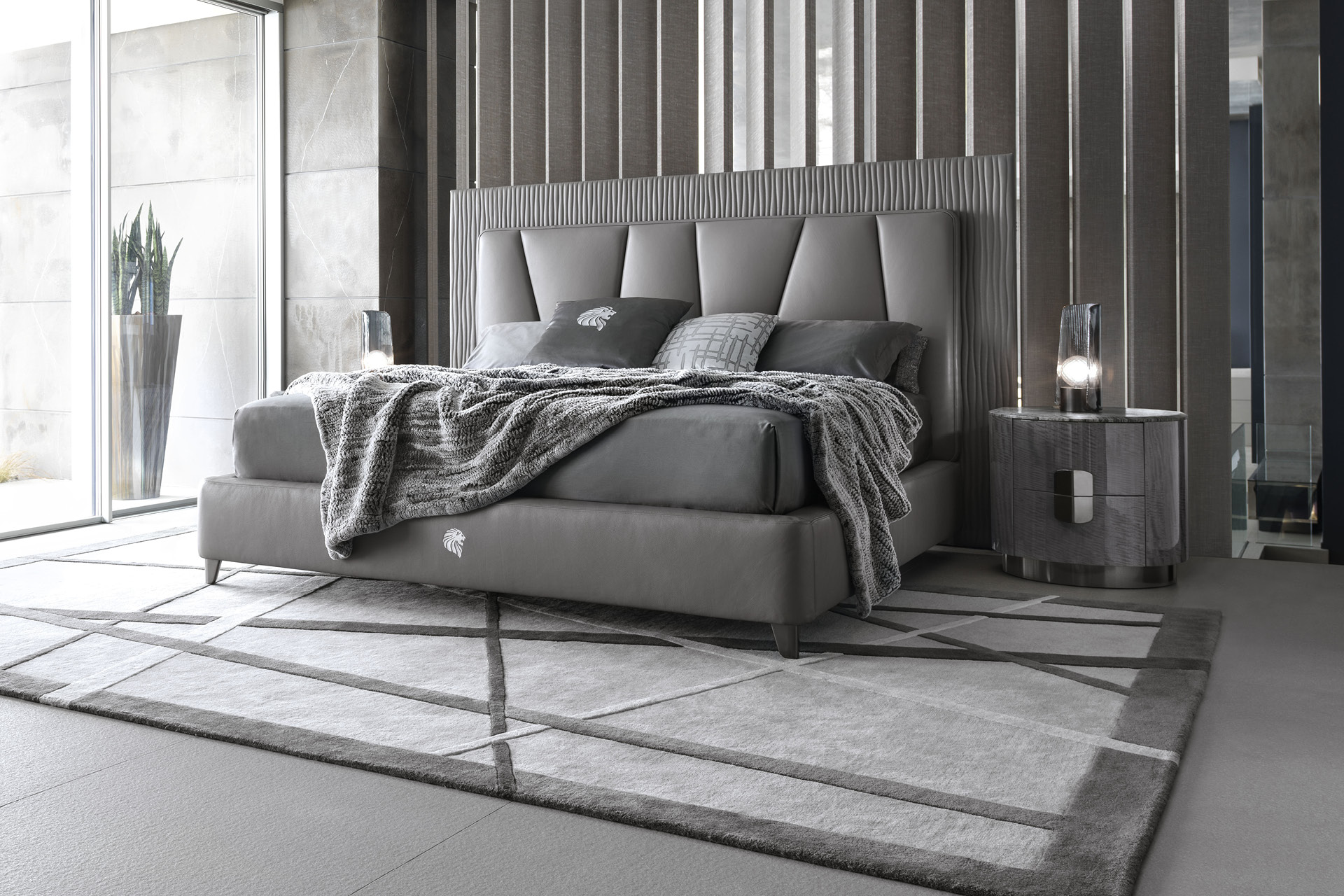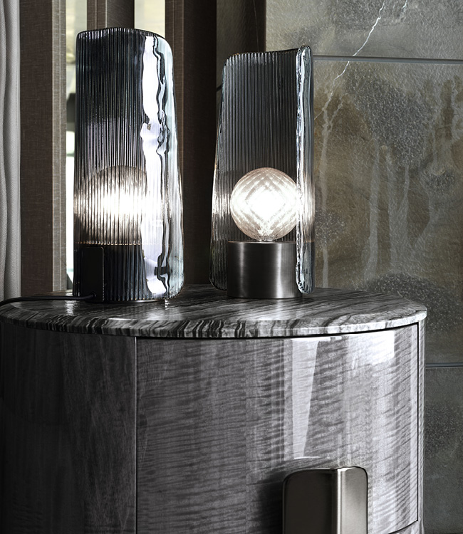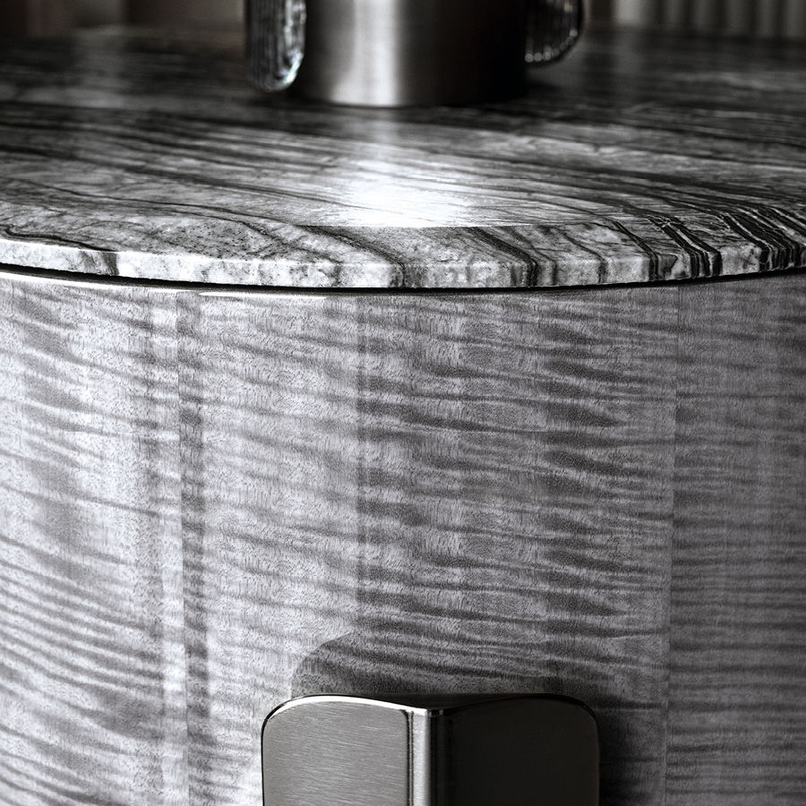 Round Night table in Madagascar figured Mowinghi veneer in high gloss polyester finish. Top in Kenya Black marble. Base and handles in satin black nickel stainless steel. 2 full extension drawers with bottom part in velvet fabric.