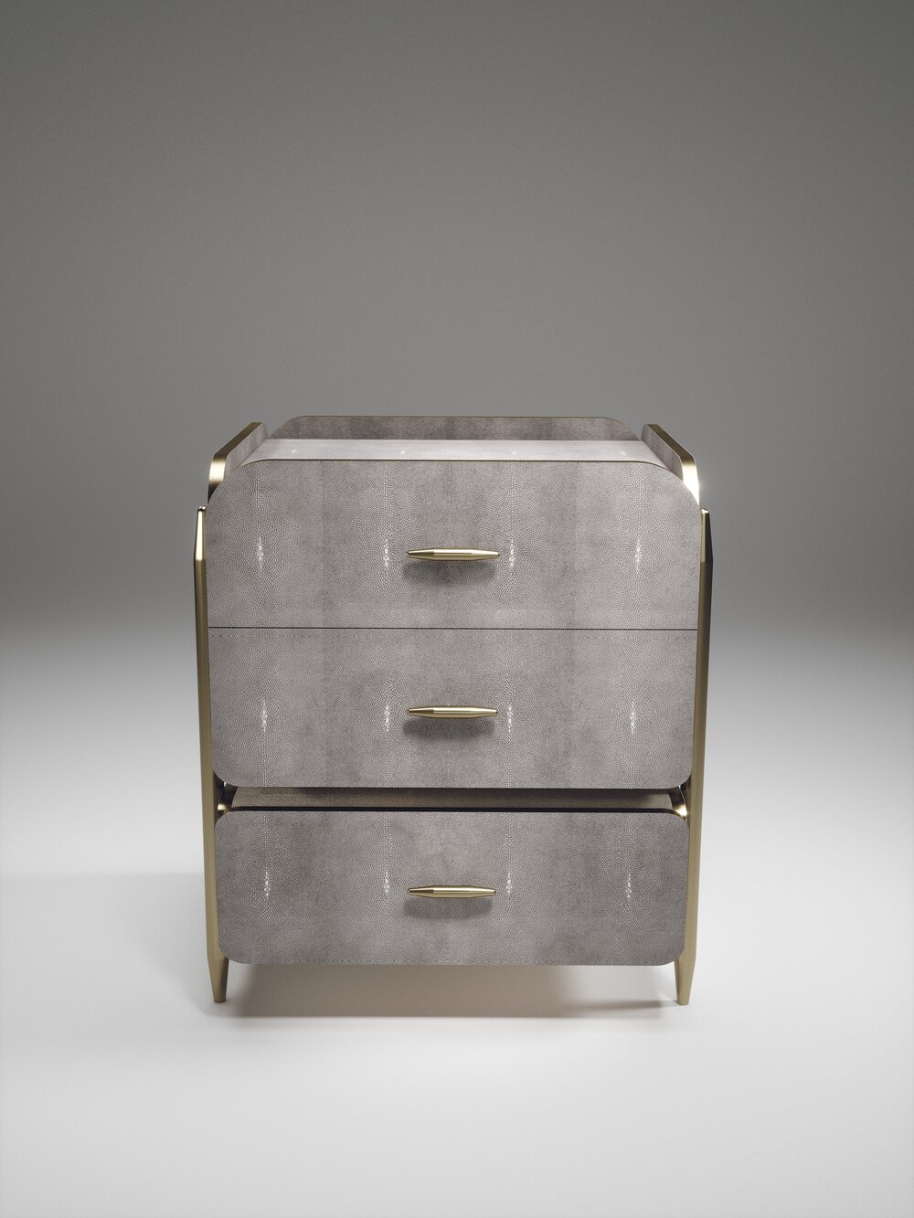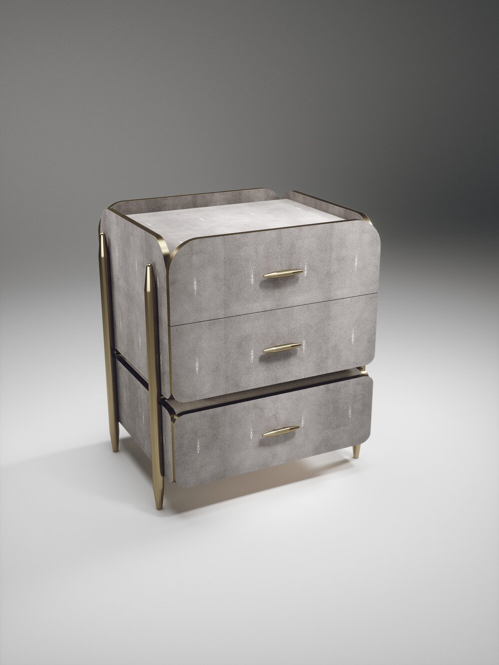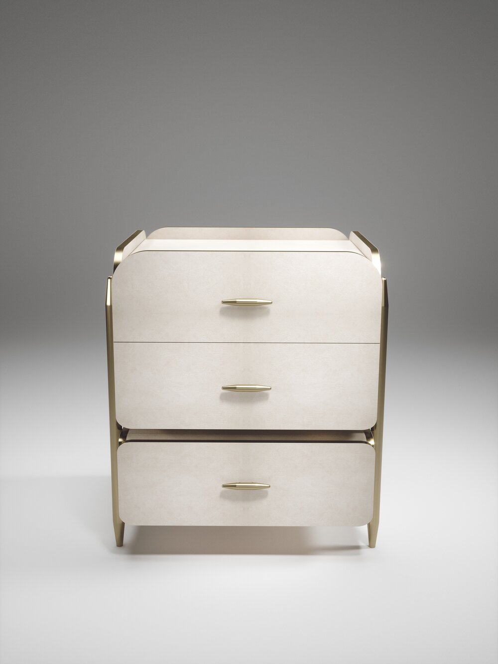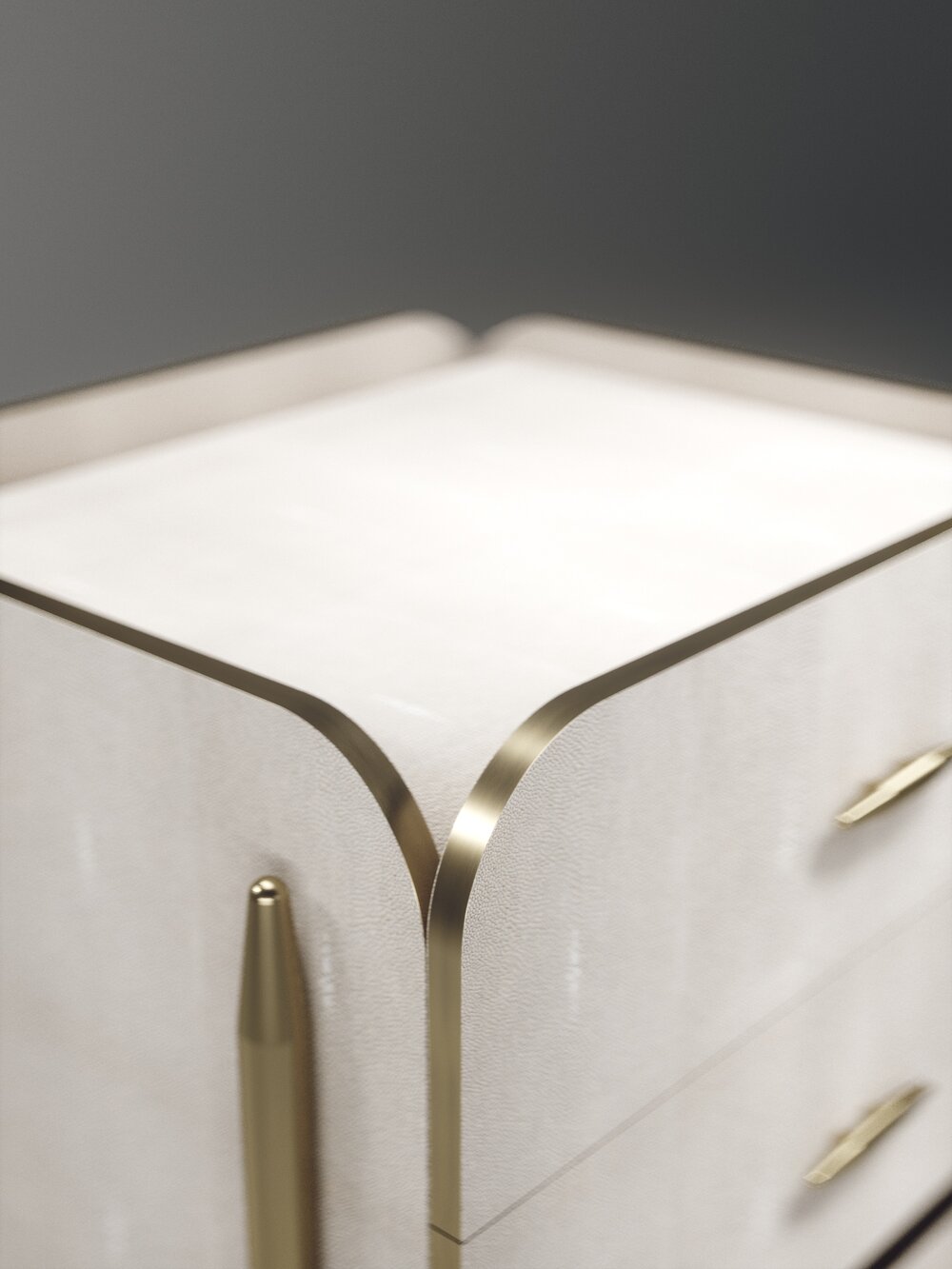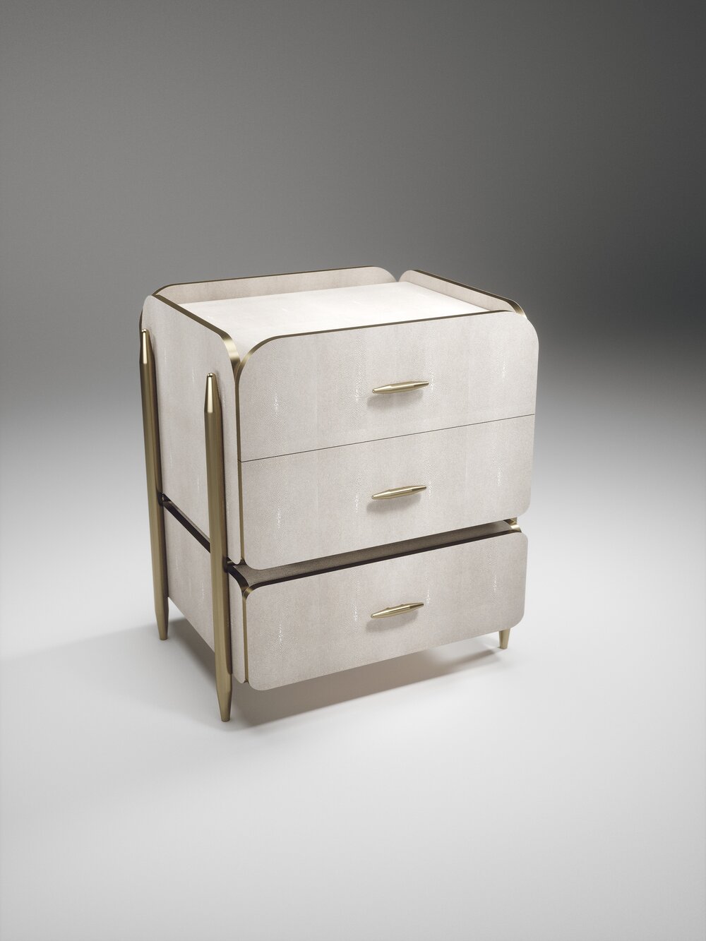 The Dandy Square Bedside Table by Kifu Paris is an elegant and luxurious home accent, inlaid in cream shagreen with bronze-patina brass details. This piece includes 3 drawers total and the interiors are inlaid in gemelina wood veneer. This piece is designed by Kifu Augousti, the daughter of Ria and Yiouri Augousti. Sold individually