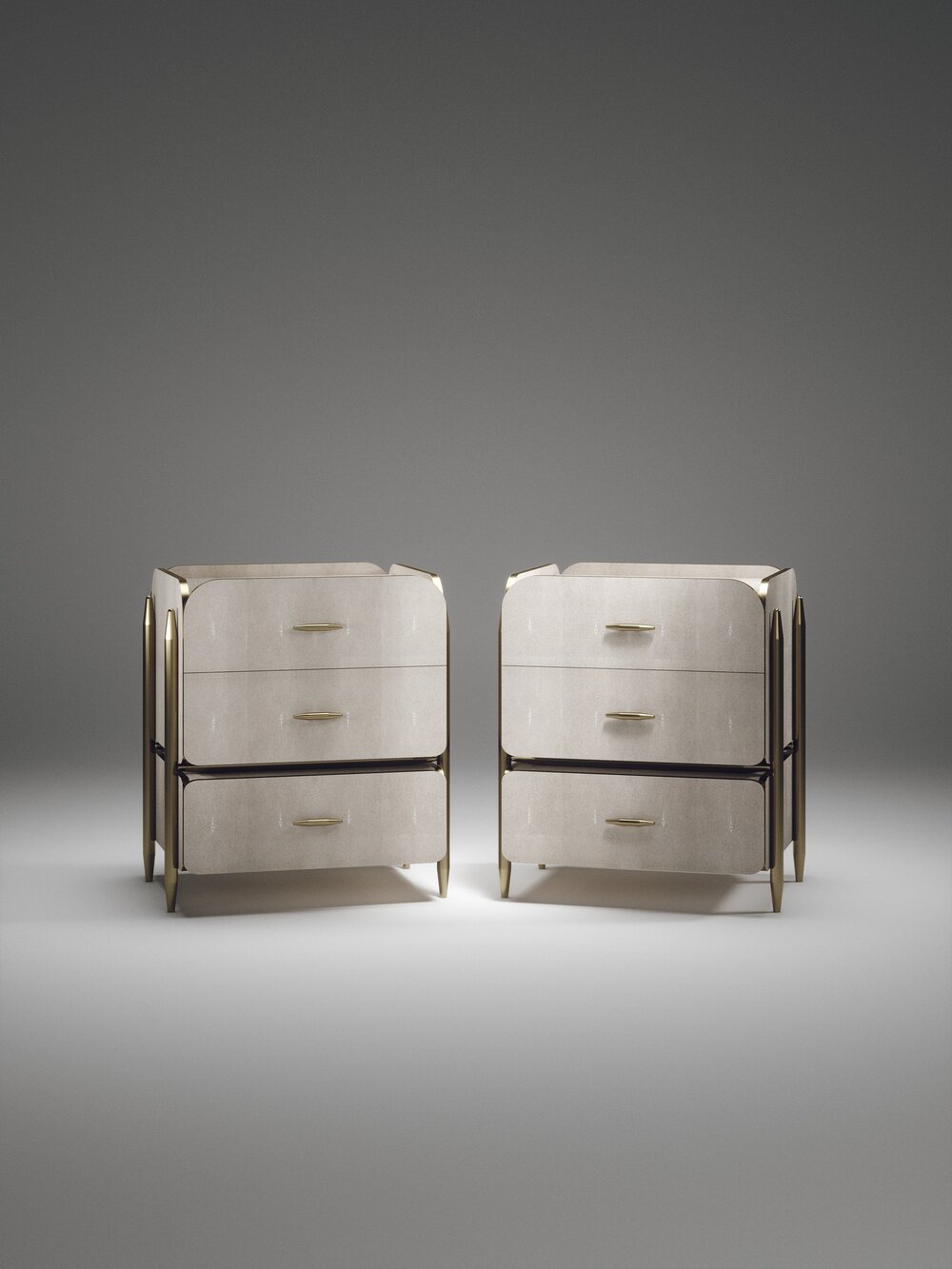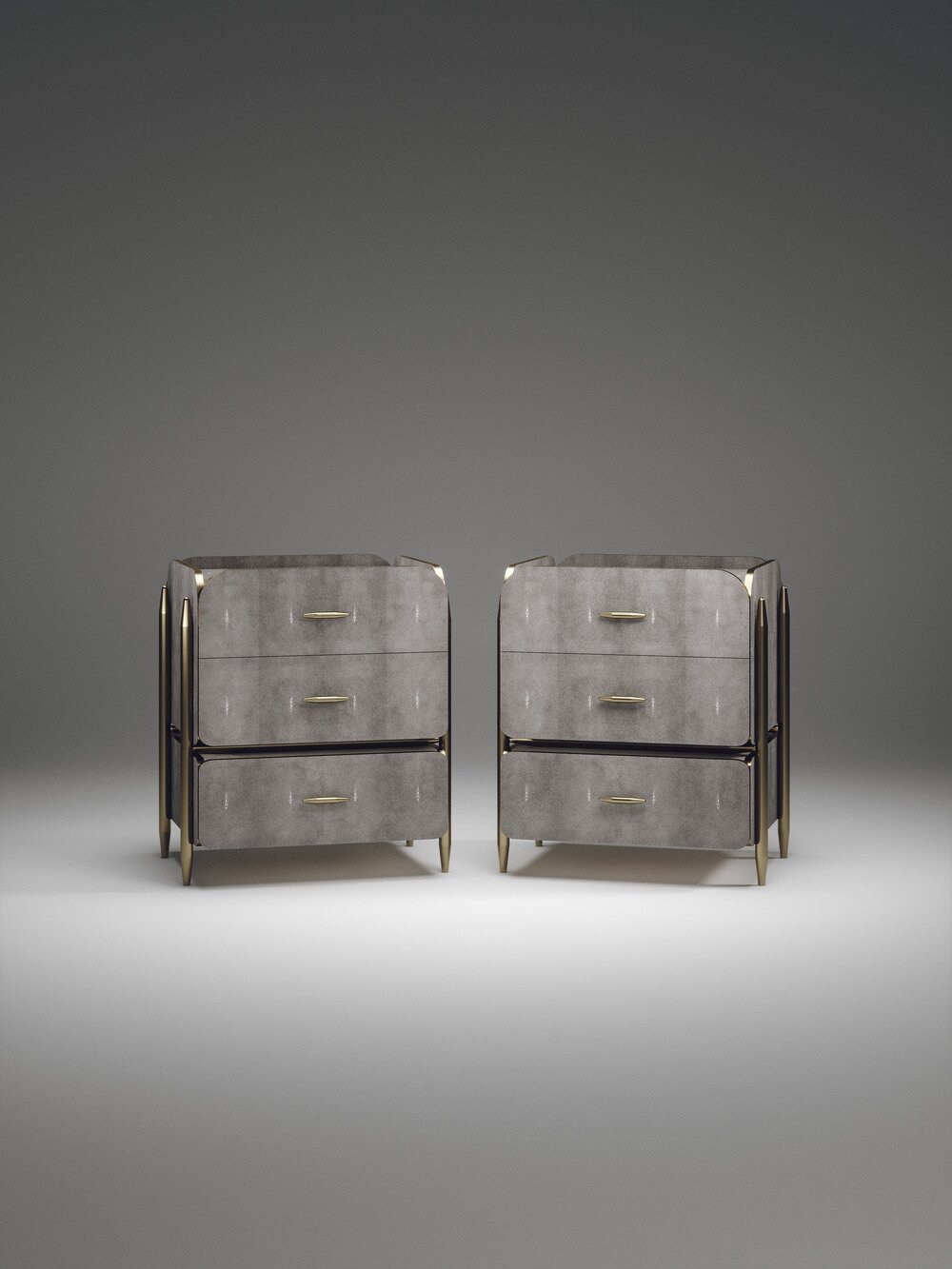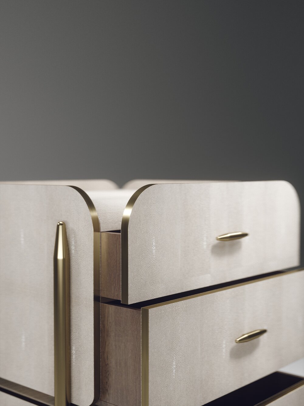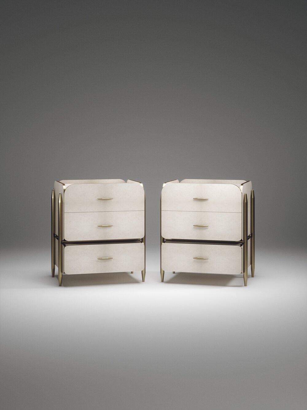 The Dandy Square Bedside Table by Kifu Paris is an elegant and luxurious home accent, inlaid in cream shagreen with bronze-patina brass details. This piece includes 3 drawers total and the interiors are inlaid in gemelina wood veneer. This piece is designed by Kifu Augousti, the daughter of Ria and Yiouri Augousti. Sold individually