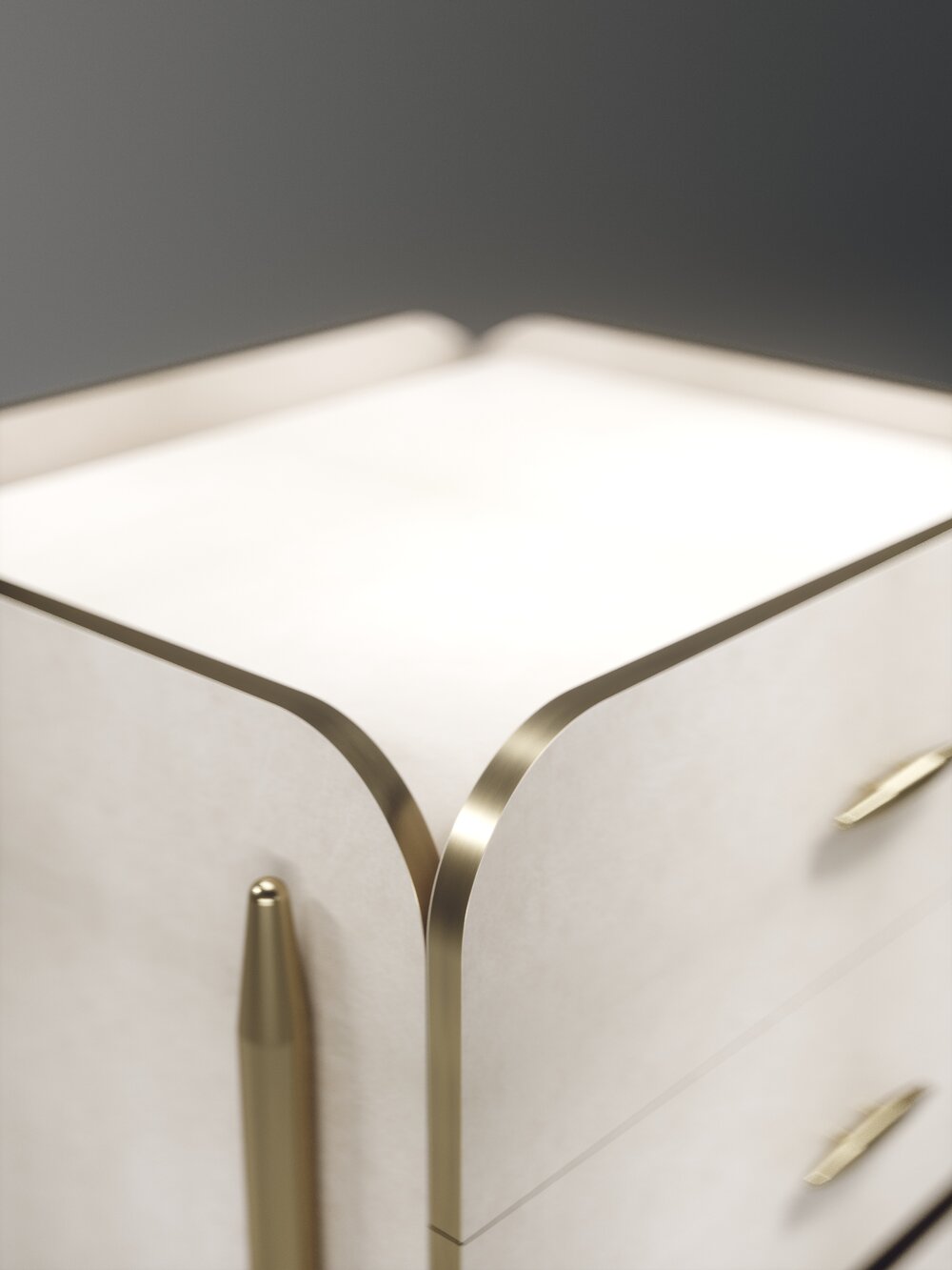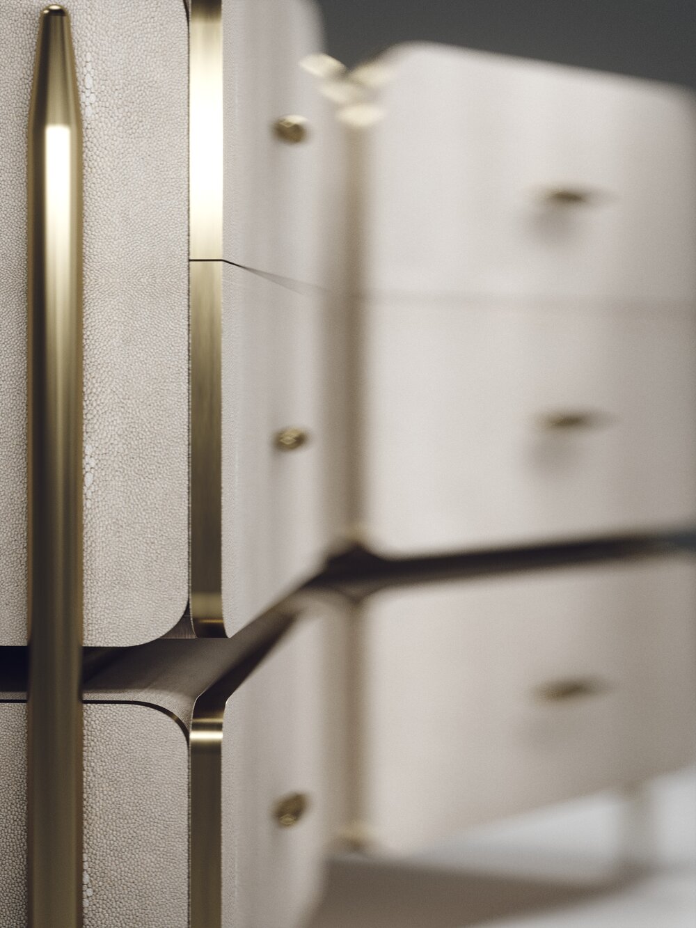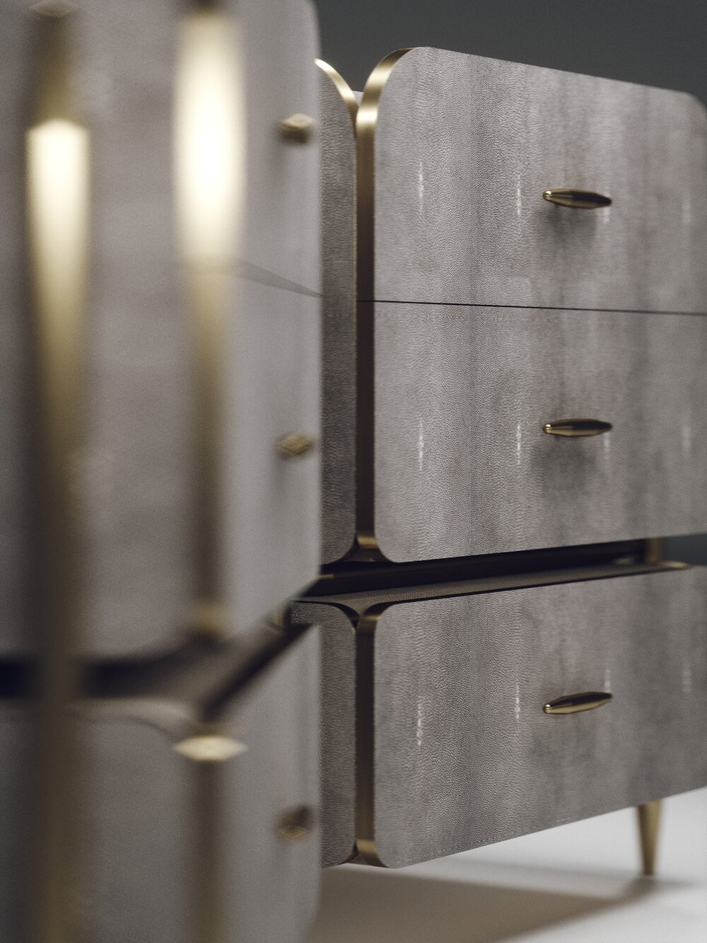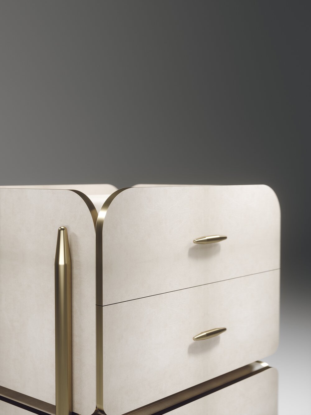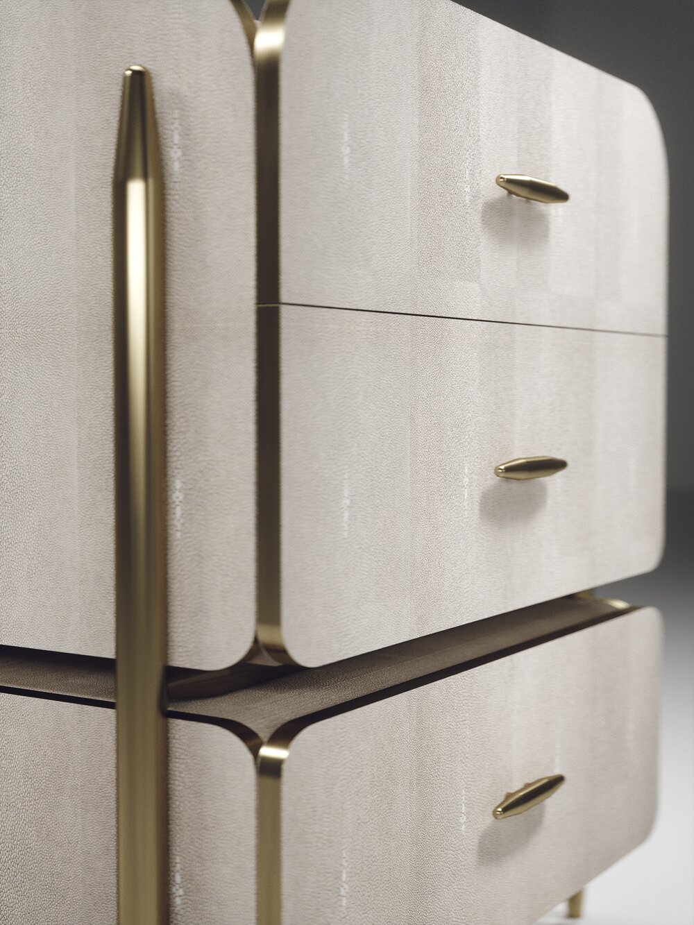 The Dandy Square Bedside Table by Kifu Paris is an elegant and luxurious home accent, inlaid in cream shagreen with bronze-patina brass details. This piece includes 3 drawers total and the interiors are inlaid in gemelina wood veneer. This piece is designed by Kifu Augousti, the daughter of Ria and Yiouri Augousti. Sold individually