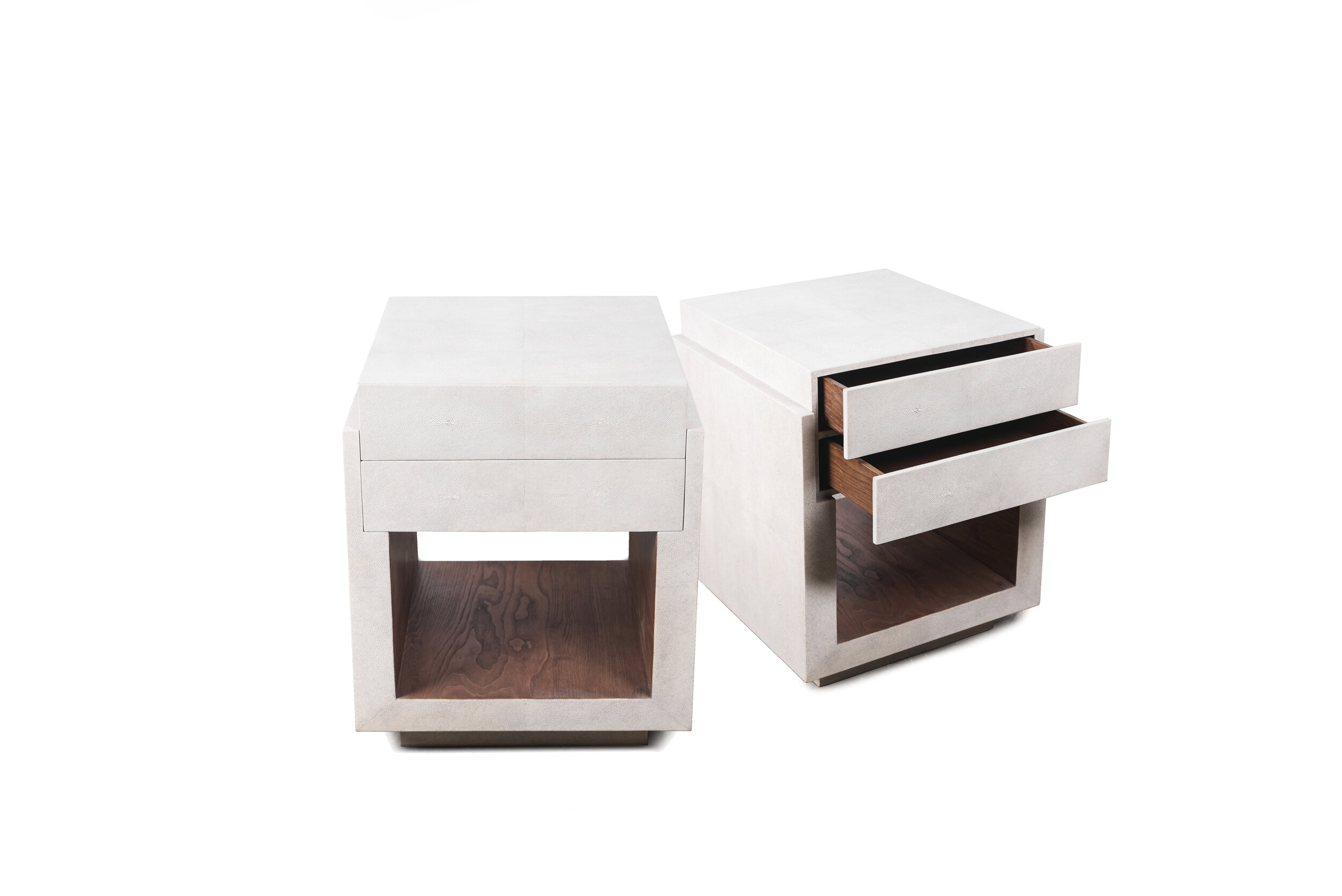 The tomboy bedside by R&Y Augousti is an elegant piece with its subtle geometry. This bedside table is completely inlaid in a mixture of cream shagreen and gemelina wood veneer in the shelf opening. This bedside table includes two drawers and a lower open shelf.