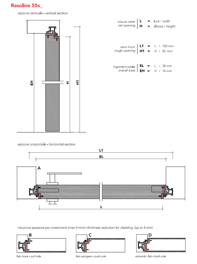 Perfected integrated with the wall and the surrounding architecture, Rasoline55s marks the transition from one space to another with different finishes. Two surfaces that dialogue with the spaces, complementing their characteristics with elegance. The elemental metal edging, available in various finishes, is both structural and decorative.