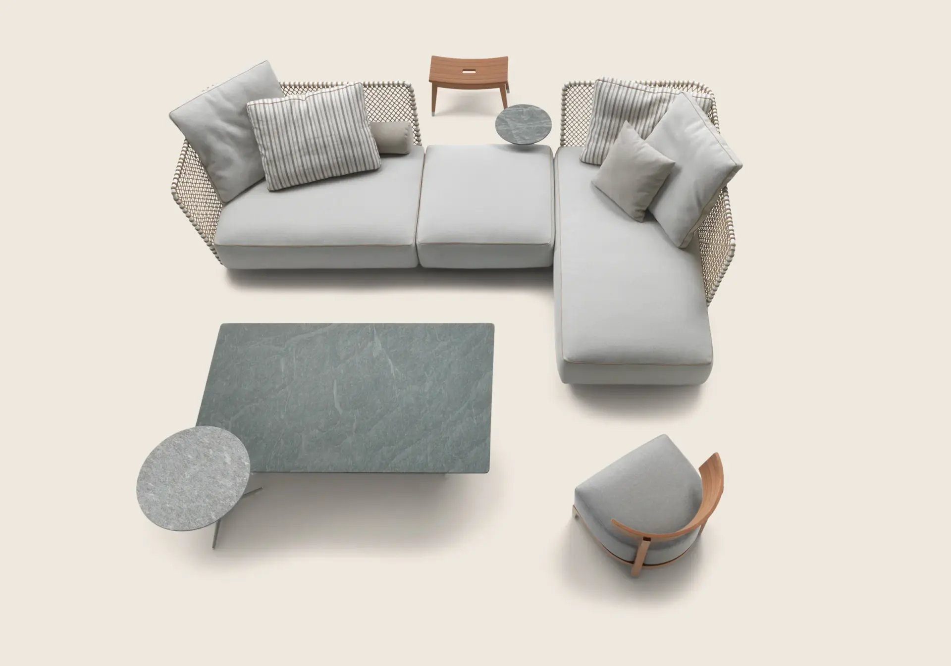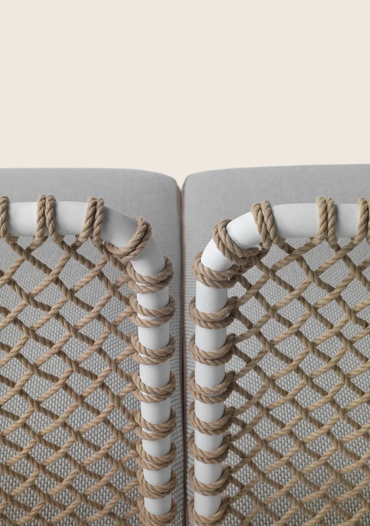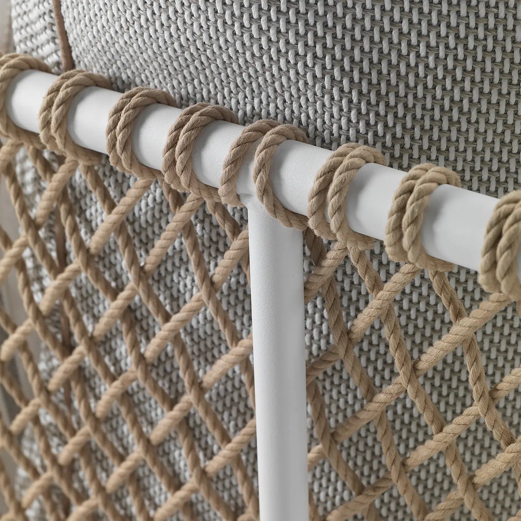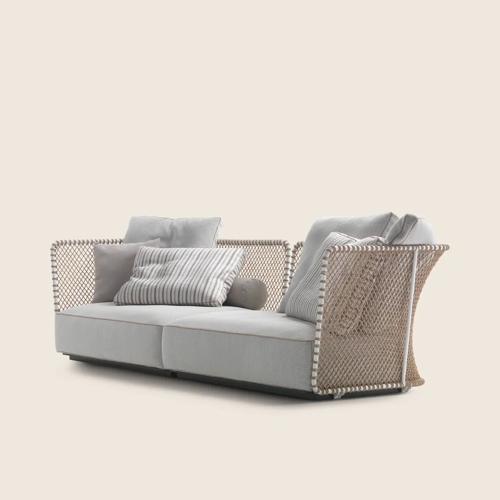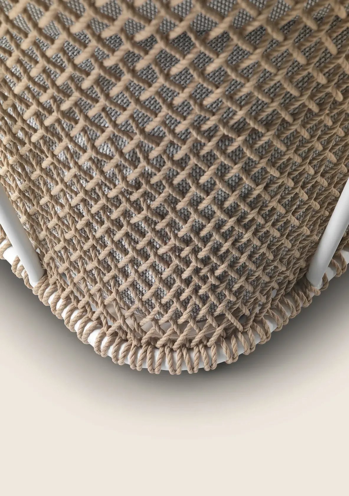 The structure is in epoxy powder-coated tubular metal accompanied by entirely hand-woven polypropylene or rubber cord. Visually, the effect is that of a spacious basket that welcomes soft seat and backrest cushions – an invitation to abandon oneself to relaxation.