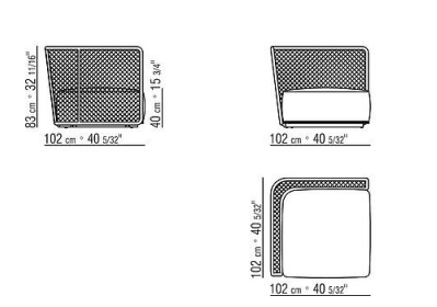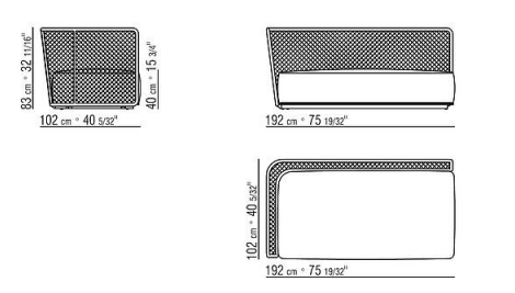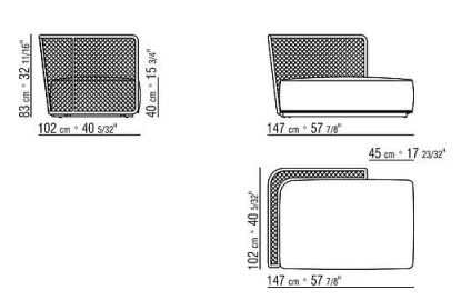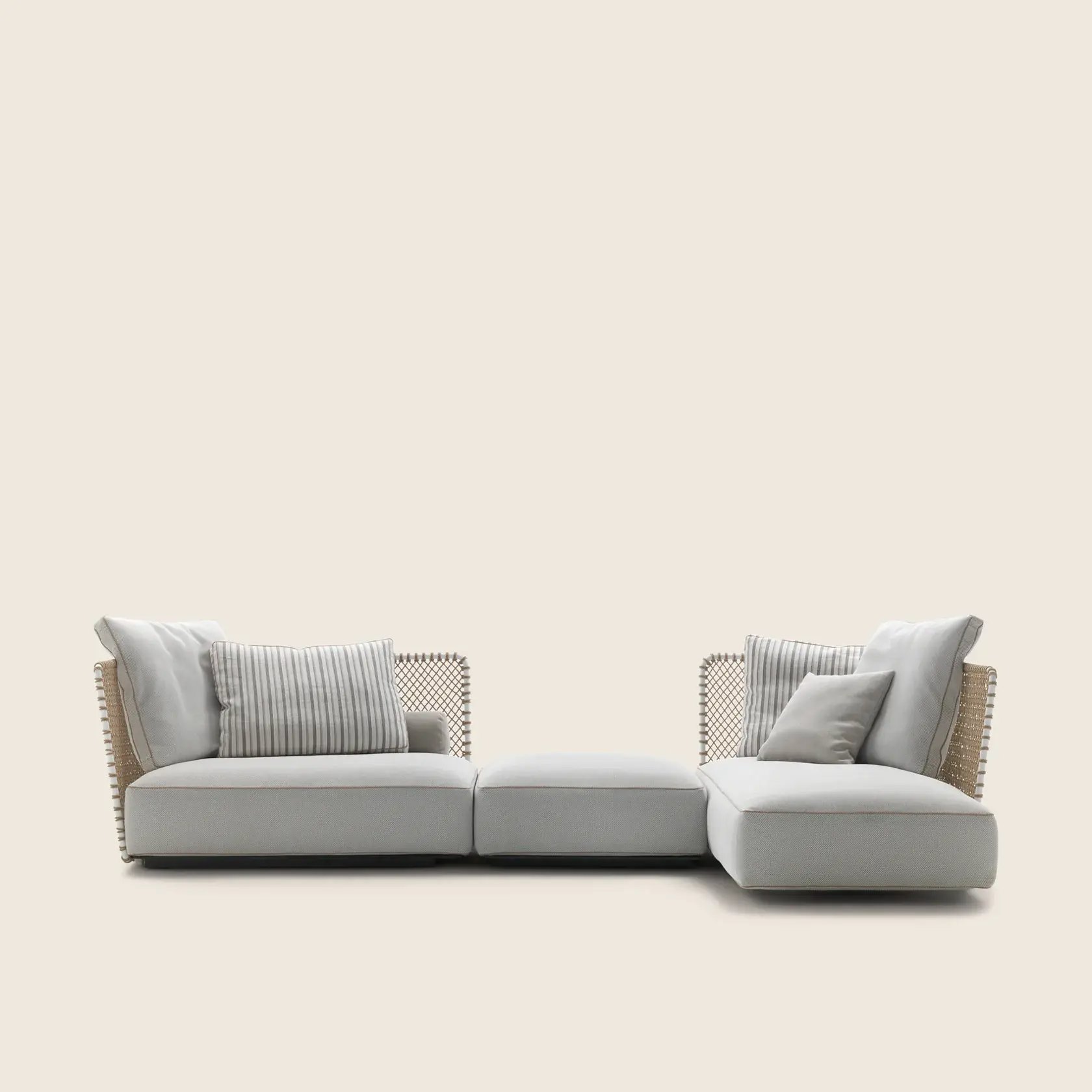 Its generous woven cord-and-metal backrest with a mesh-like pattern forms the aesthetic motif that lends bold personality to the Oasis sofa.