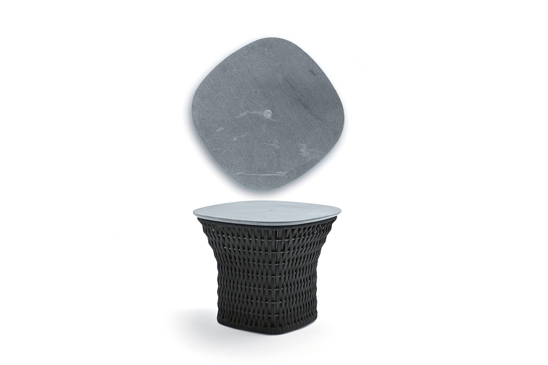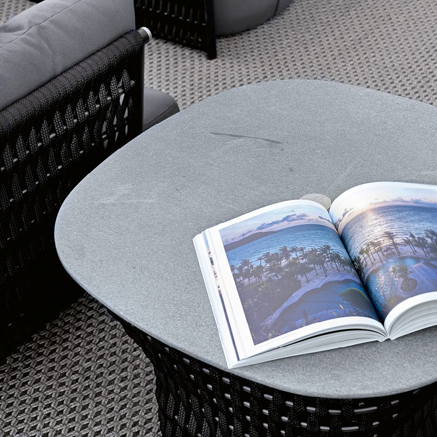 Outdoor side table in combination of satined black metal and black or light grey woven cordage. Top in treated "CARDOSO" natural stone with inserted Giorgio Collection logo.