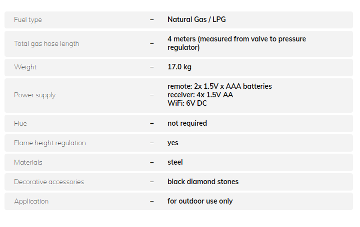 Galio Star Insert is a unique fireplace to boost your outdoor area design. A star-shaped gas burner with its beautiful natural flames will bring the “wow-effect” to your garden. Convenient in use automatic control will help you to enjoy the fireplace to the fullest. Black diamond stones enhance the appearance of the fireplace and create additional decoration.
