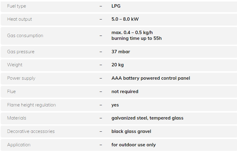 Faro is the most popular gas patio heater in Europe. It is fuelled with LPG and emits heat up to 8 kW. This outdoor patio heater is fully portable. You can move the product around the garden or patio and lock the wheels in the selected location.
