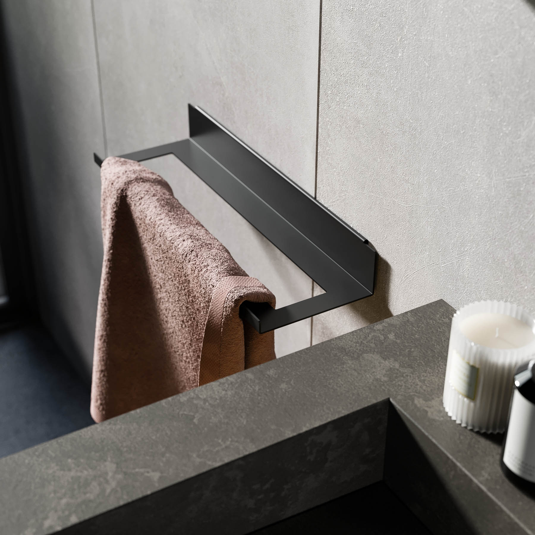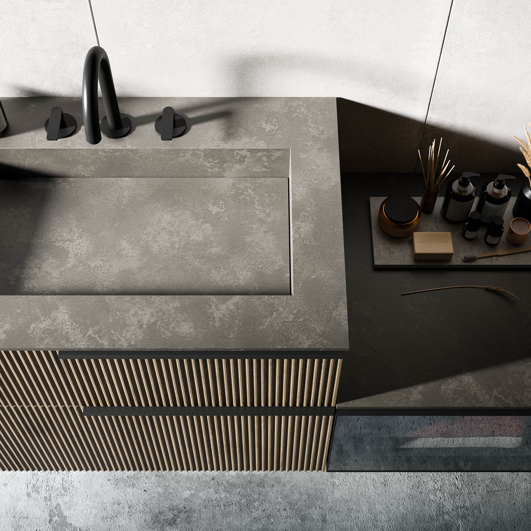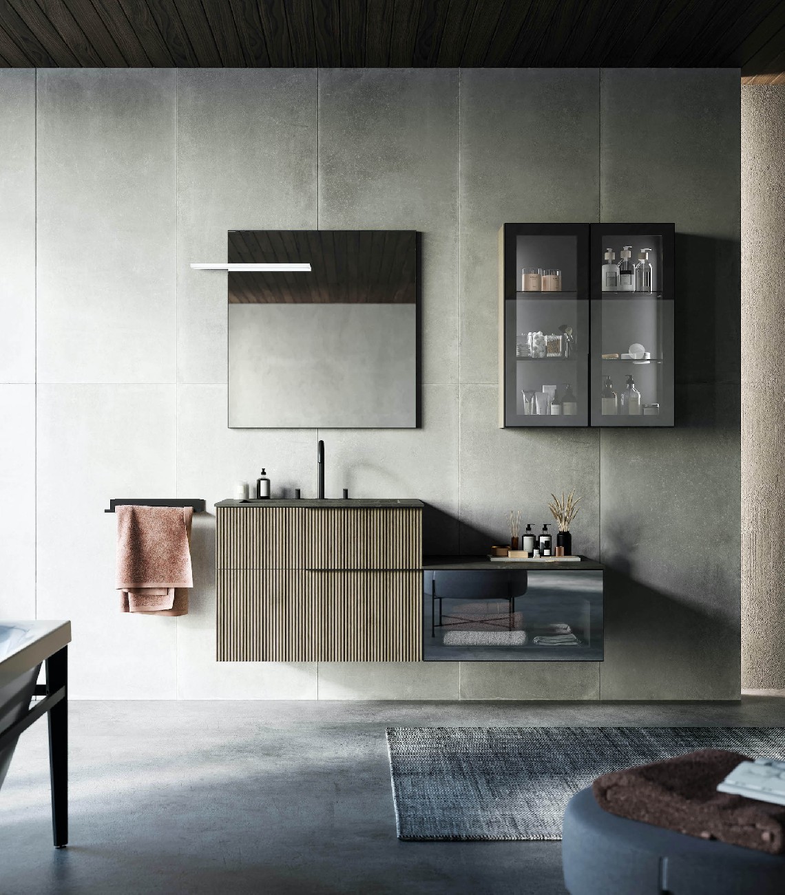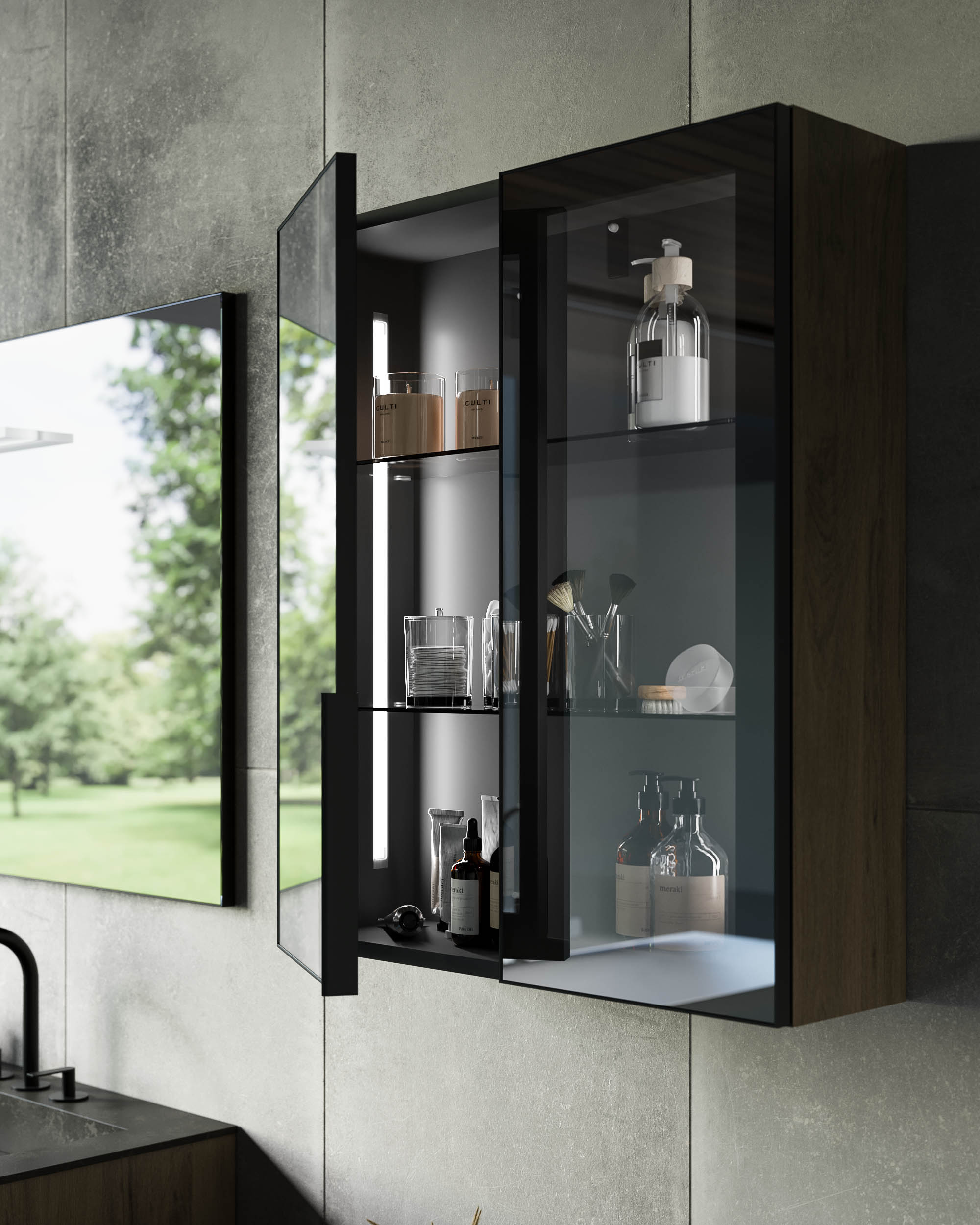 Surfaces and volumes play together. Surprising and captivating the effect of the Vertigo fronts next to the black aluminium and stop-sol glass frames. All elements with aluminium door and stop-sol glass can be equipped with optional interior lighting. Minimal design for the new BLADE accessories line.
