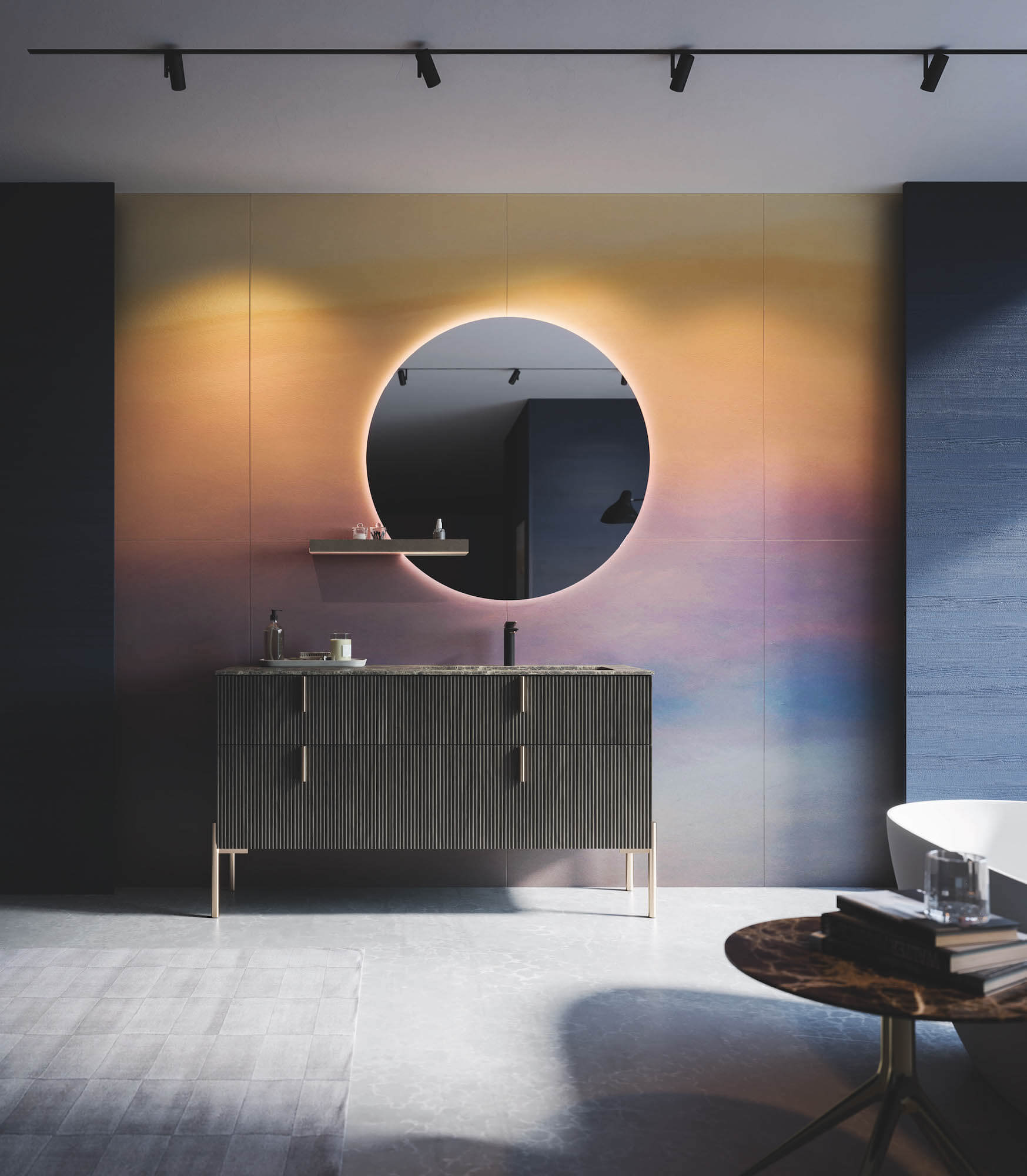 An exciting mix of colours, shapes and light. The stoneware top is an exceptional solution for those who are looking for a product that is aesthetically appealing, but at the same time durable and practical. The SPHERA mirror is wrapped in the aurora shades of the cladding, like a rising sun.