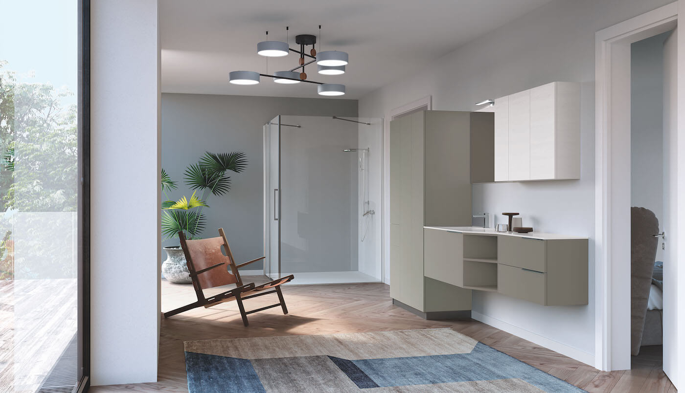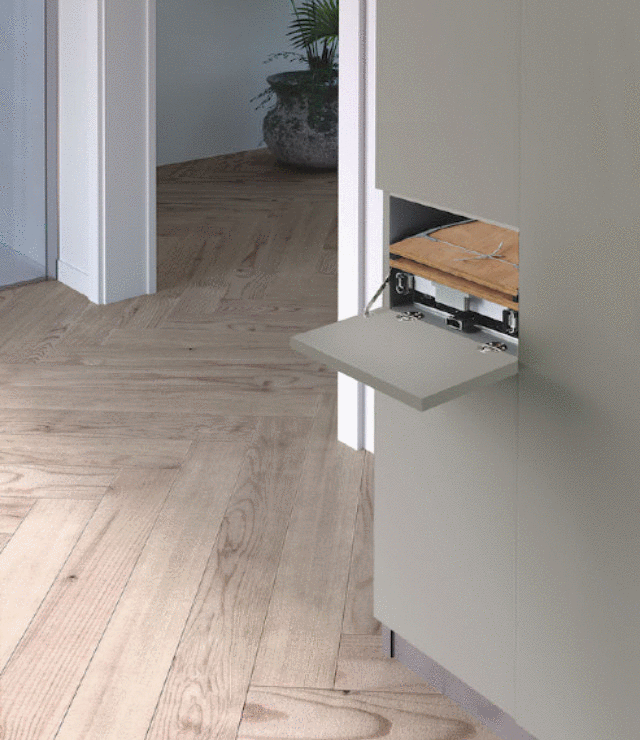 A real piece of furniture, which incorporates what is necessary for the laundry, washing machine and ironing board, find space in the spacious closet. The whole is played in shades of gray and white, for a very refined glance. With Puntotre, aesthetics and functionality go hand in hand: the exclusive ironing board of the PUNTOTRE Laundry allows it to be inserted even in a drawer just 35cm wide.