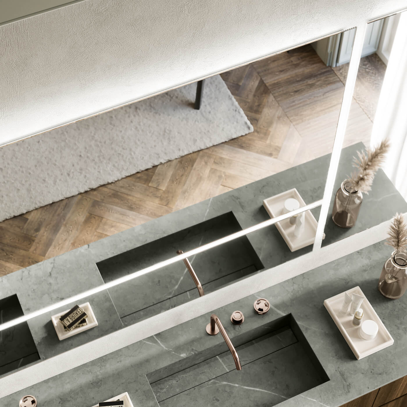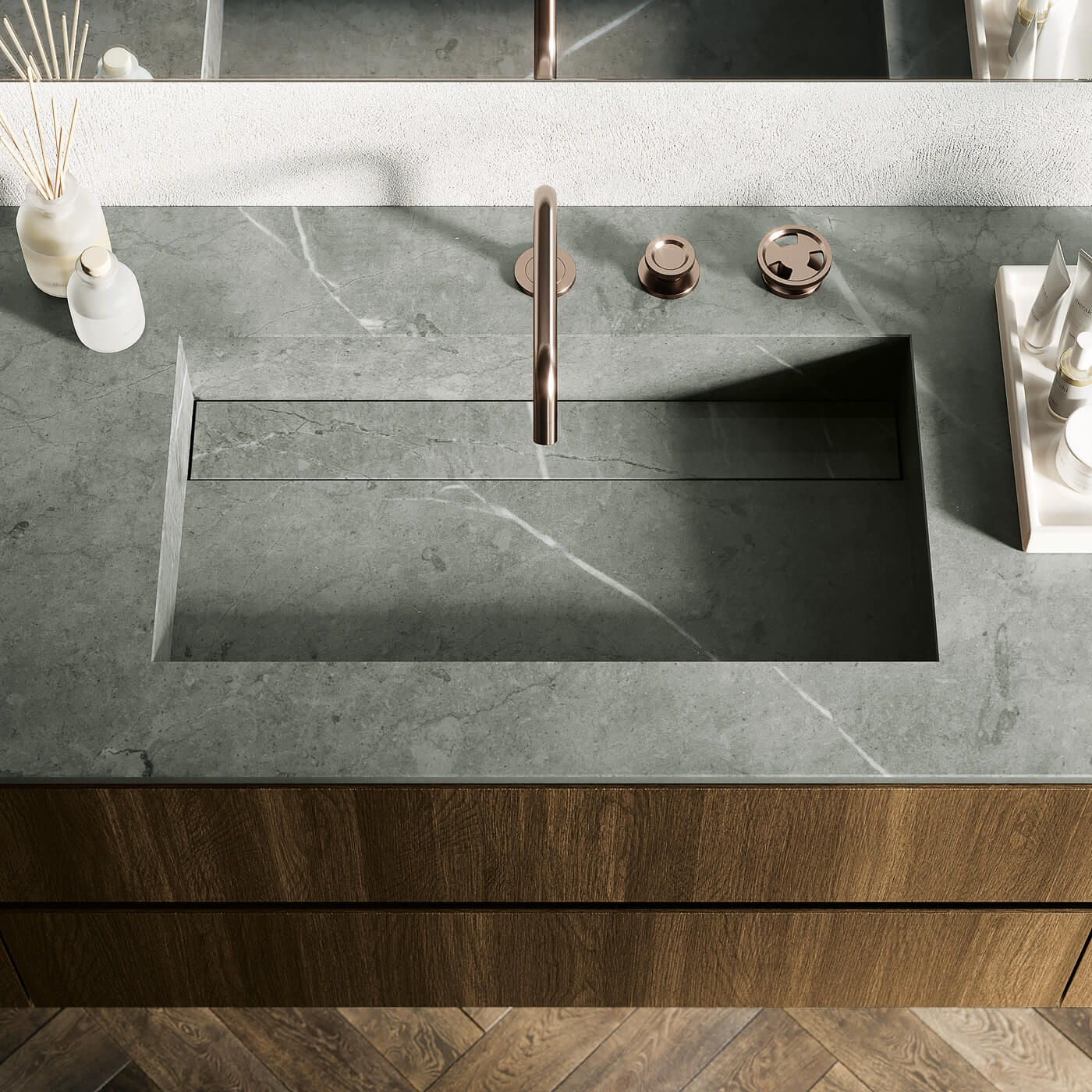 The Zaha Stone gres top contributes to the preciousness of the composition, at the same time guaranteeing a long life expectancy for the washbasin. In the details, it is possible to highlight the degree of mastery and attention that Puntotre places in its accurate and exclusive workmanship.