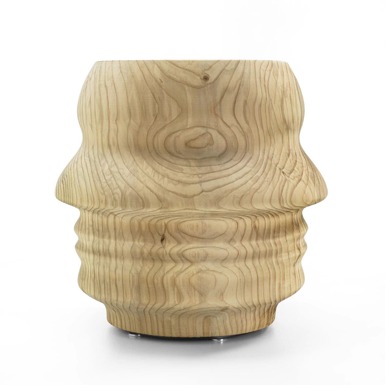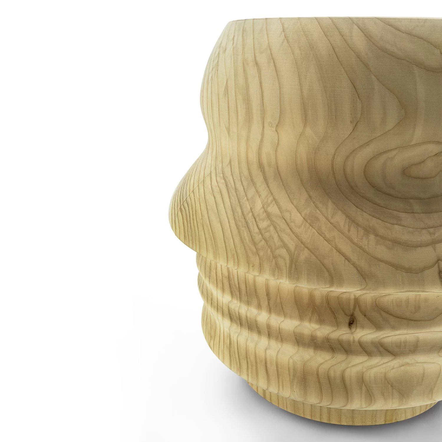 Sgabello in legno massello di cedro profumato lavorato da un blocco unico, con design ispirato al profilo di un volto umano: una forma senza tempo, un viso che osserva in ogni direzione.