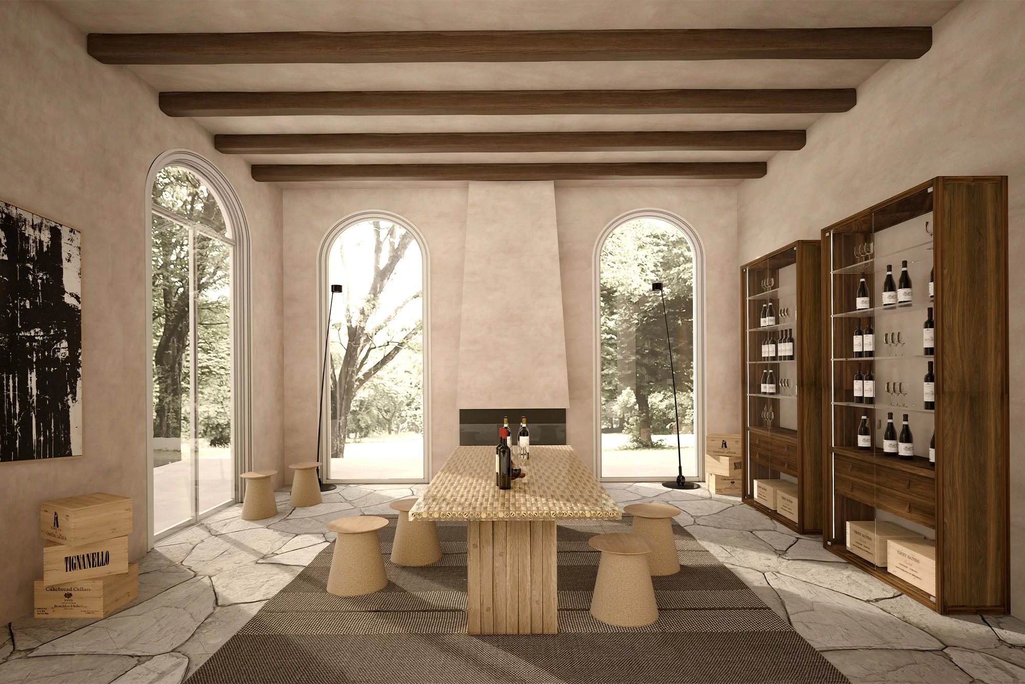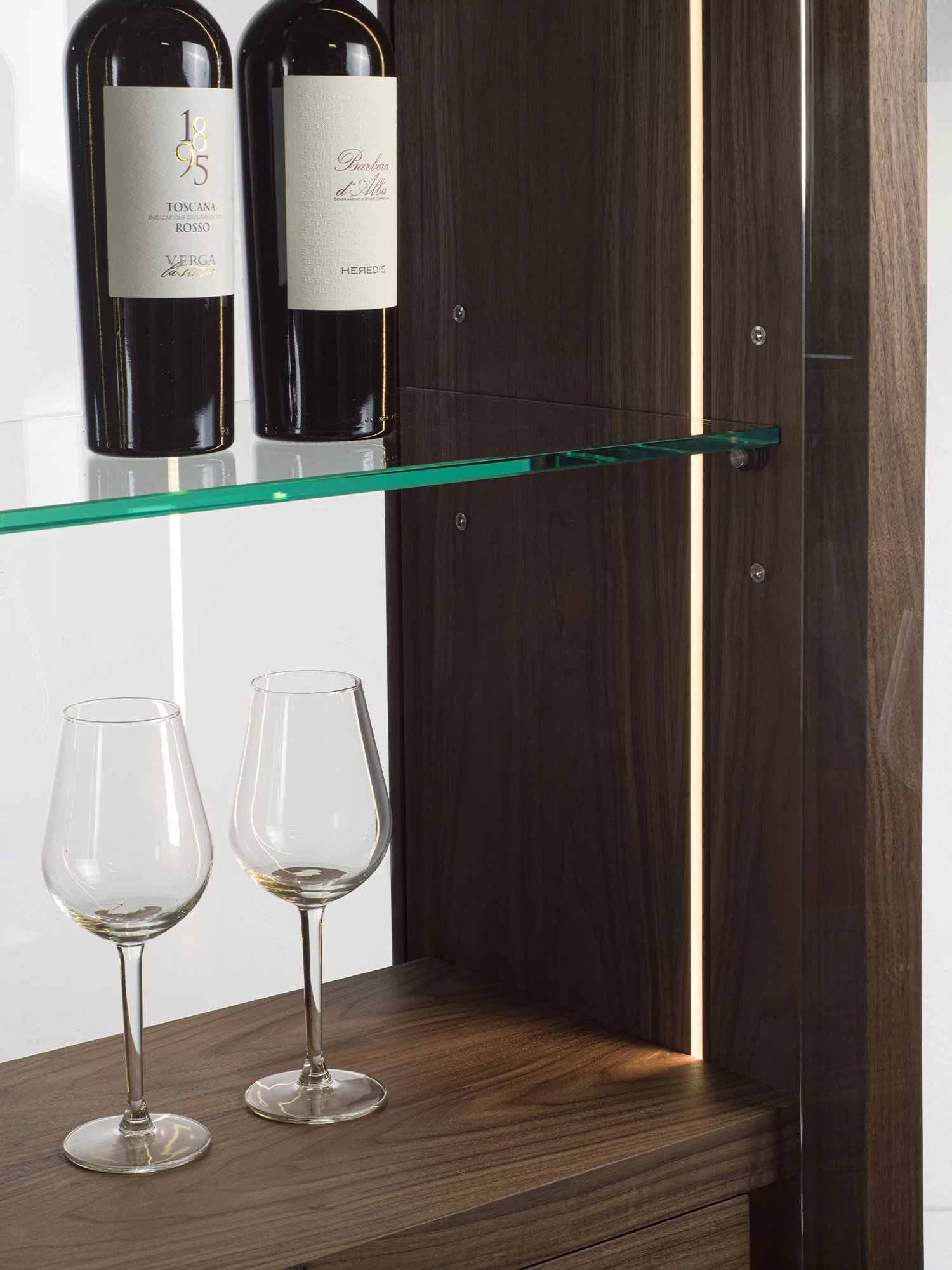 Vetrina alta, tipo espositore, con struttura in legno massello e listellare, caratterizzata da ante, quattro ripiani interni e schienale in vetro. Dotata di cassettiera interna con due cassetti. Maniglie in cuoio ne facilitano l’apertura. Illuminata da un sistema di luci LED verticali.