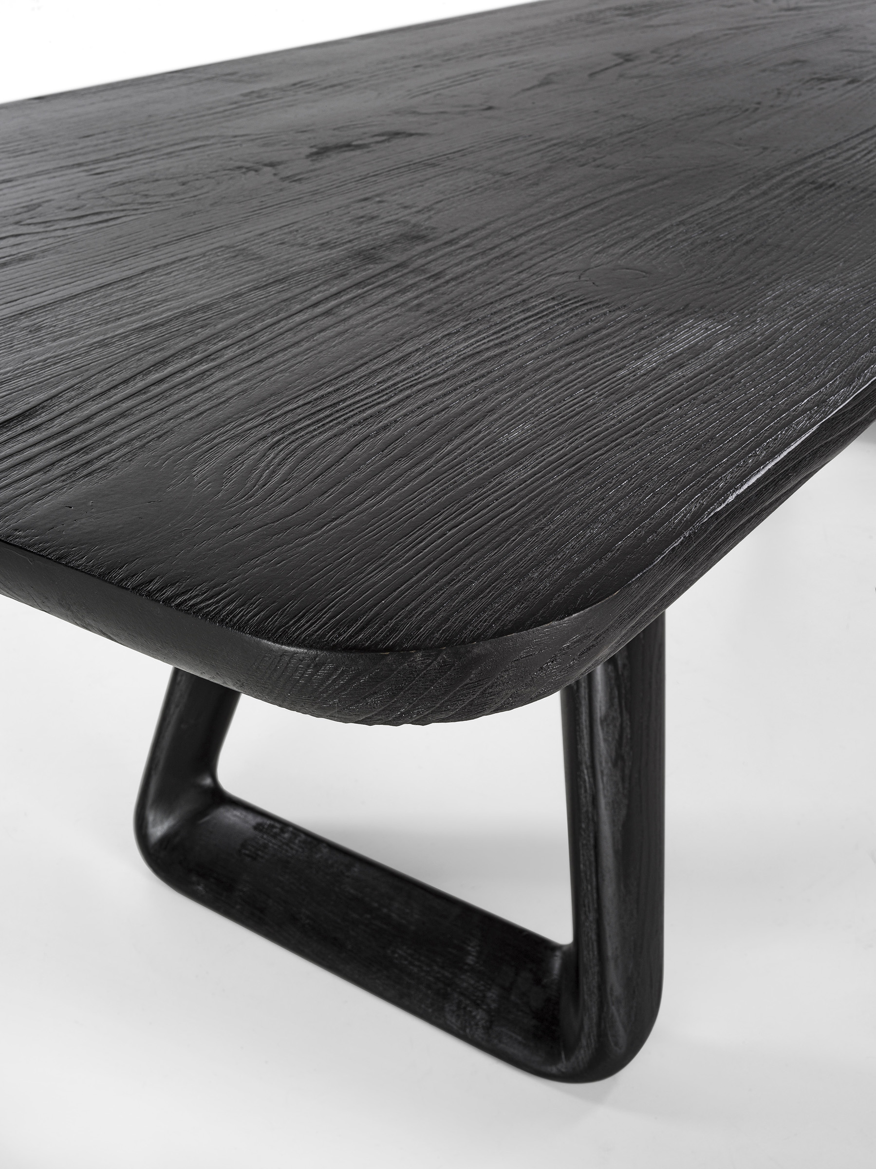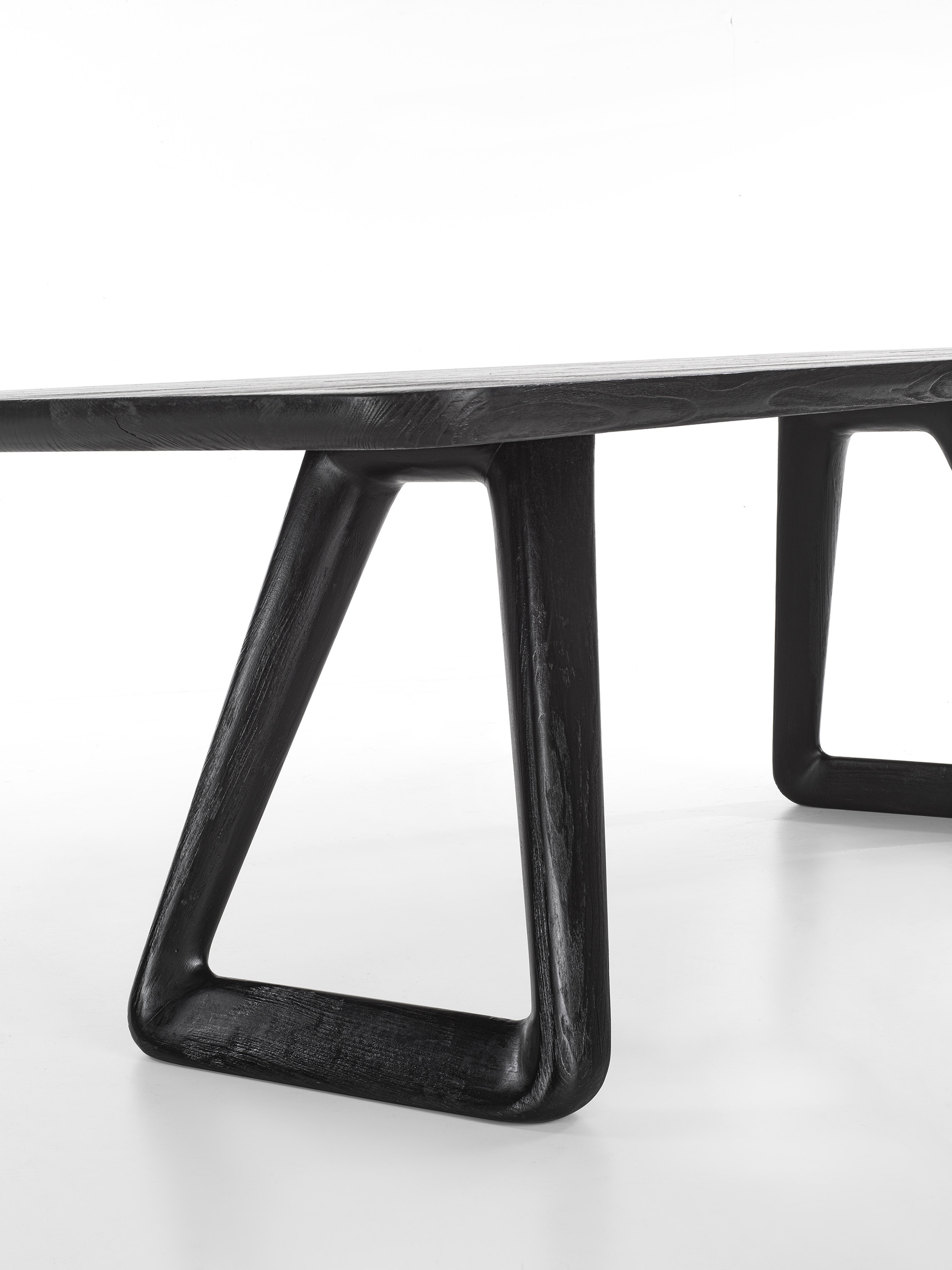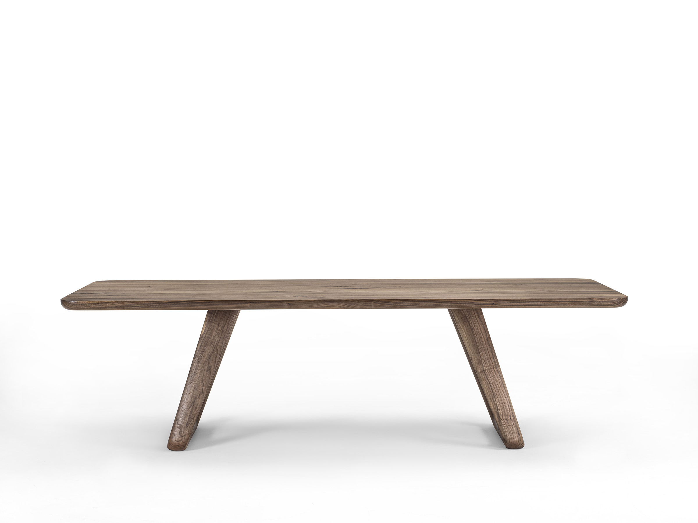 Tavolo con top a liste incollate e bordi smussati caratterizzato da due gambe interamente in legno massello la cui raffinata geometria è disegnata da linee rette che incontrano linee curve ed angoli stondati.