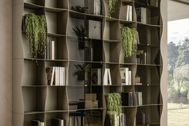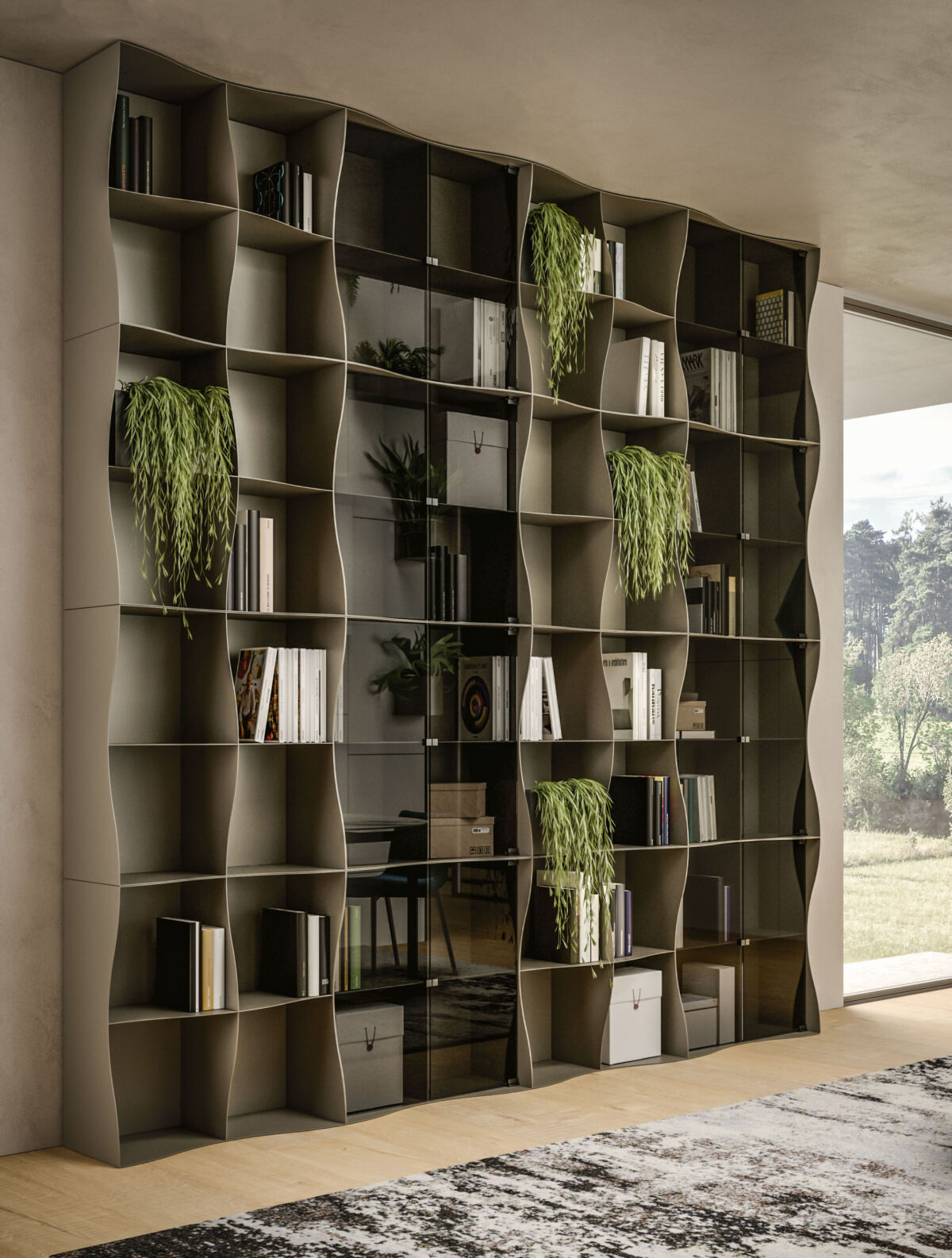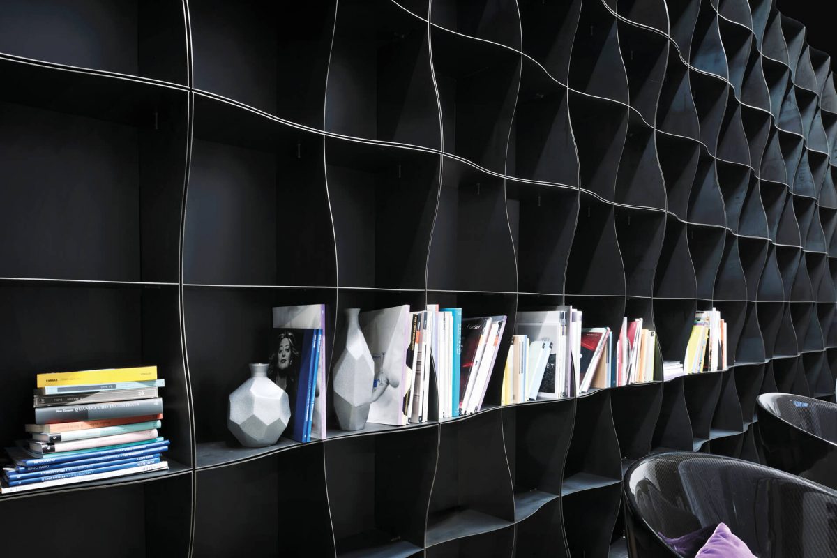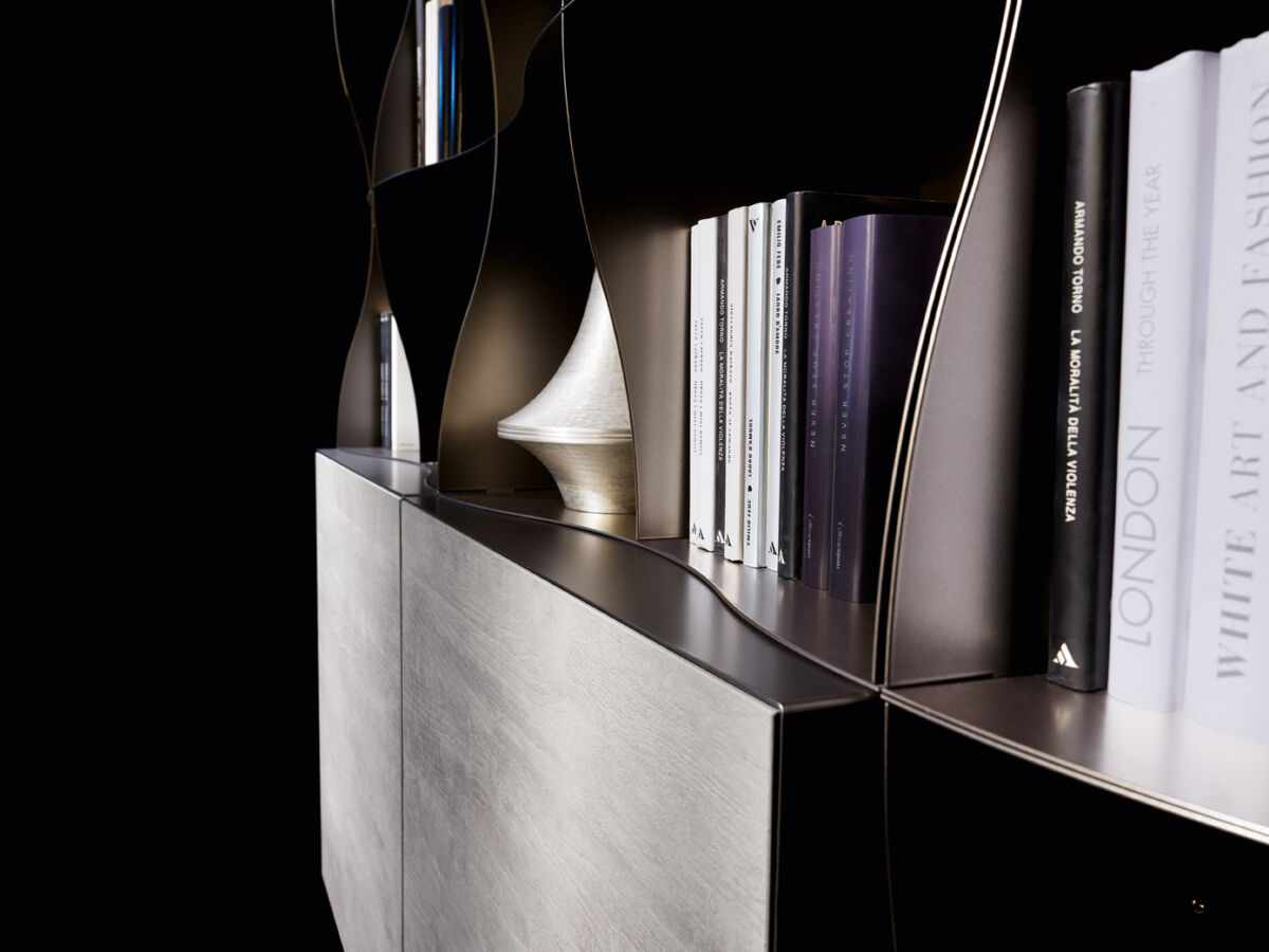 Modular bookcase made of metal with a curvilinear profile. Iron-ic midules are assembled together through an easy snap-fit system and can be aggregated together with the supplied joints. It can also be combined with Shelter modules.