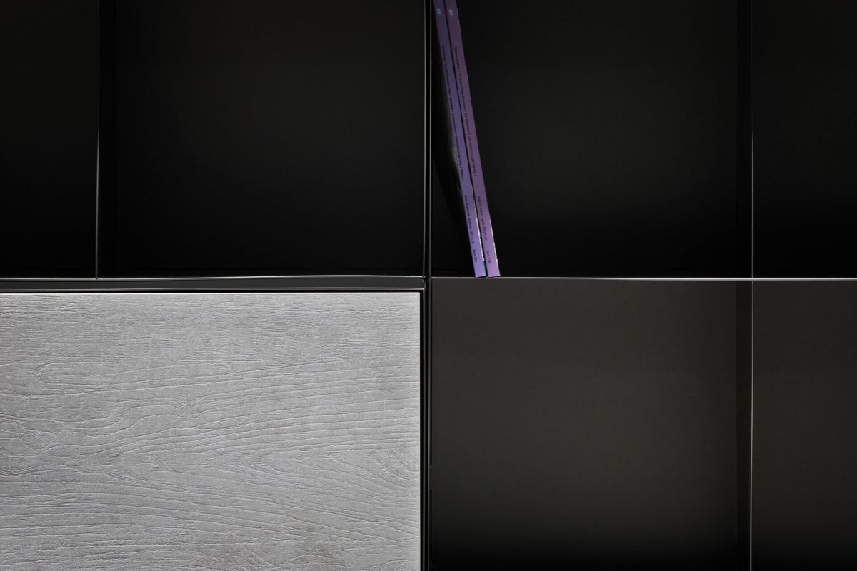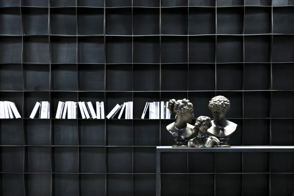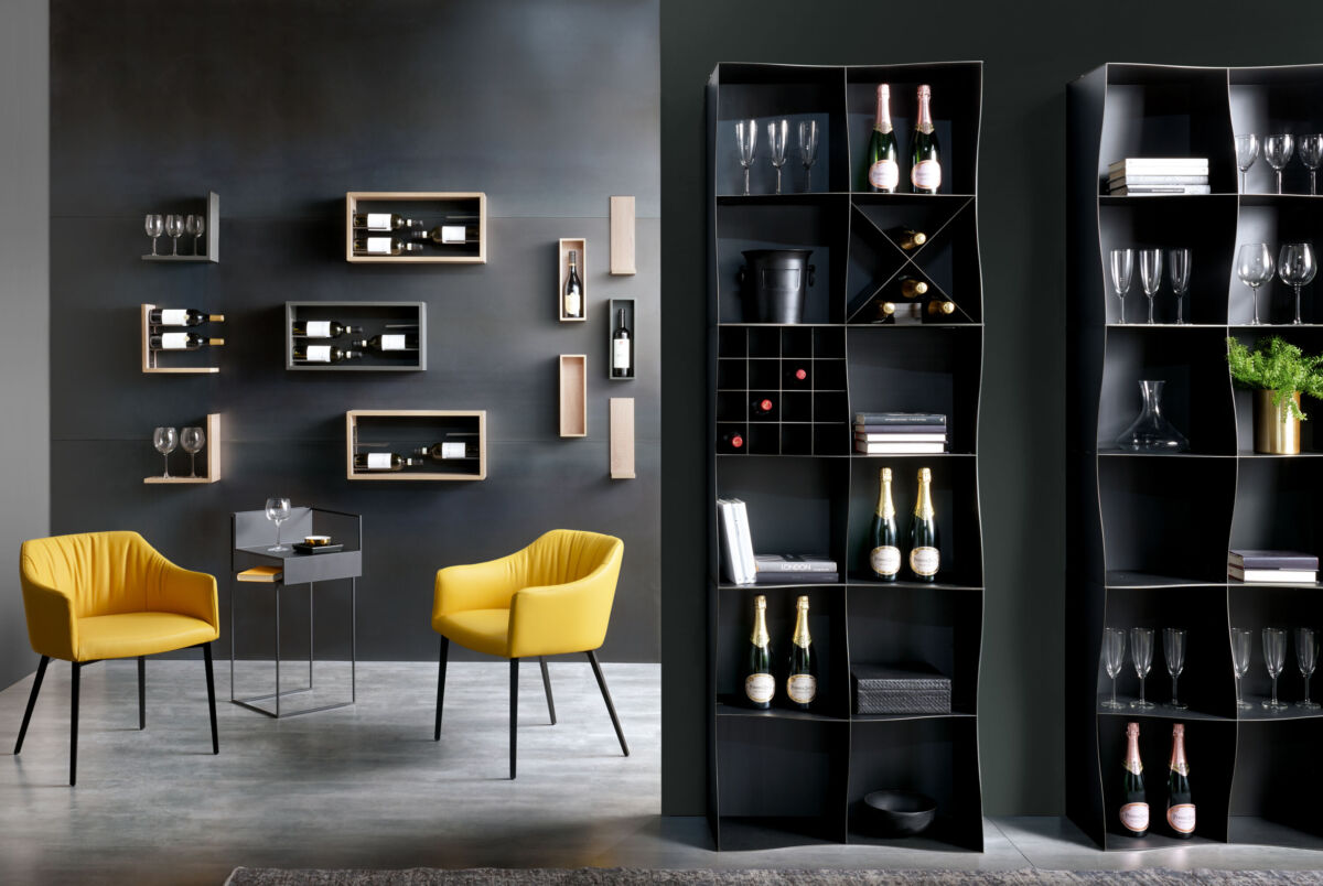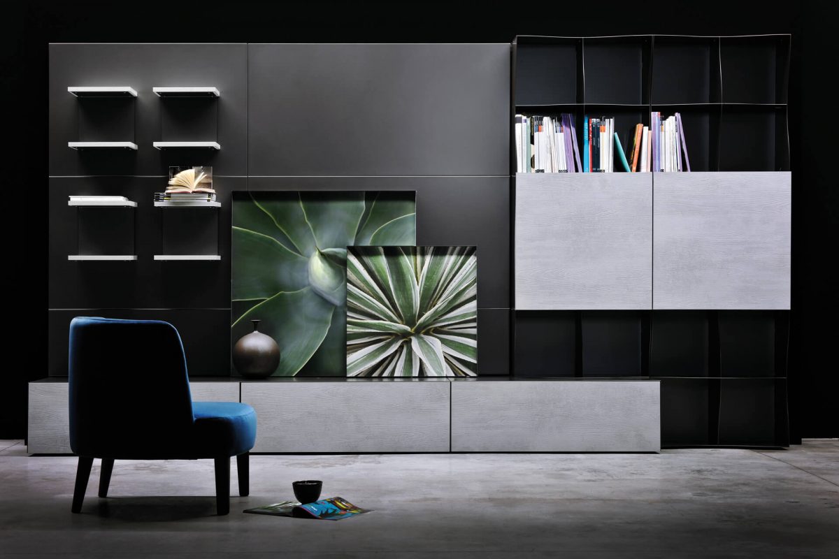 Modular bookcase made of metal with a curvilinear profile. Iron-ic midules are assembled together through an easy snap-fit system and can be aggregated together with the supplied joints. It can also be combined with Shelter modules.