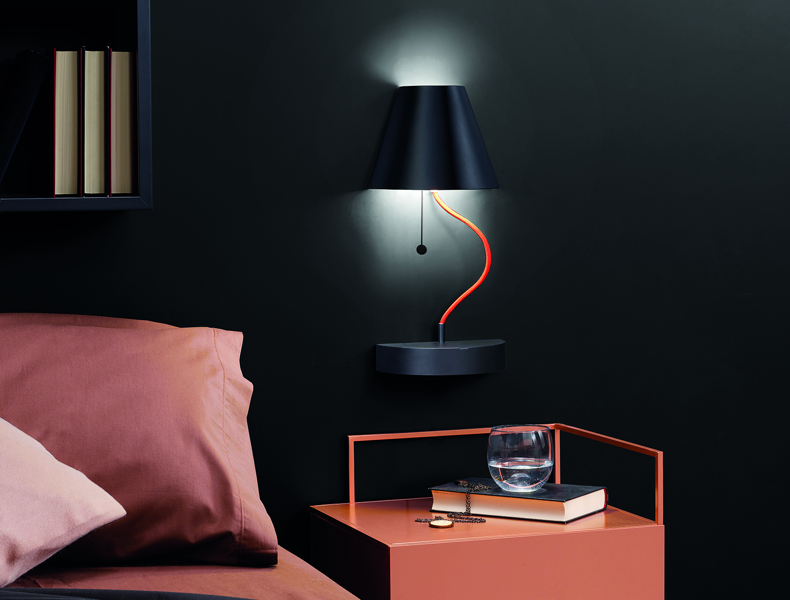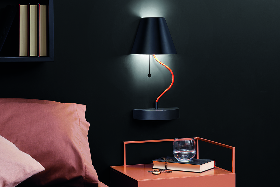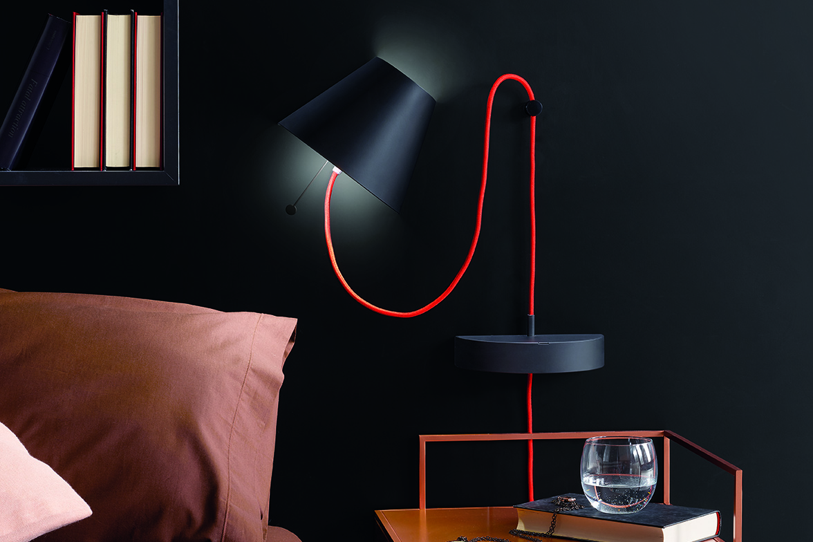 Magnetic lamp composed of metal base and lampshade, which can be freely positioned on the metal paneling of the Magnetika line. The cable is available in red or black version. The base with lid can accommodate the excess cable. Optional magnetic buttons to guide the positioning of the cable on the metal boiserie. Standard length of wire: 3 metres.