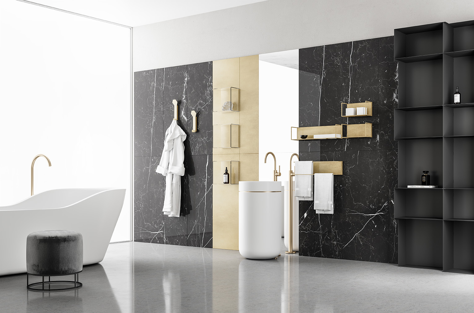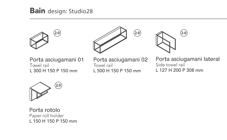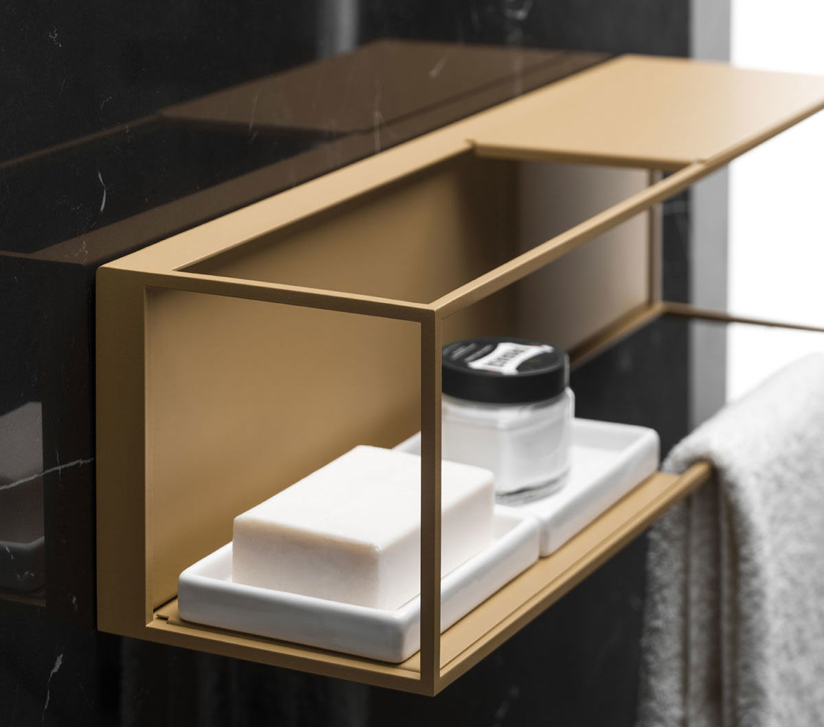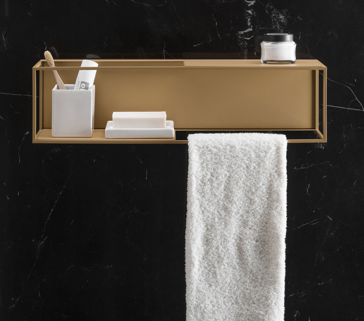 Collection of magnetic metal accessories dedicated to the bathroom environment, available with enhanced magnets for use on coated metal panels. The accessories are modular: the basic towel racks can be freely combined with metal shelves and ceramic accessories for a total customization.