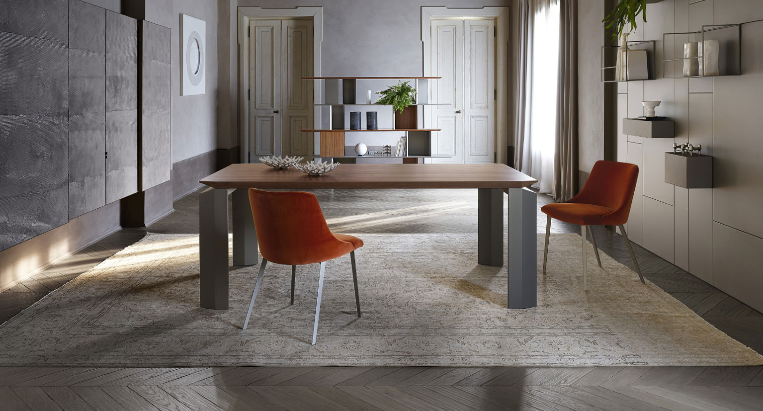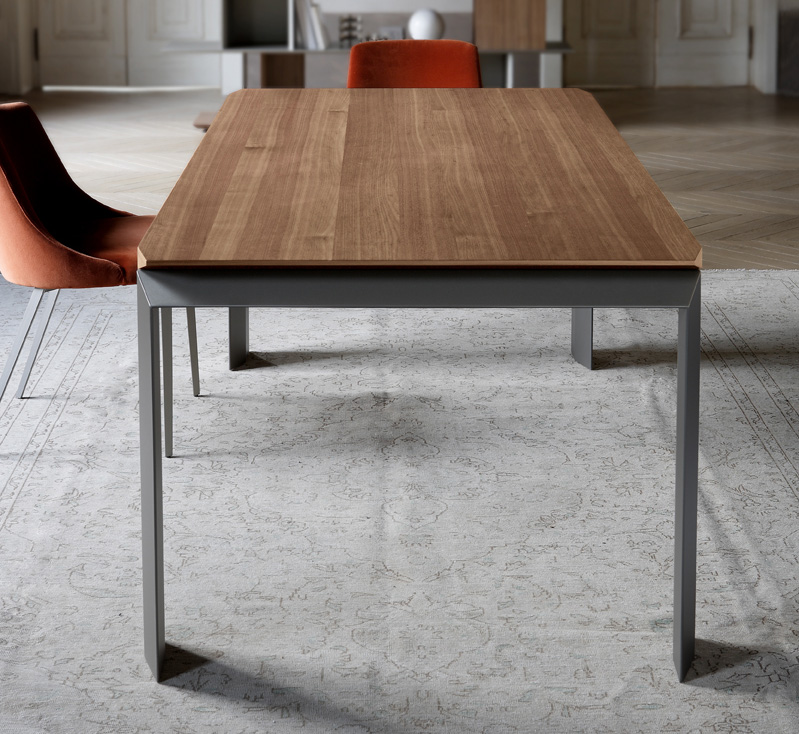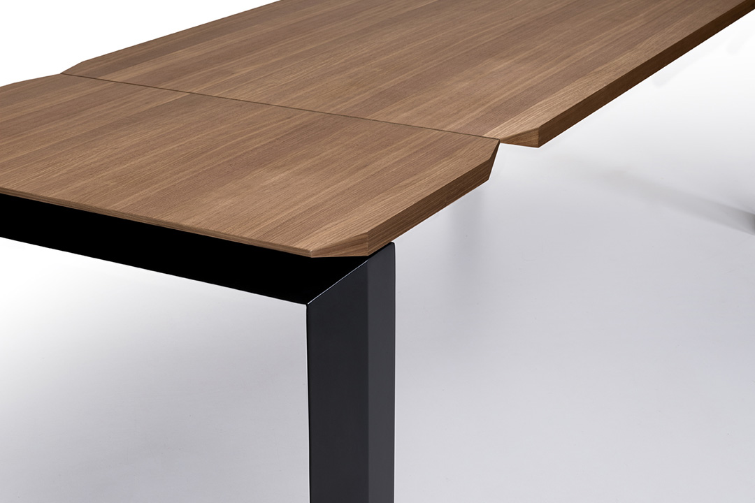Table with diamond shaped legs in painted metal. Also available as a pull-out table.