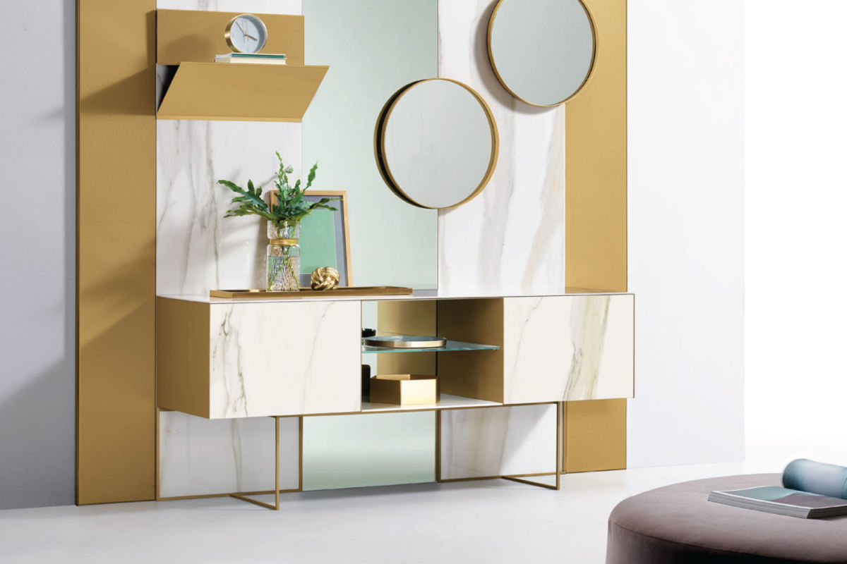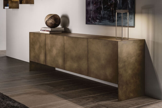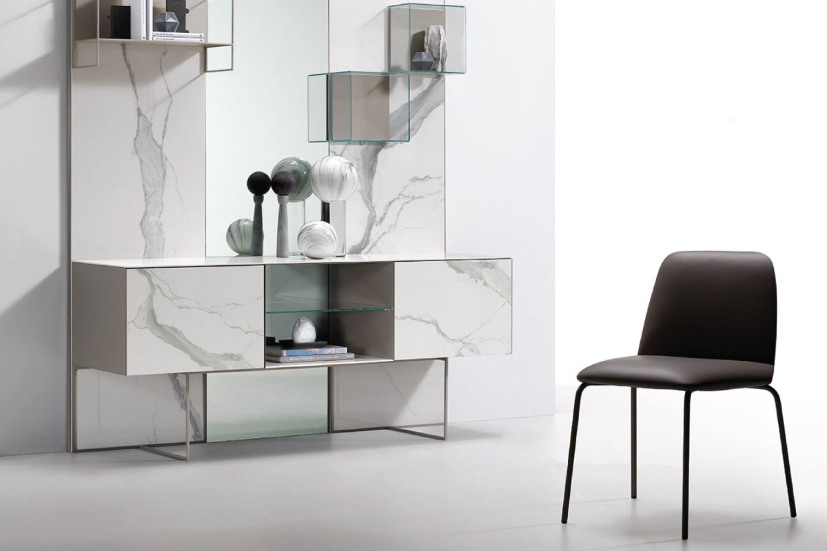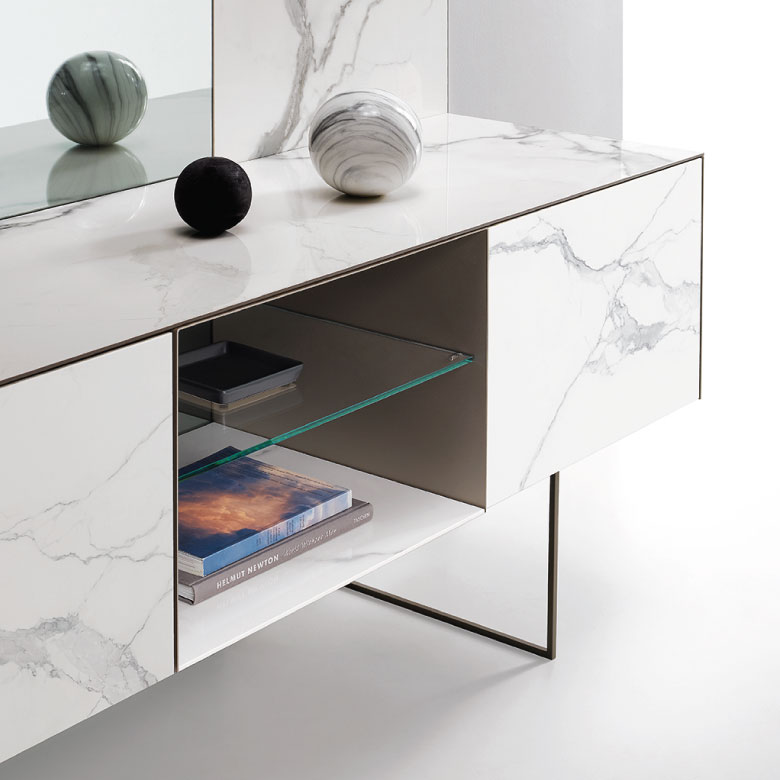Elegante madia con struttura in metallo e ante in ceramica. Può essere utilizzata da sola o in abbinamento ai pannelli Caddy Materika.