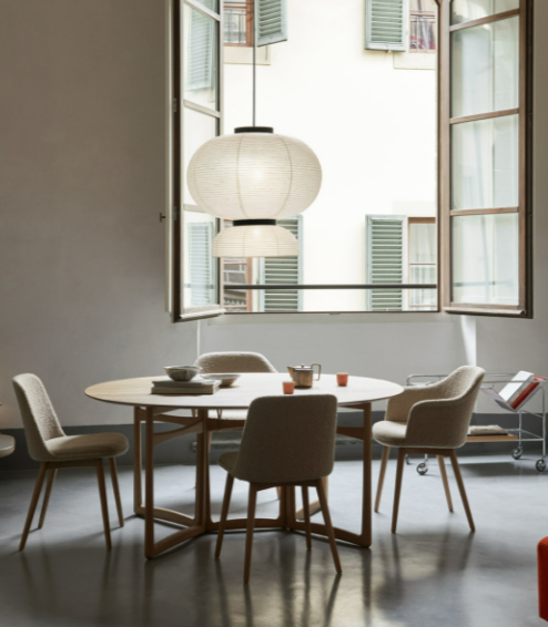 Veneer sheets formpressed together towards a solid wood insert. Milled into shape and lacquered. Natural Rattan weaved around a powder coated stainless steel frame.