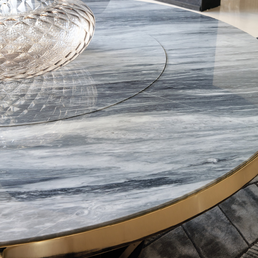 Round table in light gold chrome stainless steel with marble top. Giorgio Collection logo on the metal base.