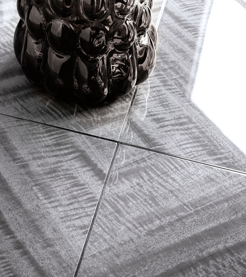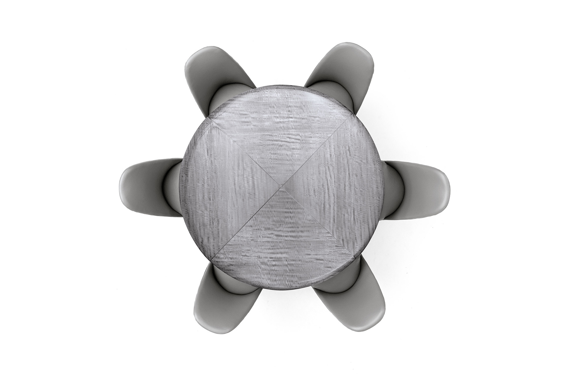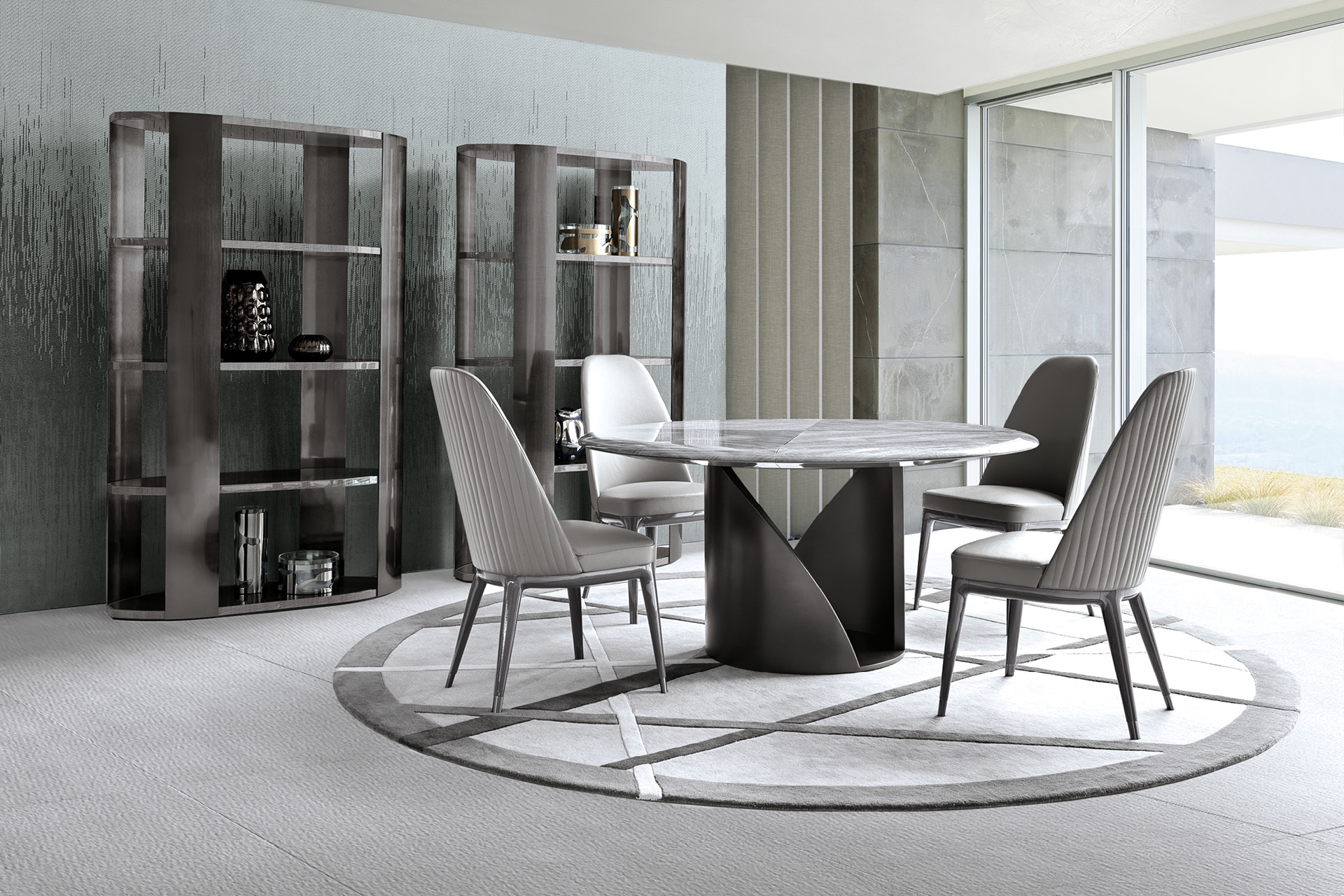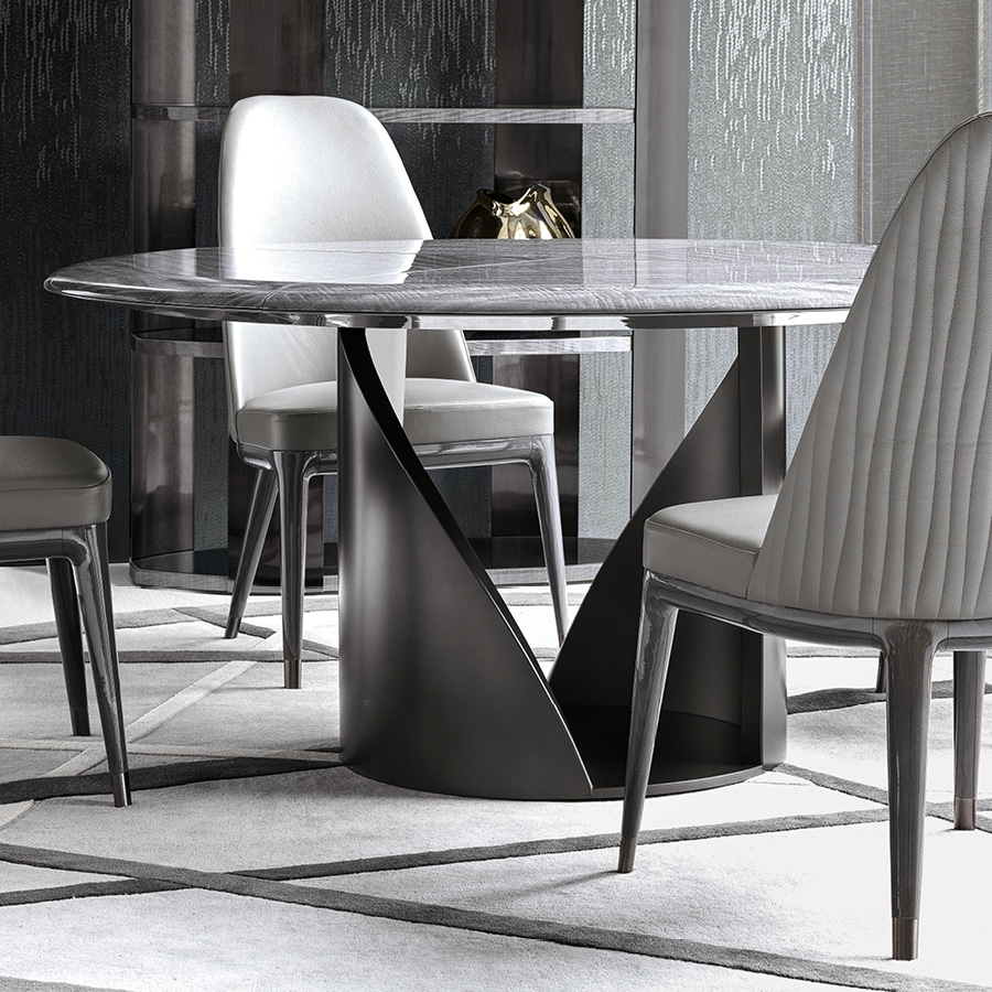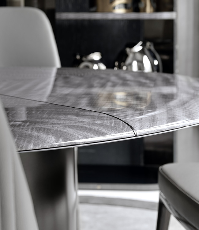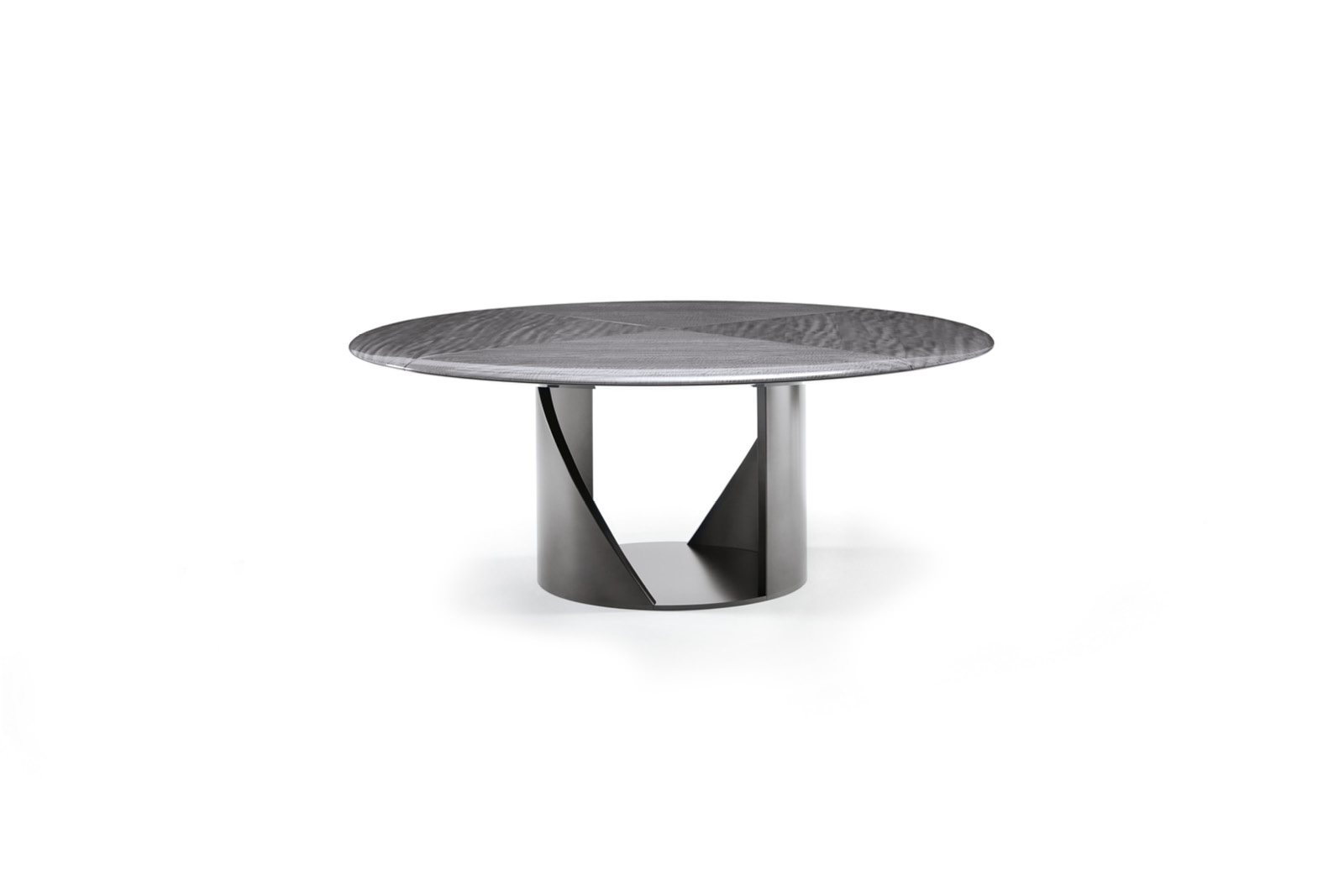 Round table in Madagascar figured sunburst Mowinghi veneer with high gloss polyester finish. Details top and base in satin black nickel stainless steel with lasered Giorgio Collection logo.