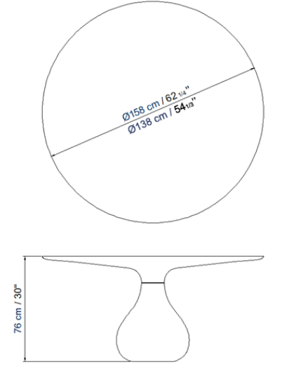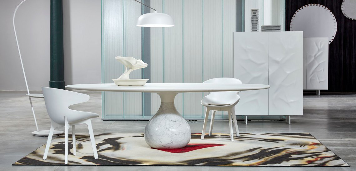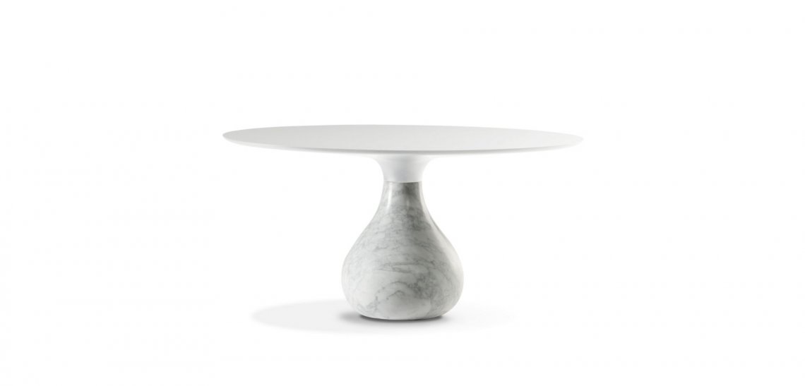 Qui il tavolo da pranzo tondo è declinato in due diametri ed in ovale, la collezione si amplia anche con tavolino e tavolini tondi.