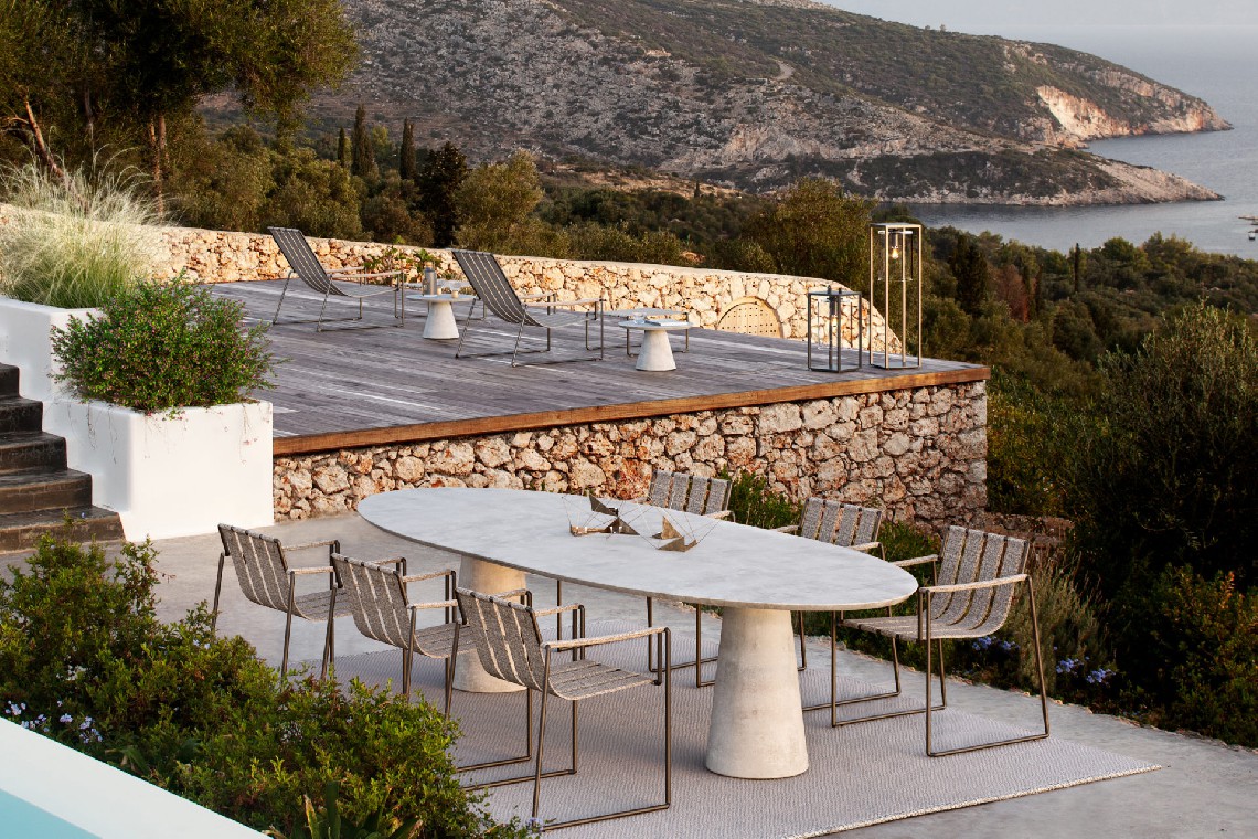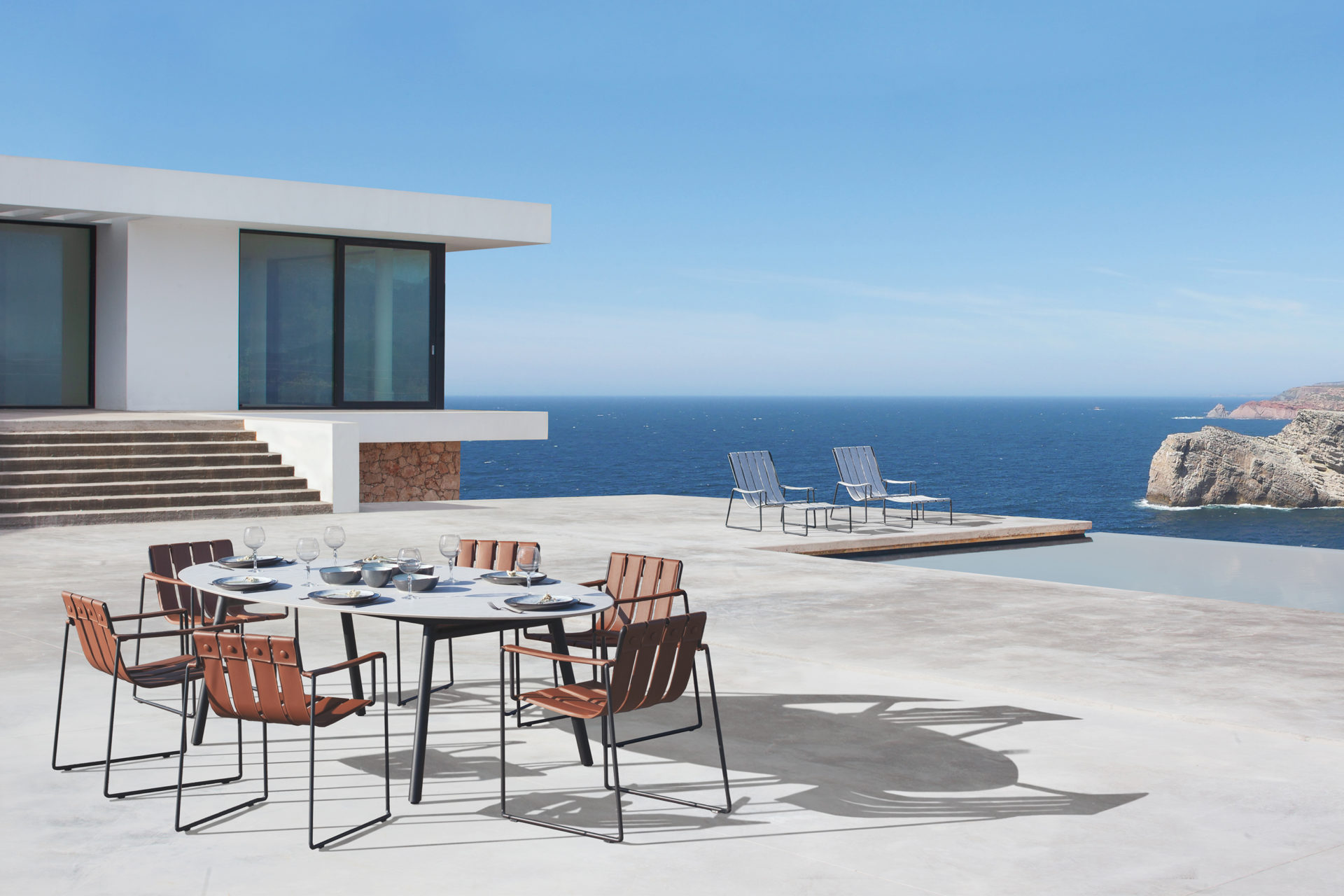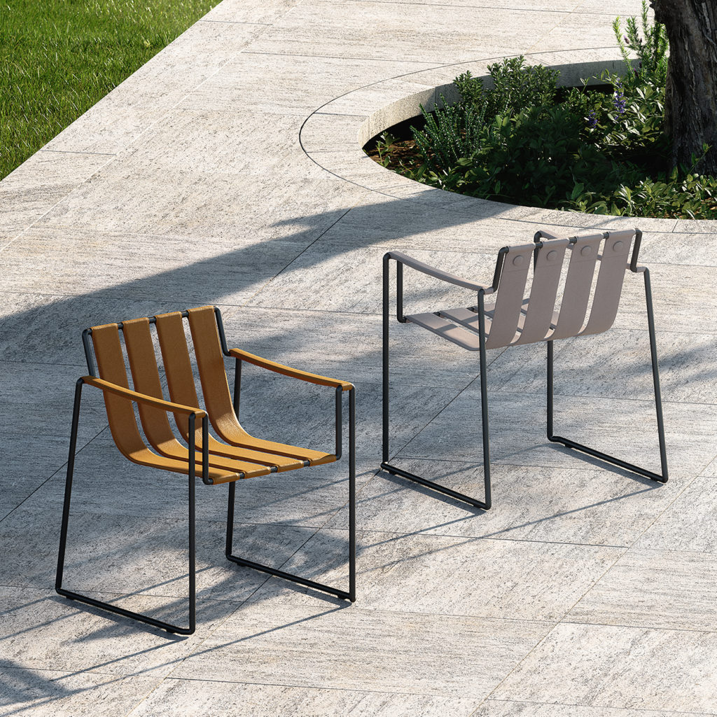 The new and highly original Strappy line features a coated stainless steel structure consisting of one continuous rod running all the way around to form a minimalistic yet functional and stackable framework, to which the padded seat straps and armrests are attached. They appear as if suspended inside this elegant frame. That the front and rear are connected only by soft elements is, however, an optical illusion. What meets the eye is in fact the upholstery, the aluminium straps are nicely hidden inside. Together with the hidden armrest connection they are the backbone of the Strappy. This optical ‘trick’ not only makes it possible to have a very fine and fragile looking framework, but also caters for an even bigger advantage. The upholstery can be removed in no time, for cleaning or winter storage. With an extra set you could even change the look of the Strappy to follow the colours of the season. As if the selection of some 70 different colours and textures for the upholstery fabrics wasn’t enough, we have also added three highly resistant imitation leathers to the list. Dressed in black, cognac, or taupe leather-look fabric, Strappy really stands out from the crowd and blurs the line between indoor and outdoor furniture.