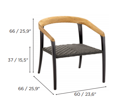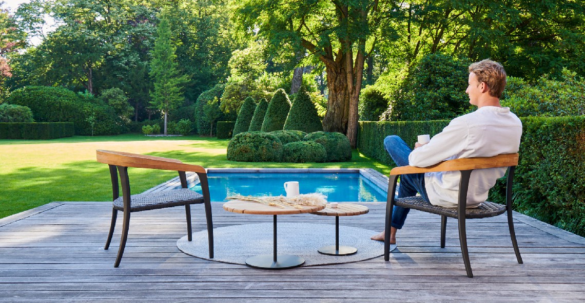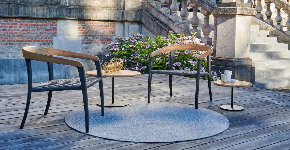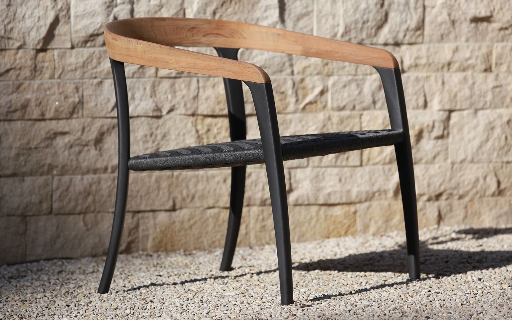 A first one harmoniously combines a teak backrest, a smooth tapered aluminium frame and a woven olefin seat padded with a Quickdry foam, into an inviting chair. With this combination of materials Jive blends perfectly into a more sleek contemporary setting, as well as a more classical environment.