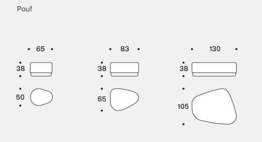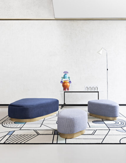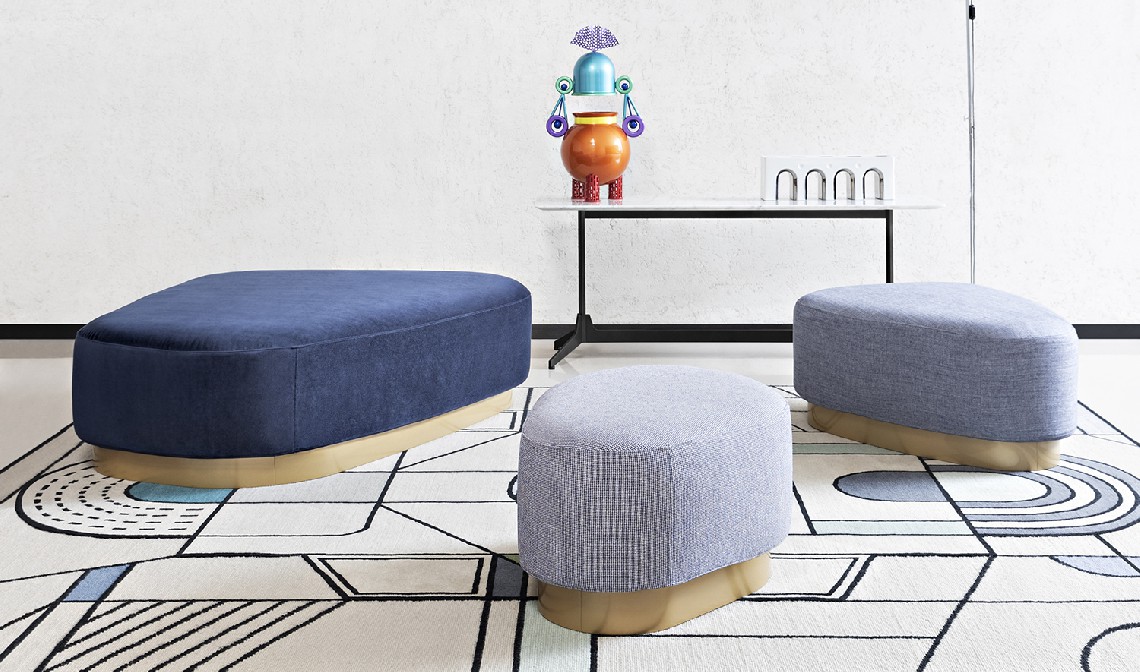 Island is a collection made up of three poufs with organic forms that evoke the coast line lapped by the sea. This imagery is felt throughout the entire design, conjuring the enveloping movement of the tide which softens and shapes the shore. For this reason, the volumes are perceived differently depending on the perspective from which they are observed in a space. The base visually elevates the seat from the ground making it seem like it’s floating in space.
