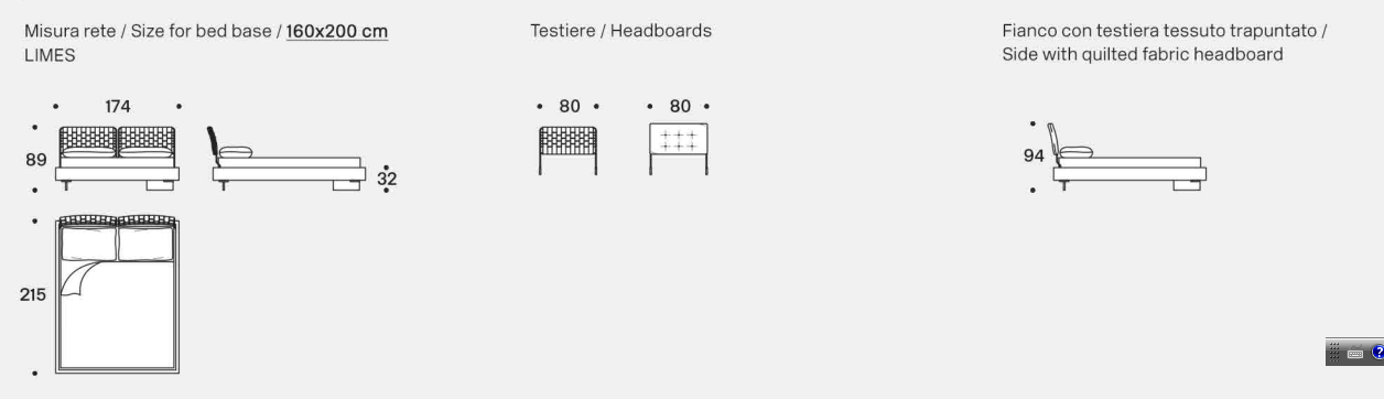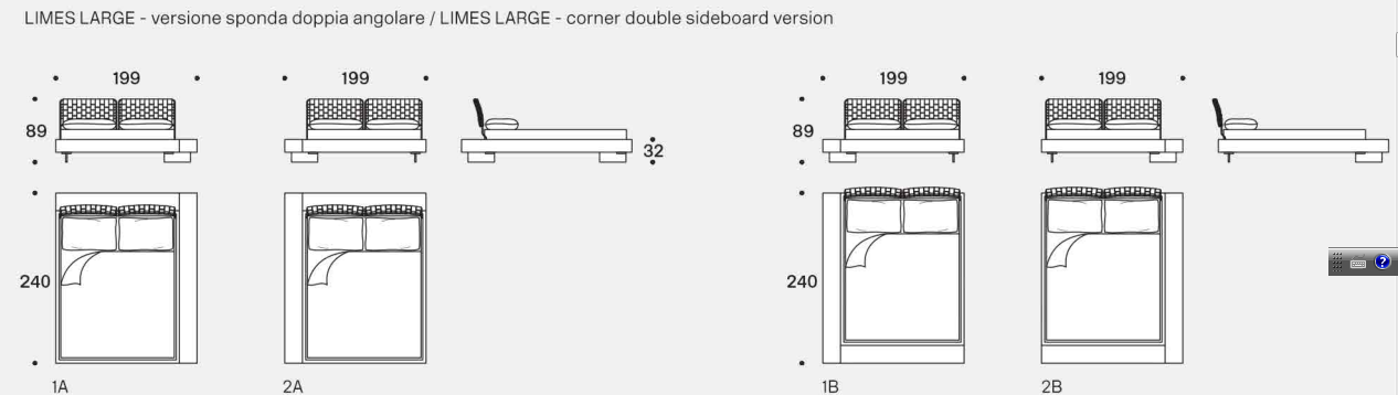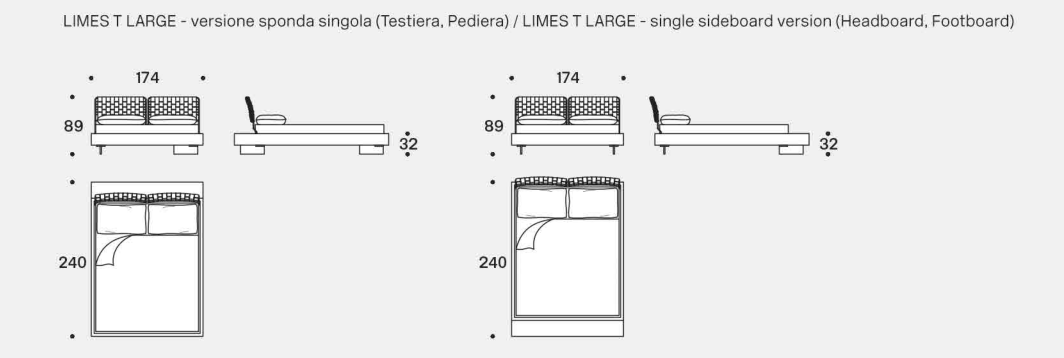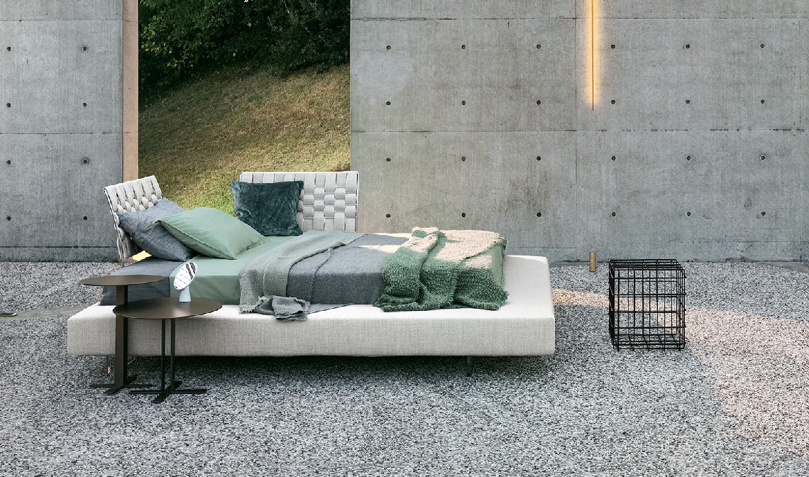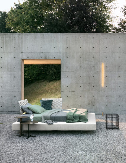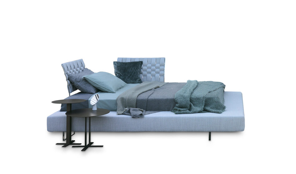 Limes Large is the most generous option within the Limes collection, thanks to the two wider sides that allow for a functional and unusual support. The rectangular feet in transparent methacrylate onto which the base is rested, make the bed appear to float.