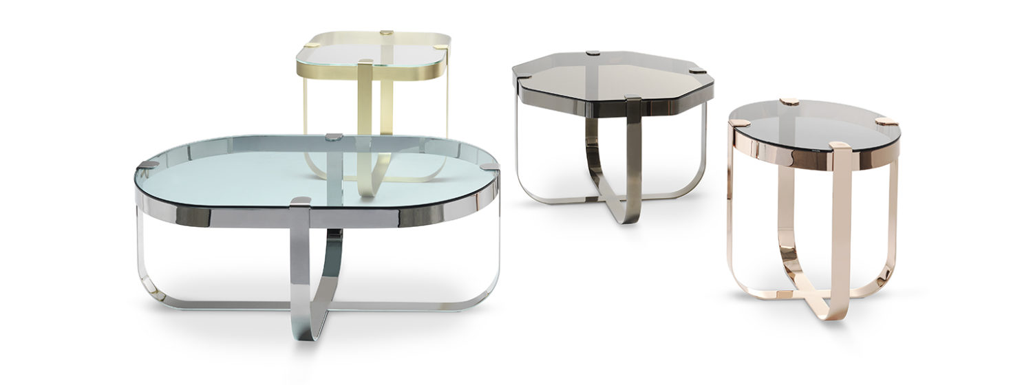 Elegant like jewellery, the Ring coffee tables are inspired by raw cuts of precious stones prior to being mounted into rings. The choice of materials is aimed to emphasise this inspiration behind the collection. The metal base structures are available in several variants each of which corresponds to a geometric form. Like in jewellery design, the glass tops in transparent or light colours are literally set onto the base structures.