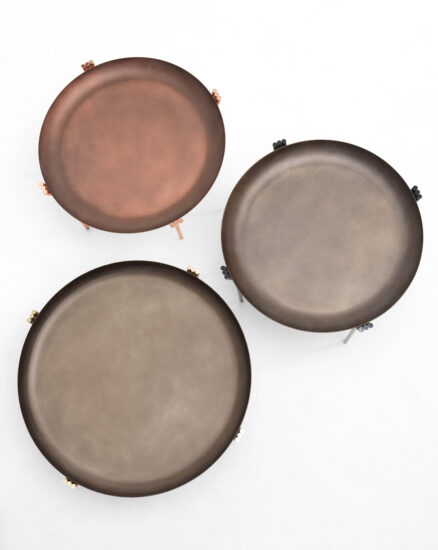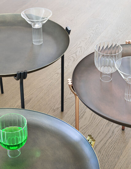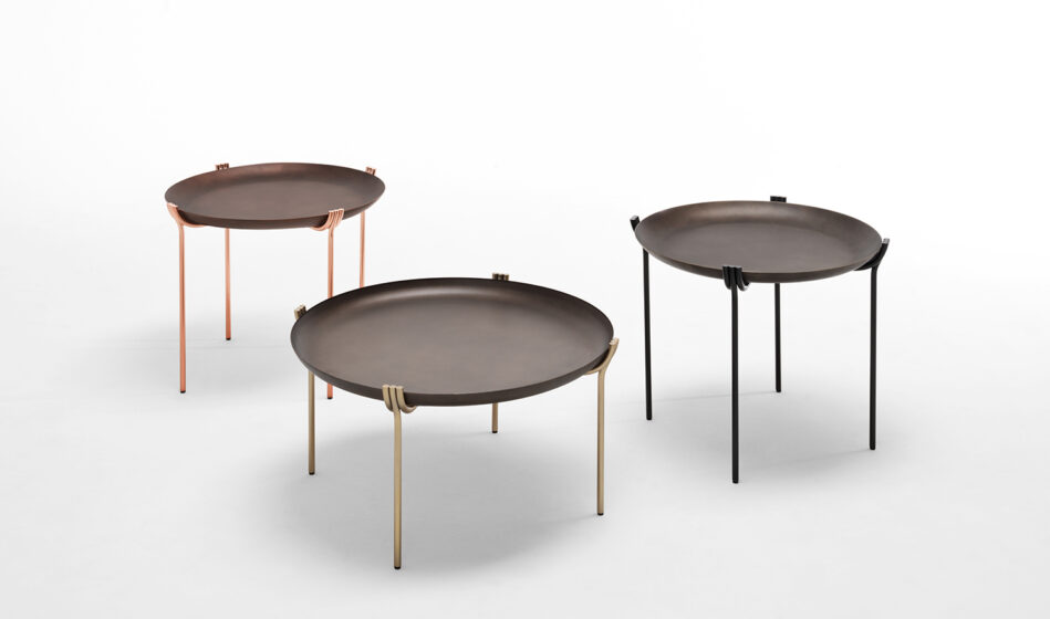 The seating Geo collection welcomes a new element: a versatile small table with a nomadic allure that proposes again the characteristic base in three shades, black chrome, satin brass and glossy copper. The tables have the peculiarity of having a mobile top, allowing it to become a tray if needed. Perfectly matched to the Geo armchair and small sofa, but also to the rest of the Saba collection. Available in two sizes.