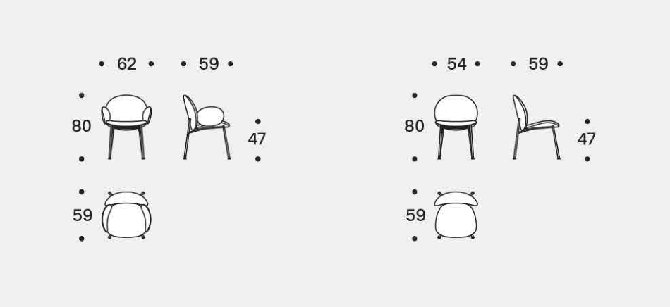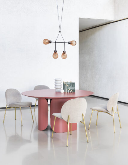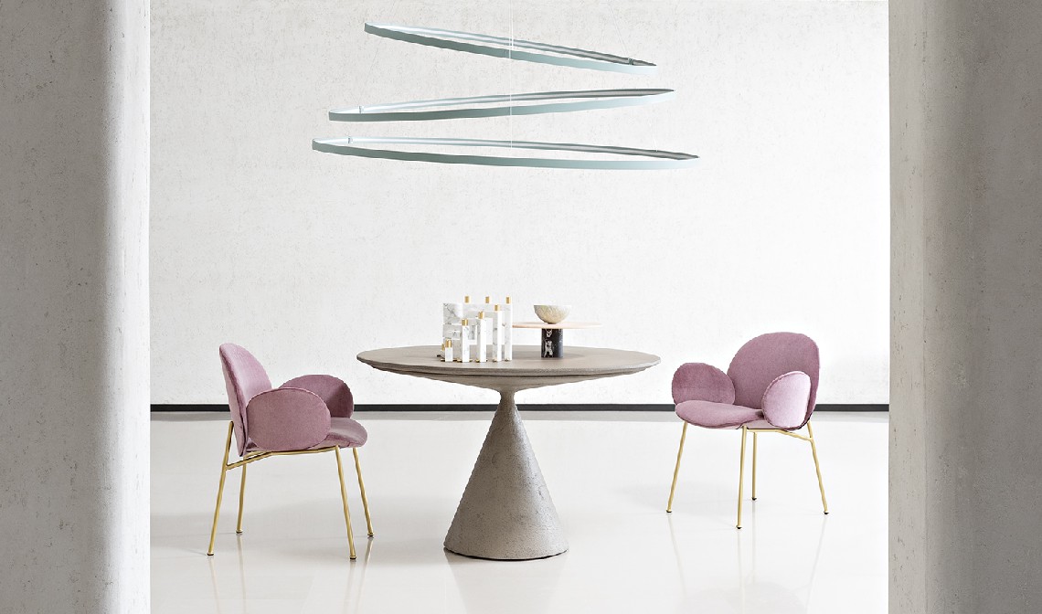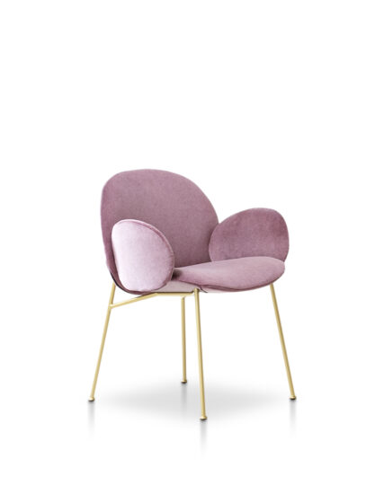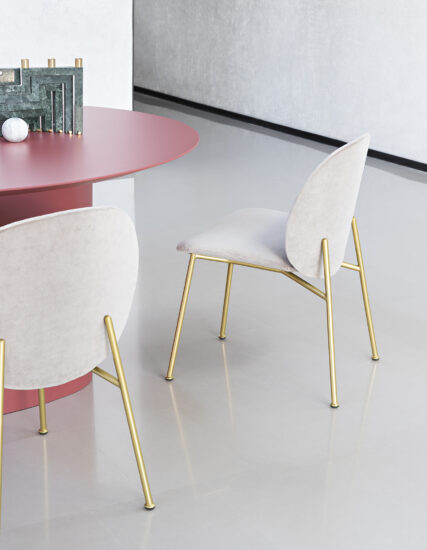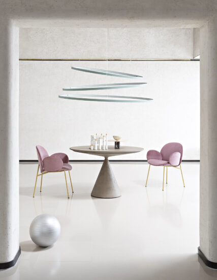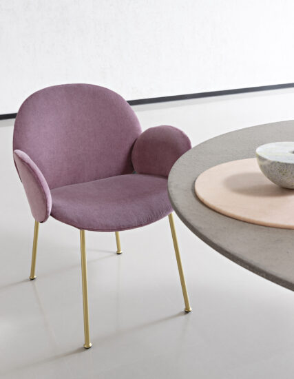 The Ola family extends to the dining room: Ola chair originates from the same concept of curved sheets, each converging towards a single center point. Four sheets become two sheets for the variation without armrests. The metal frame has an essential and graphic silhouette, in contrast with the padded and rounded form. Fully removable covers.