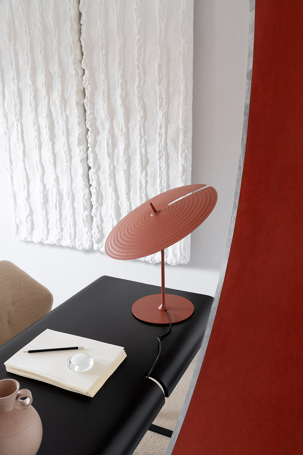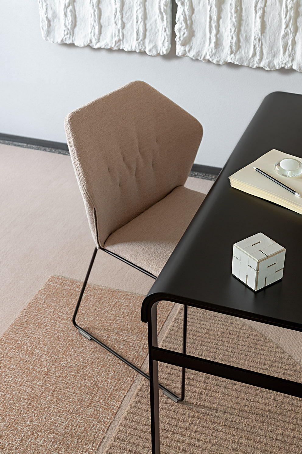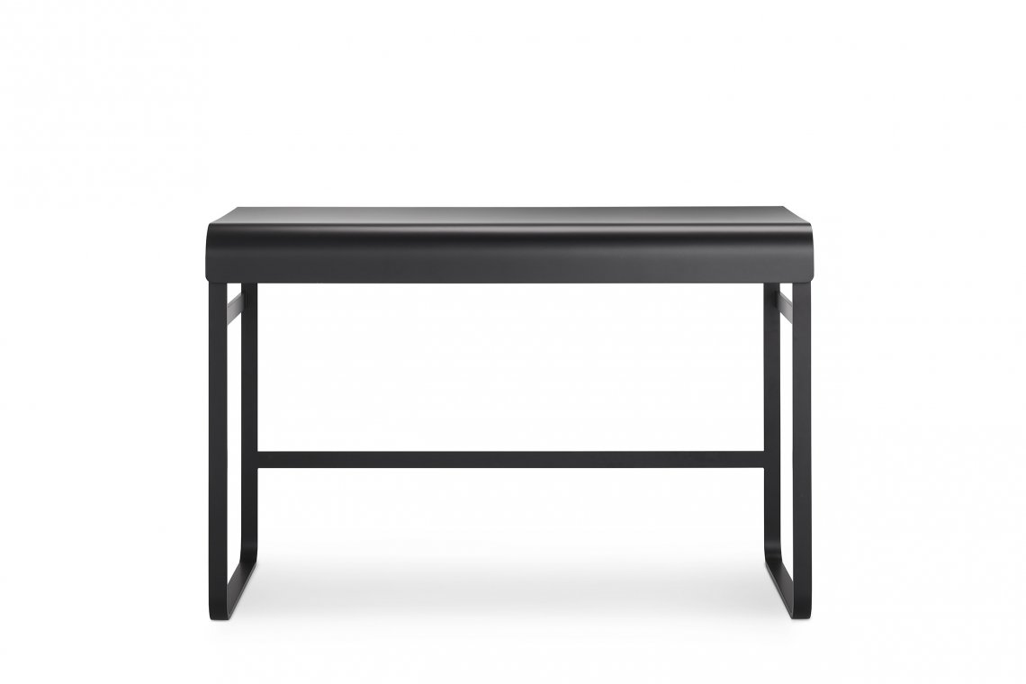The varnished iron structure that unrolls like a ribbon, the curved top in lacquered wood and the details for the support of technology are interpreted with simple, almost hidden, identifying signs.