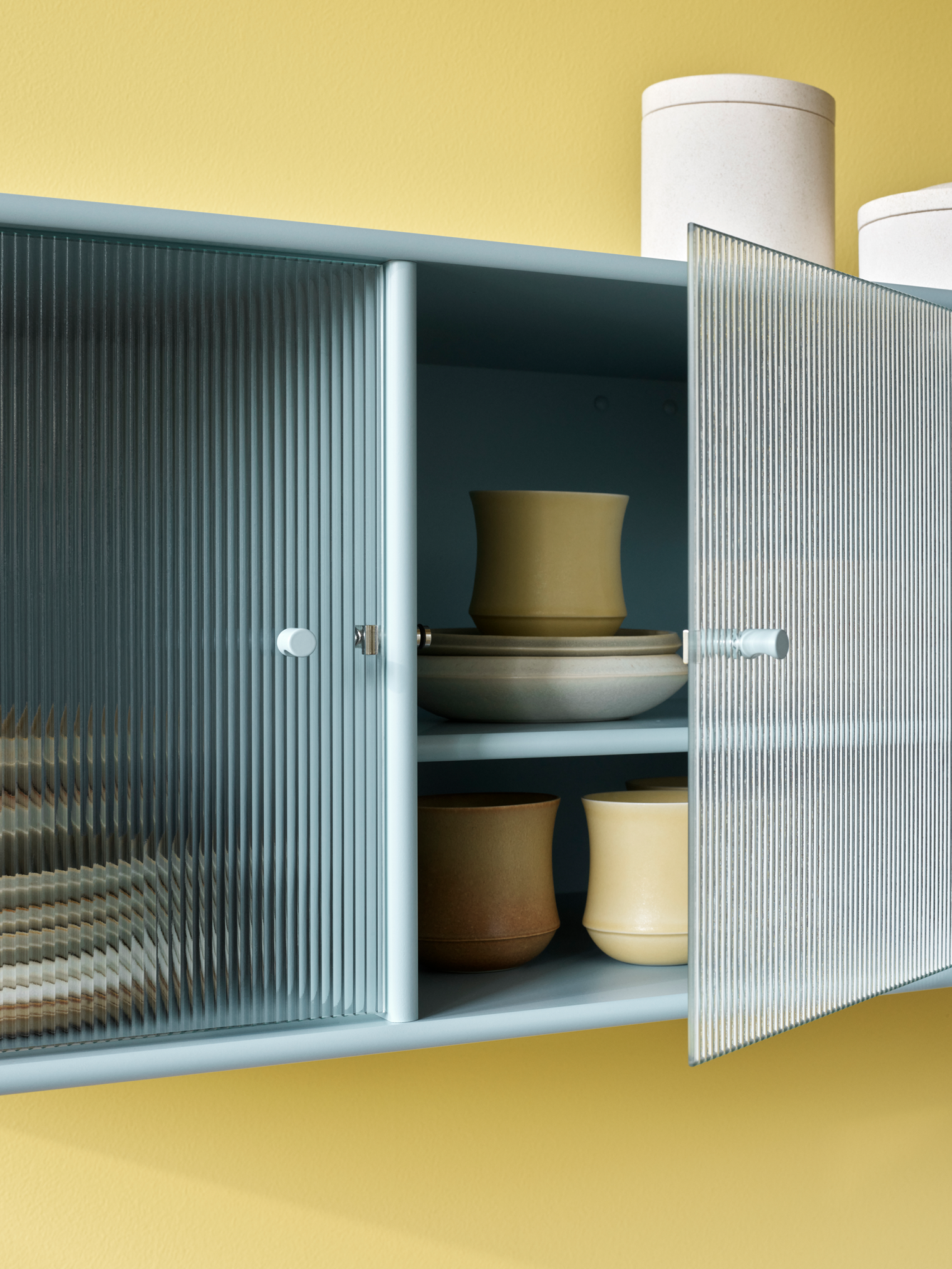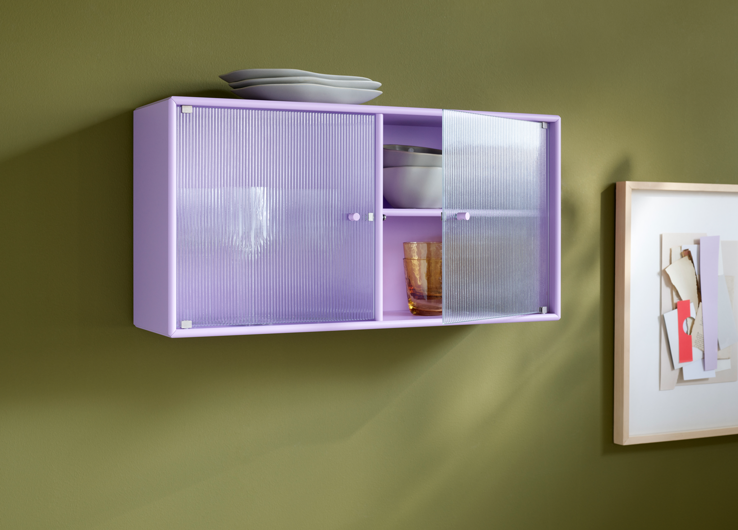 RIPPLE I 是一款壁掛式玻璃柜,有 2 個(gè)波紋玻璃門(mén)。該柜子可以用作廚房的上柜,用作浴室的小裝飾柜,或者用作客廳或餐廳的展示架。該柜子有 1 個(gè)帶托架的可移動(dòng)擱板,可根據(jù)需要輕松布置和重新布置擱板。它有 41 種顏色,手柄采用與柜子顏色相同的粉末涂層。