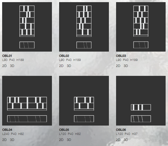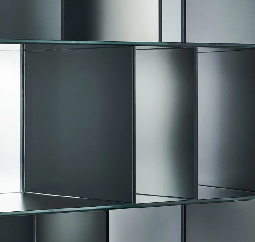 Serie di mobili contenitori a giorno in cristallo stratificato 5+5 mm, molato filo lucido e termosaldato a 45°. La superficie esterna presenta una speciale finitura a specchio, mentre la superficie interna è in specchio opacizzato, che riflette le immagini in maniera sfuocata ed indefinita.