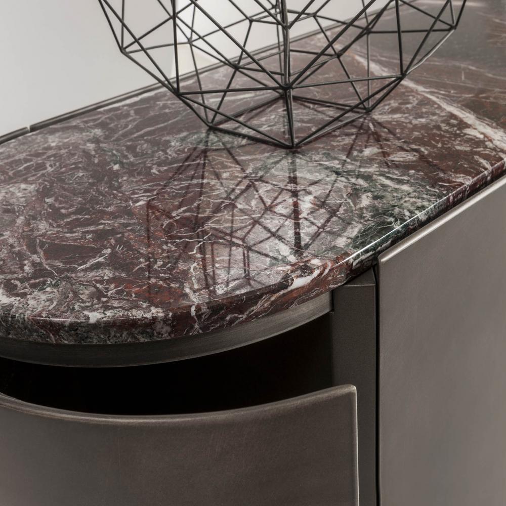 Wooden low cabinet with metal legs, marble top, 7 hinged doors and curved sides. Equipped with internal shelves.