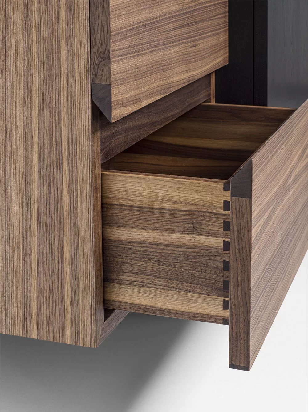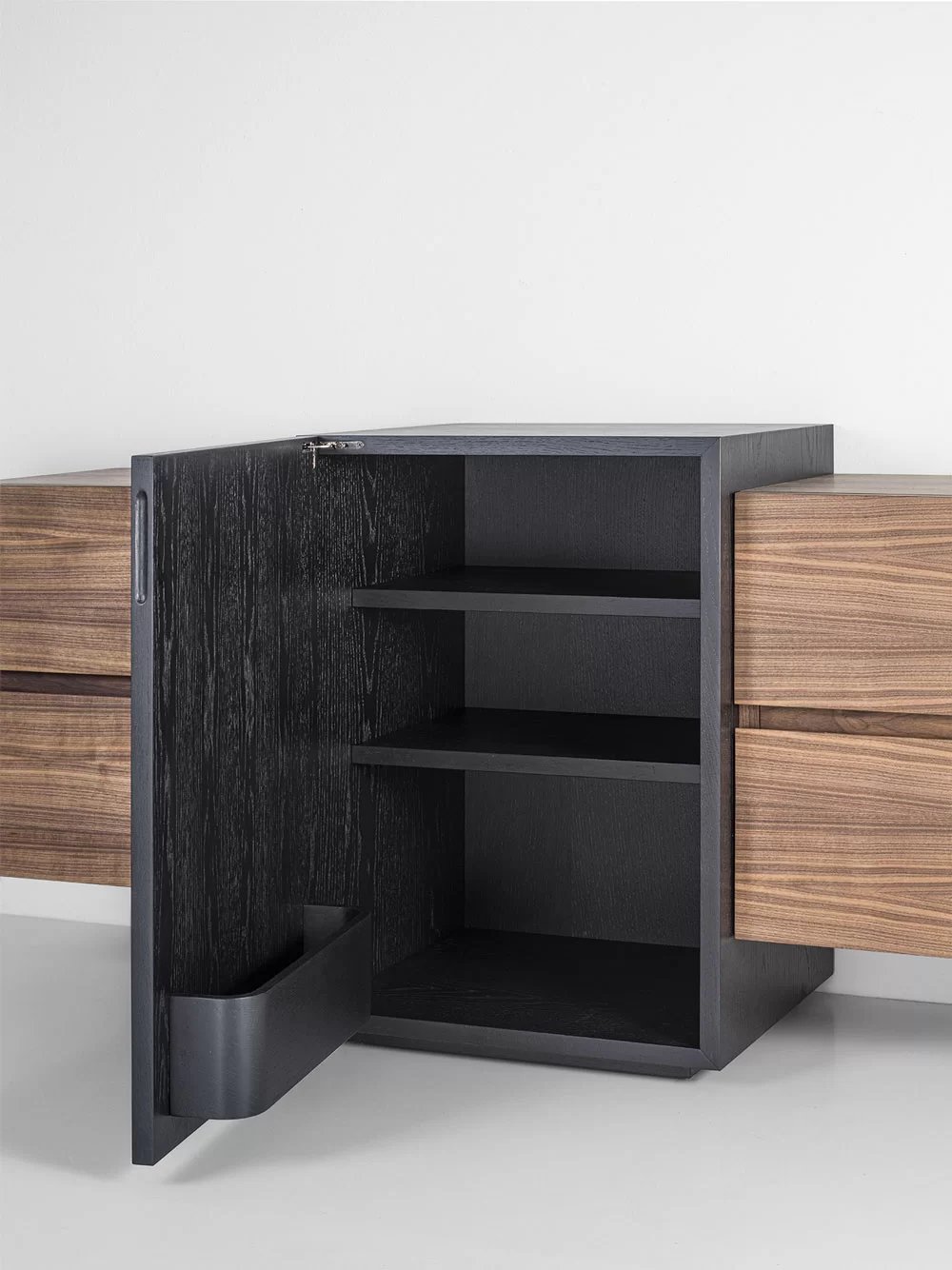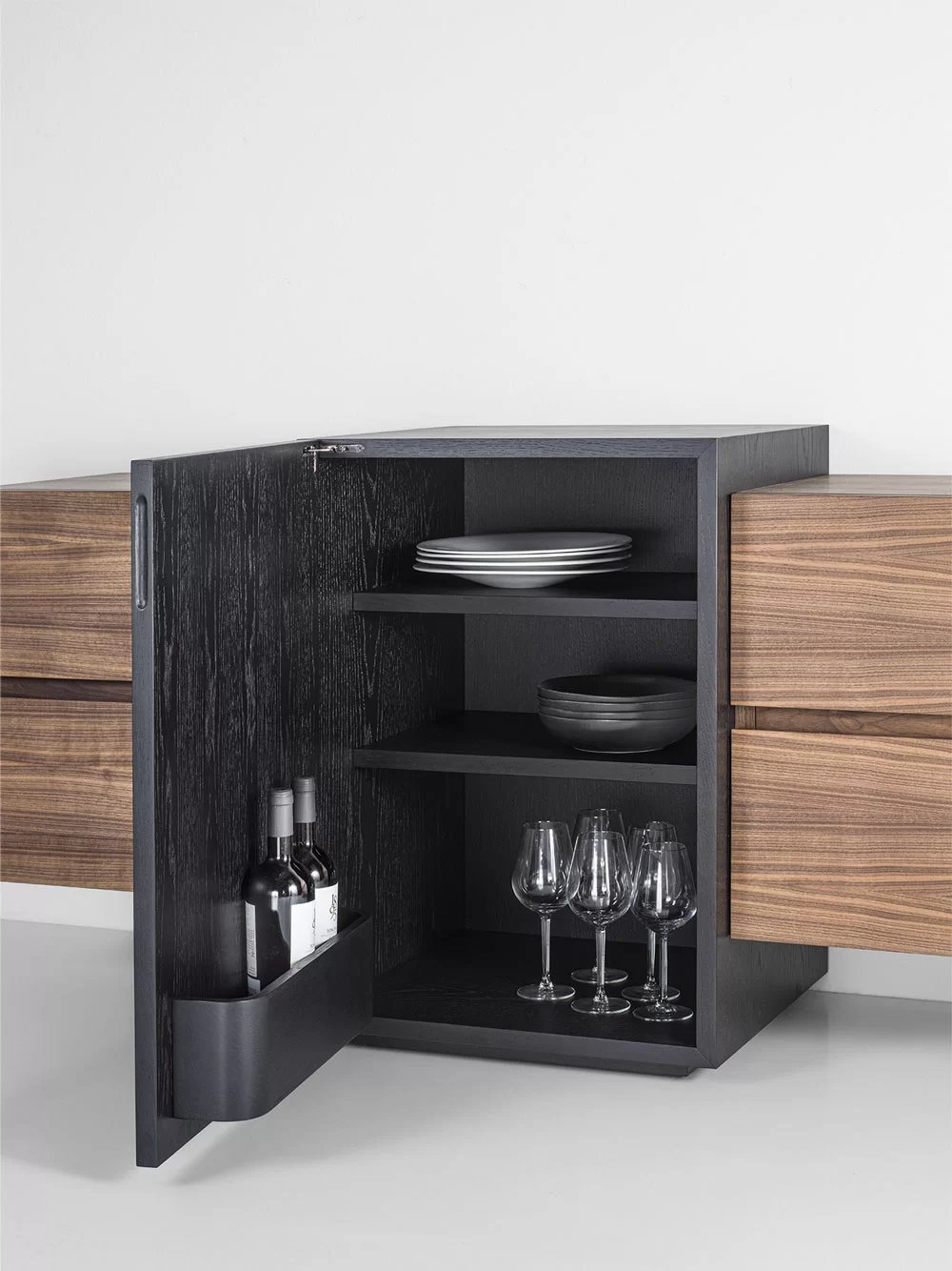 Credenza in legno massello e listellare composta da tre moduli. Il modulo centrale con all’interno due ripiani, è caratterizzato da un’anta contenitiva, con portabottiglie in massello, e sistema di chiusura ammortizzato. I moduli laterali, sospesi, sono costituiti da cassetti con tradizionale incastro a coda di rondine e maniglia fresata.